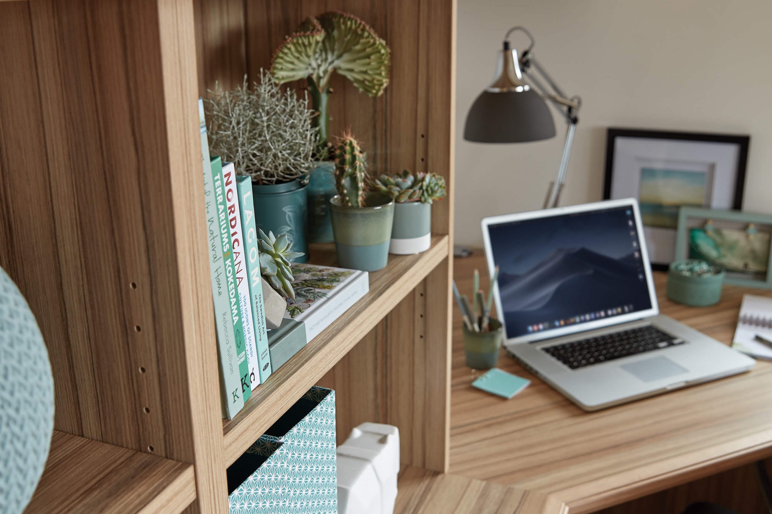 “Work essentials should be hidden away in files & boxes kept in the work zone. A single floating wall shelf is useful directly above your desk for easy access. Coffee tables and console tables with drawers beneath are useful storage pieces that leave the top available for lovely books & decorative pieces.”