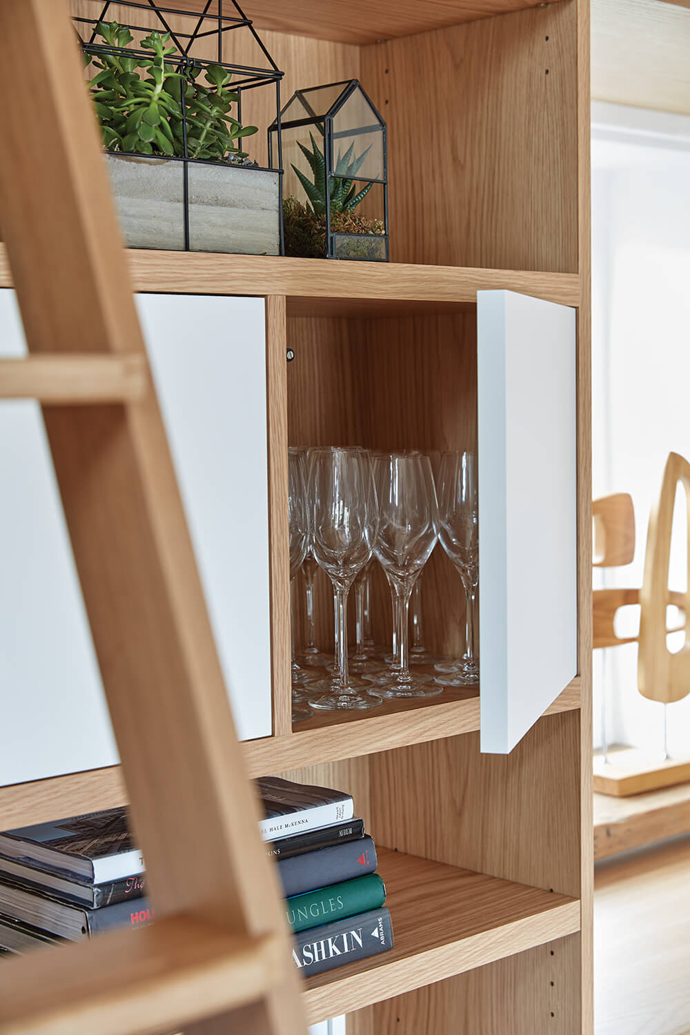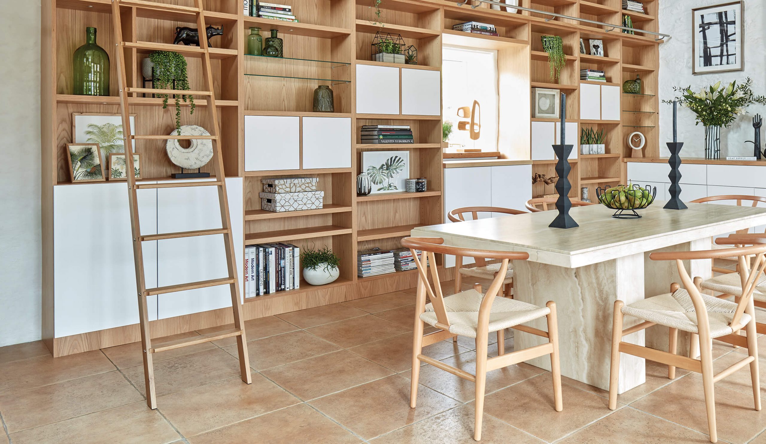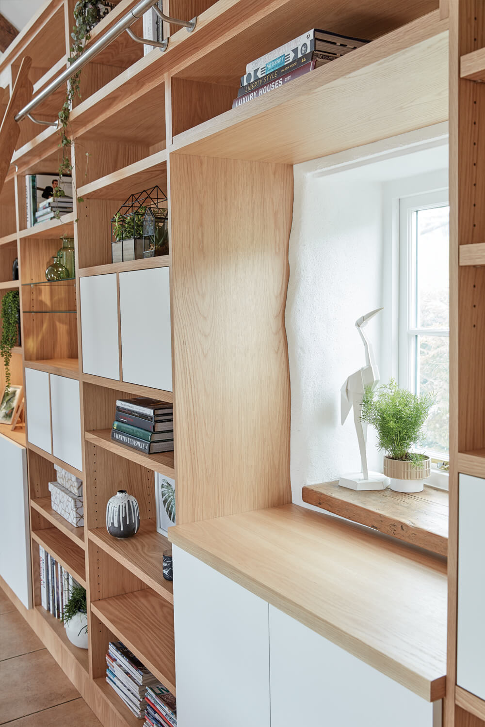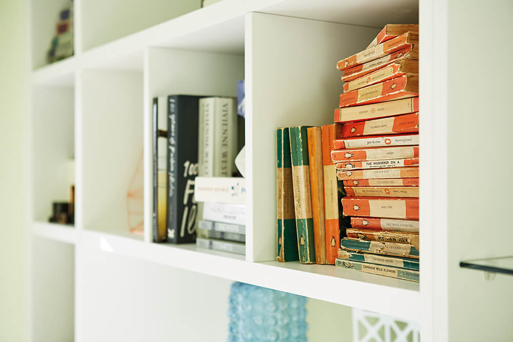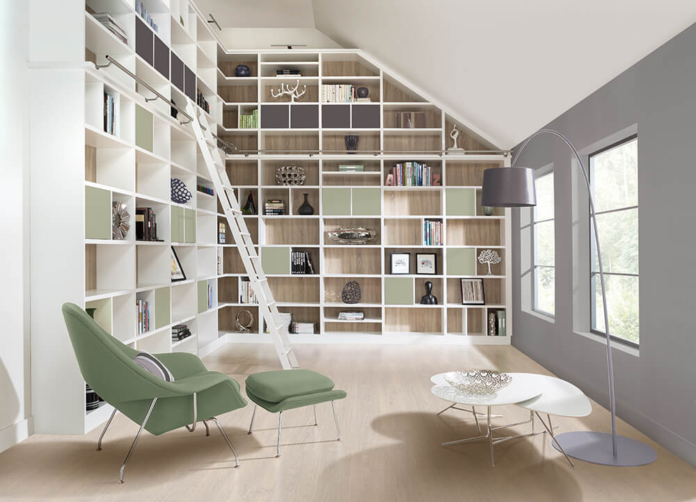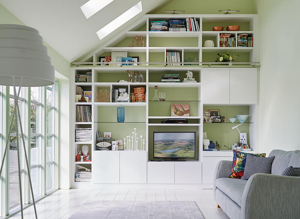 Our modern white library design oozes sanctuary-like vibes. Its neutral colour palette with contrasting shades of green creates interest whilst still feeling calm. When using whites and lighter colours, we always suggest using shades with warmth to create a more inviting homely feel. Bright whites and cooler tones can feel sterile and unwelcoming. When trying to promote positivity in any space, especially when thinking about in-home escapism, you need elements of comfort and personality. The open shelving combined with clusters of closed storage allows you to go clutter-free, while still displaying memories and treasured pieces.
