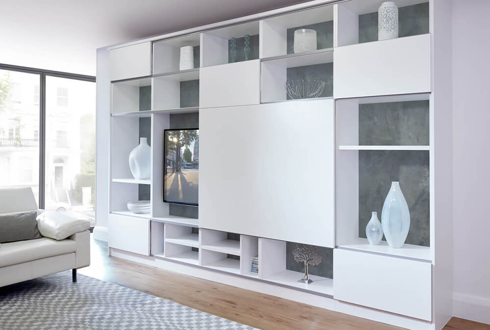 Our popular Levigo range is an excellent solution for all areas of the home, whether that’s a lounge, snug, gym or loft. With the addition of a Parroso Pewter feature back panel, this design is not only practical but incredibly stylish too. The juxtaposition of a concrete style finish with a neutral paint colour, and integrated lights can create an instantly inviting backdrop.