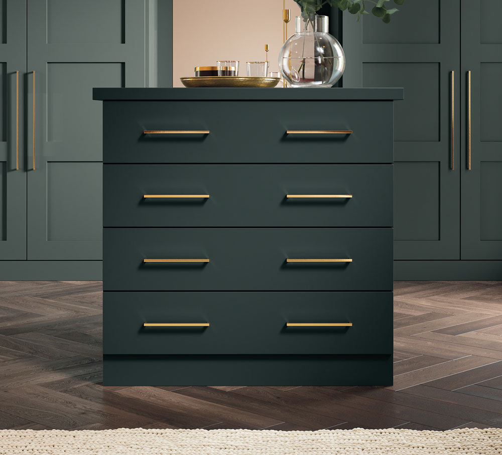As well as providing unique and bespoke storage options for every item in your wardrobe from evening gowns to work-out gear; scarves and ties to cosmetics and cases, the Wentworth dressing room ‘wows’ in its luxurious green-painted finish.