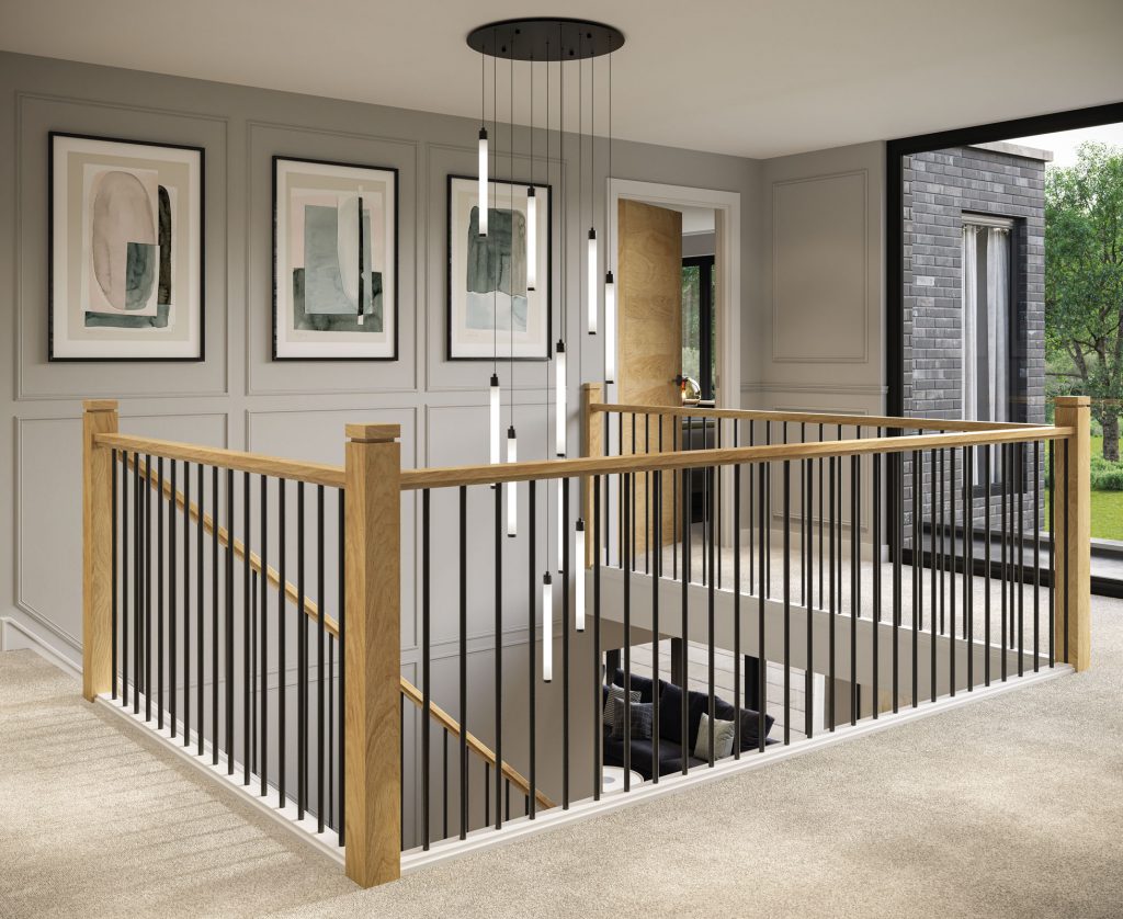 The exclusive Vienna Spindles, finished in Powder Coated Matt Black, introduce a striking contrast to the staircase, blending modern flair with its classic oak design. Complementing this bold feature are the Natural Oak treads, which harmonise flawlessly with risers painted in Orchid. This carefully chosen colour scheme creates a captivating focal point in the home.