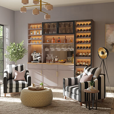 This bespoke home bar pairs the refined structure of Taranto glass doors with the simplicity of Ashbury cabinetry.