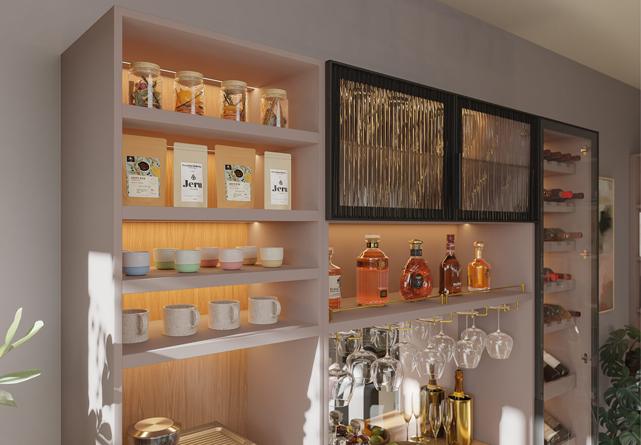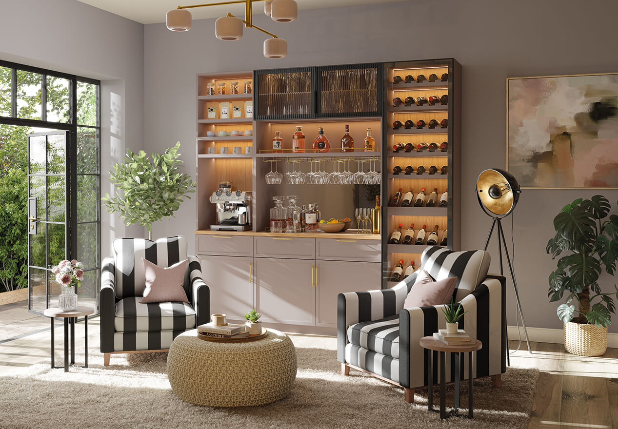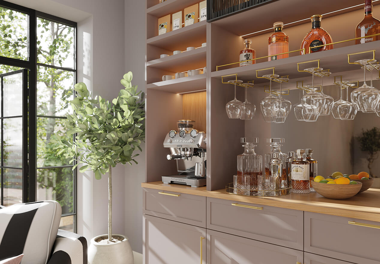 This bespoke home bar pairs the refined structure of Taranto glass doors with the simplicity of Ashbury cabinetry. Designed around how you use the space, it supports both everyday rituals and more social moments, from a morning coffee to an evening drink, without ever feeling overworked.