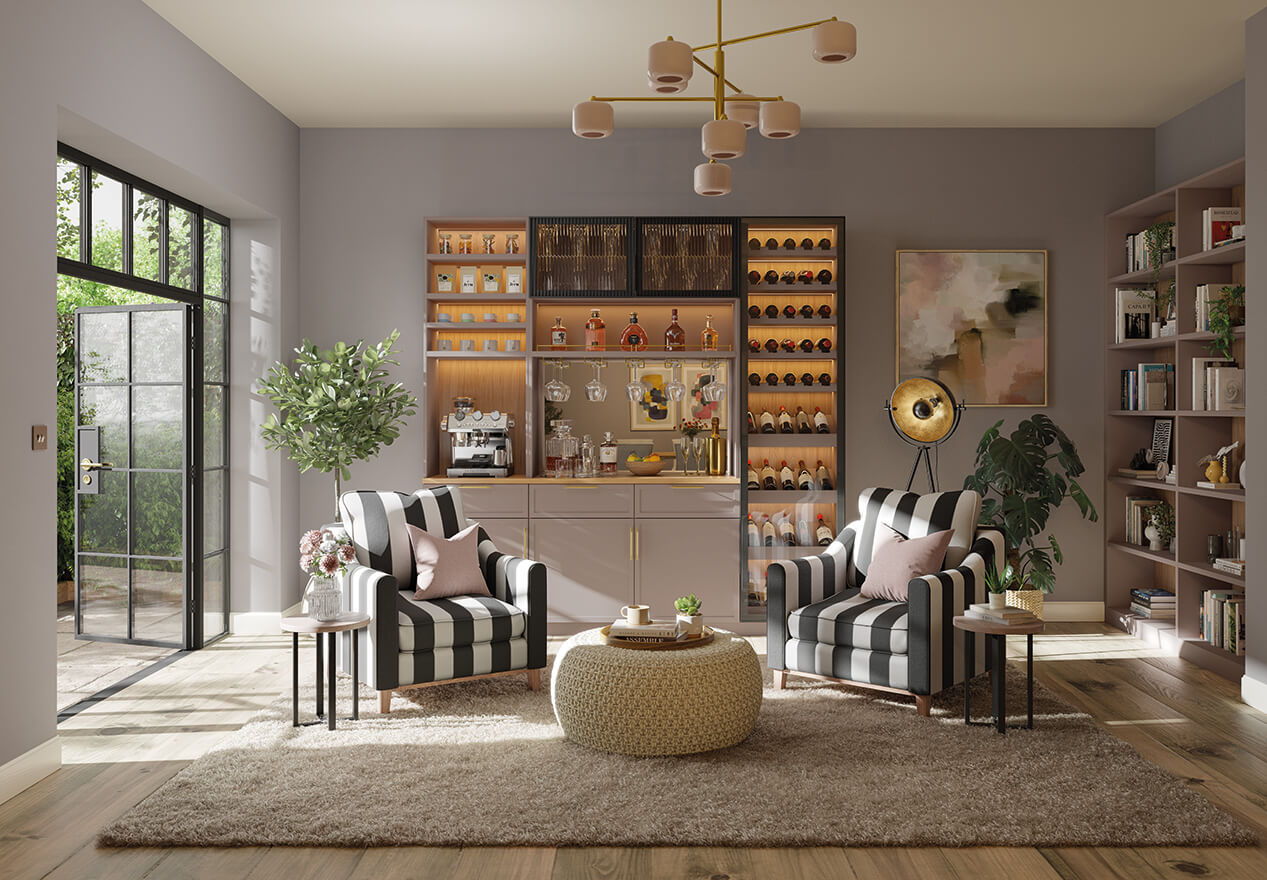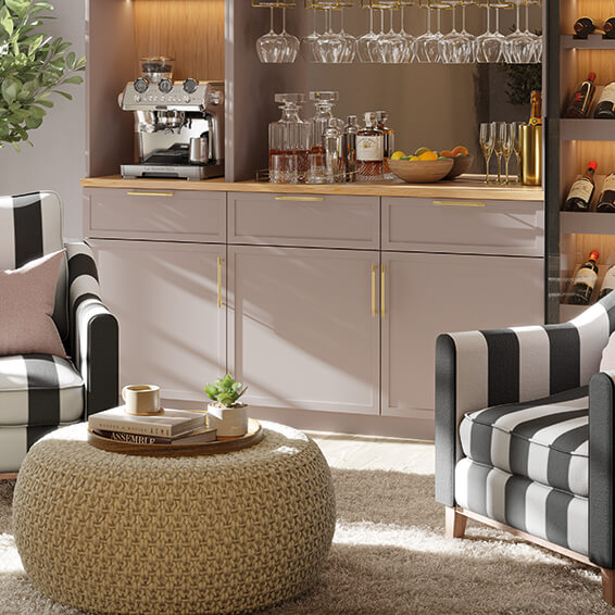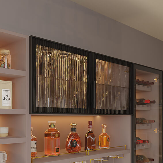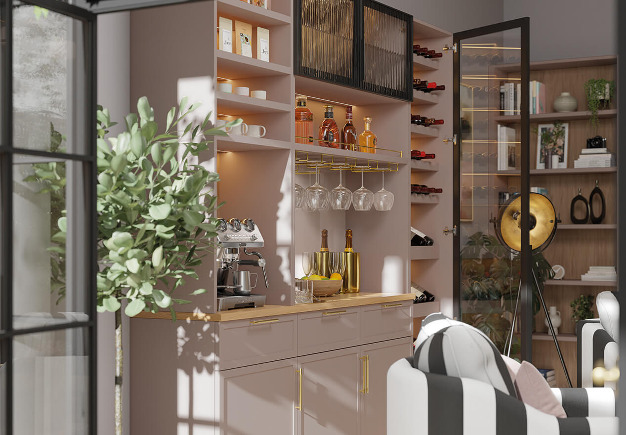 This bespoke home bar pairs the refined structure of Taranto glass doors with the simplicity of Ashbury cabinetry. Designed around how you use the space, it supports both everyday rituals and more social moments, from a morning coffee to an evening drink, without ever feeling overworked.