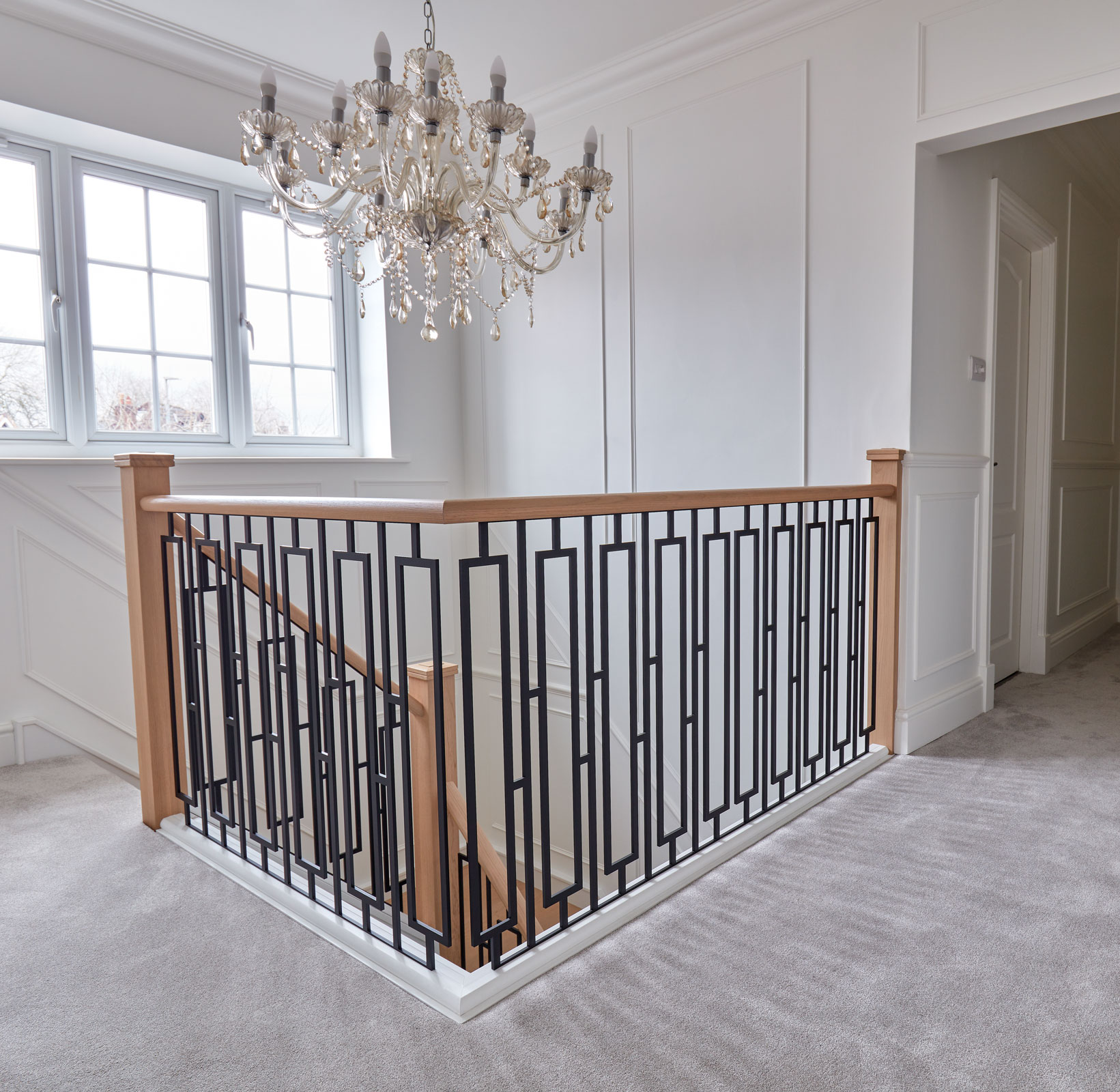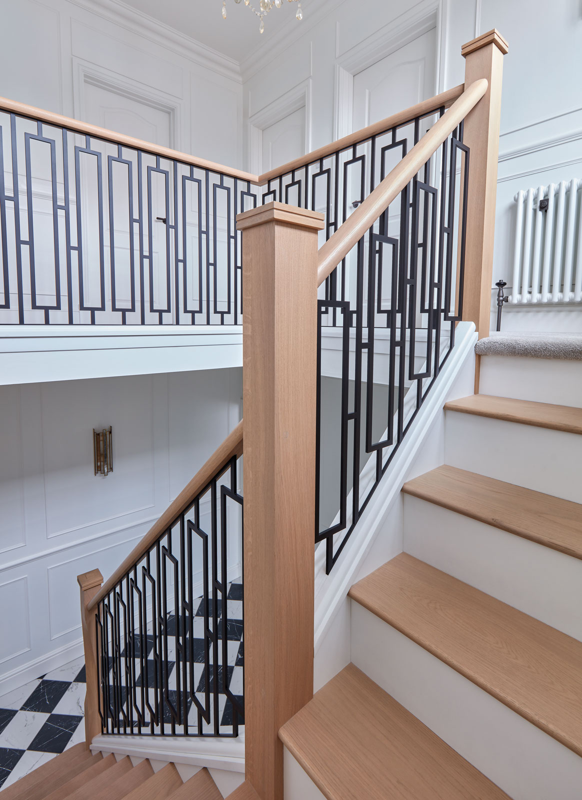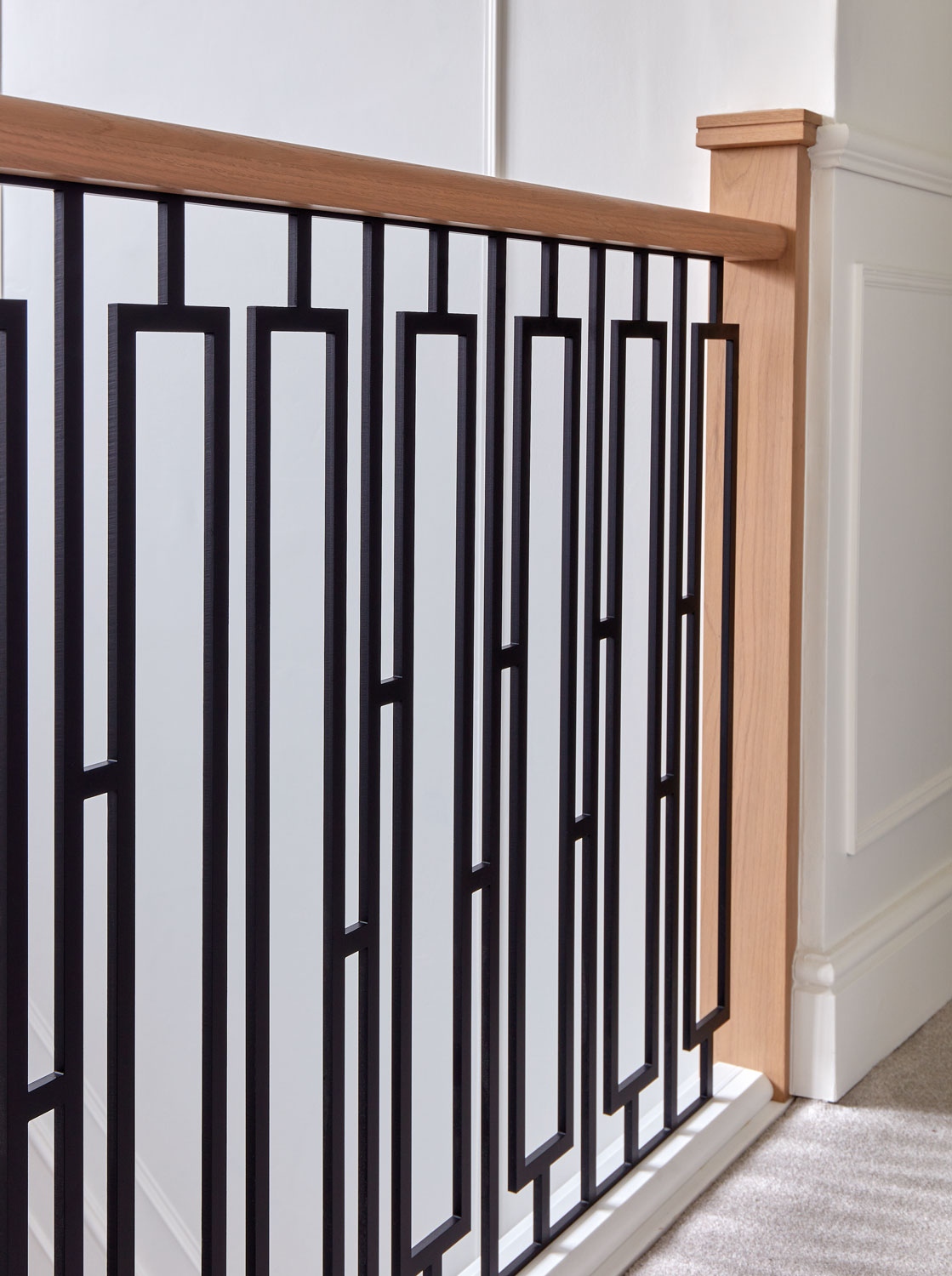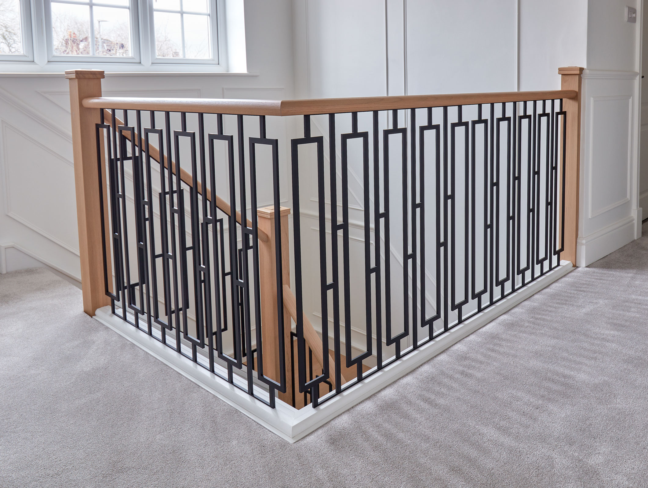 This bespoke metal staircase features our exclusive balustrade design, Basso. The intrinsic and elegant pattern flows up the stairway of the home to create a stunning focal point within the hallway. Our expert designers have paired the matte black steel design with white painted risers and finished with Natural Oak treads, to create a minimalistic aesthetic with a dramatic twist.