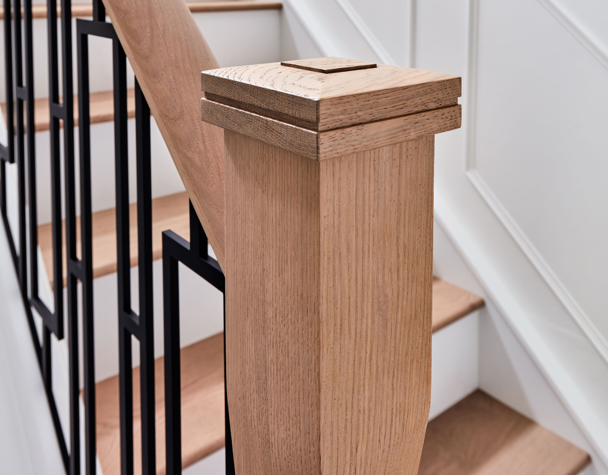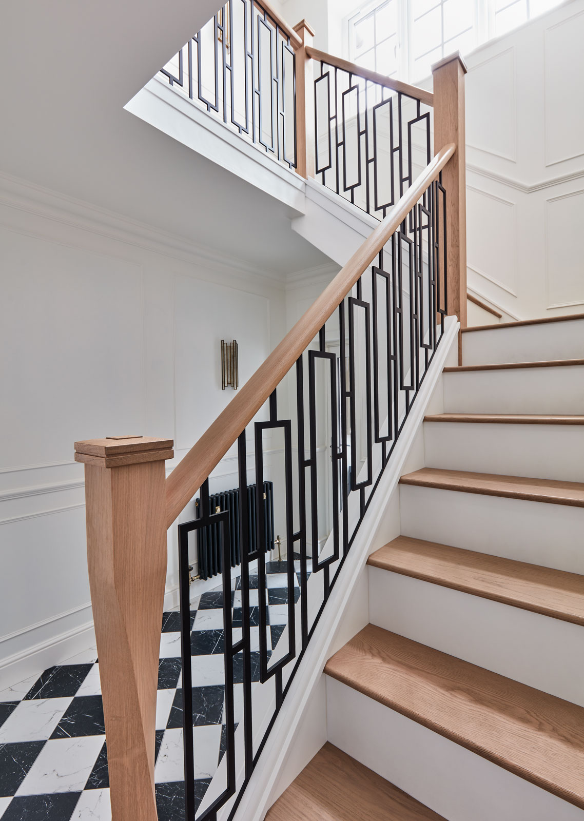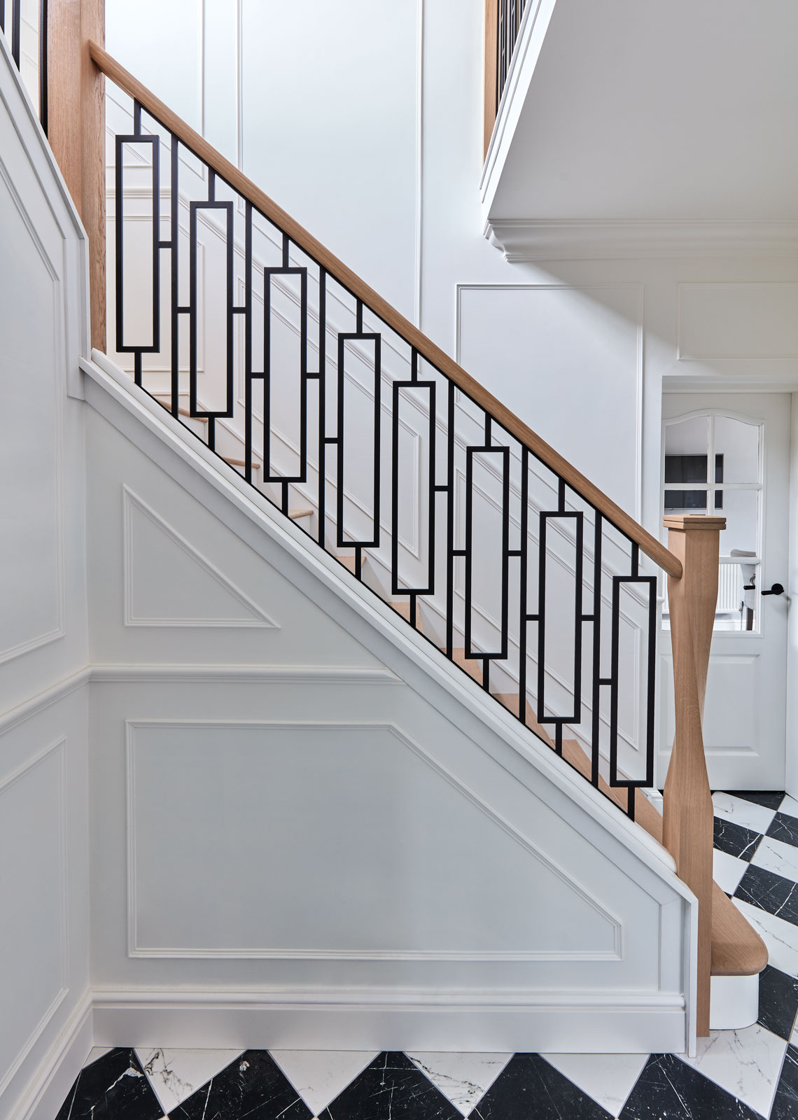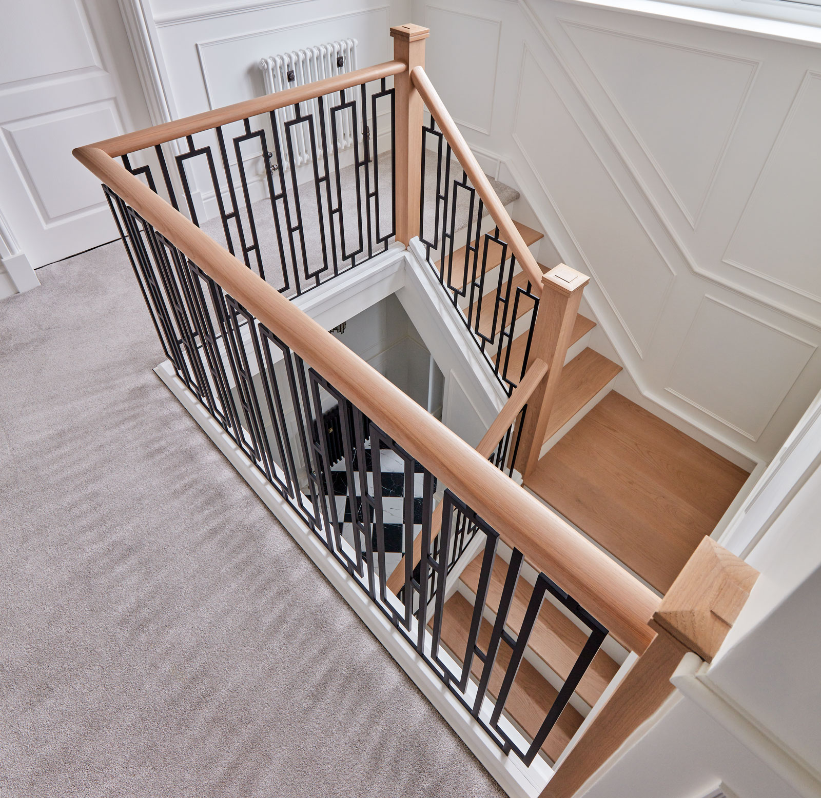 This bespoke metal staircase features our exclusive balustrade design, Basso. The intrinsic and elegant pattern flows up the stairway of the home to create a stunning focal point within the hallway. Our expert designers have paired the matte black steel design with white painted risers and finished with Natural Oak treads, to create a minimalistic aesthetic with a dramatic twist.