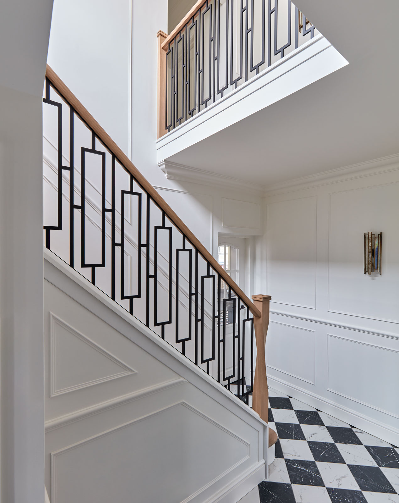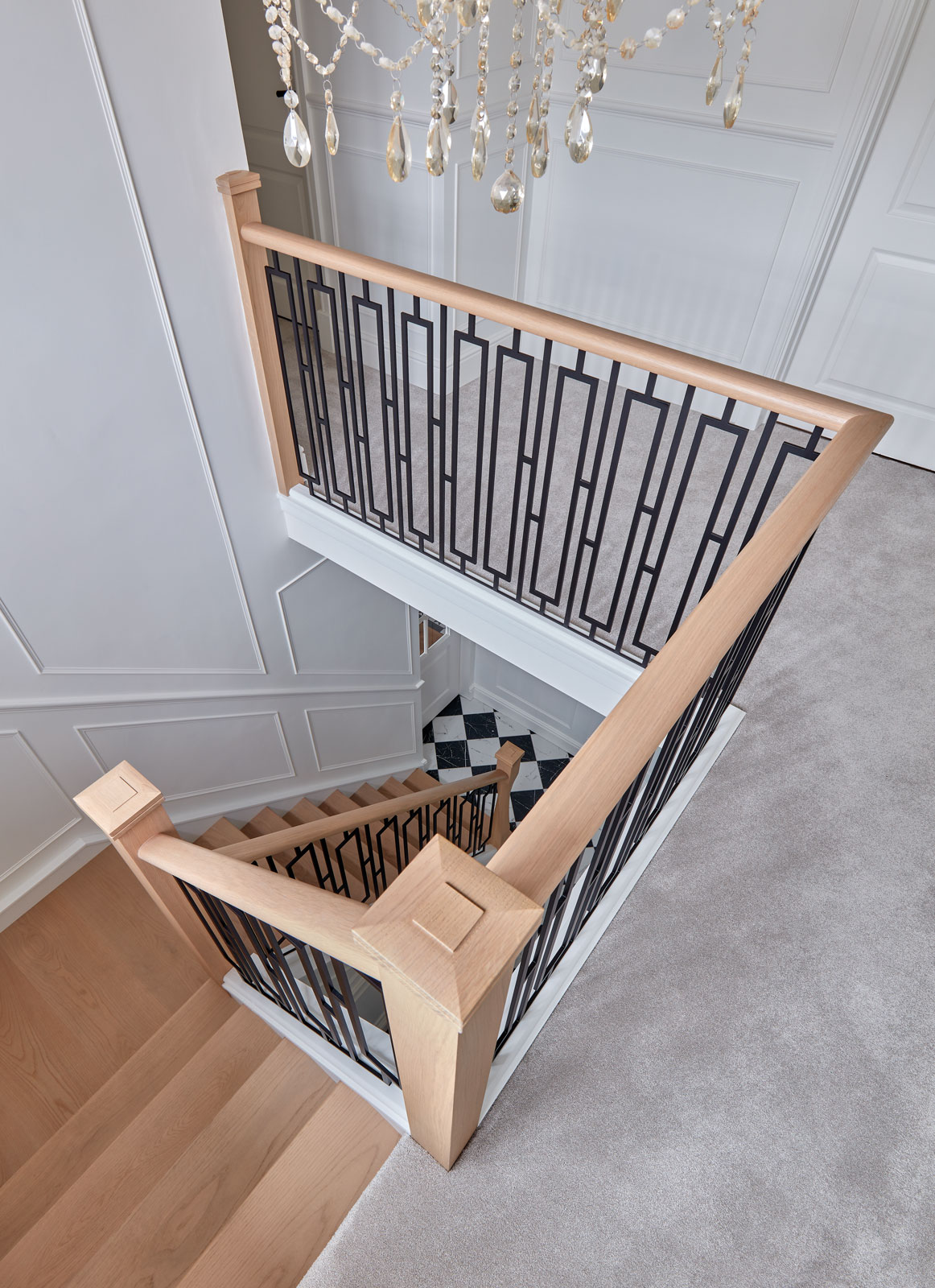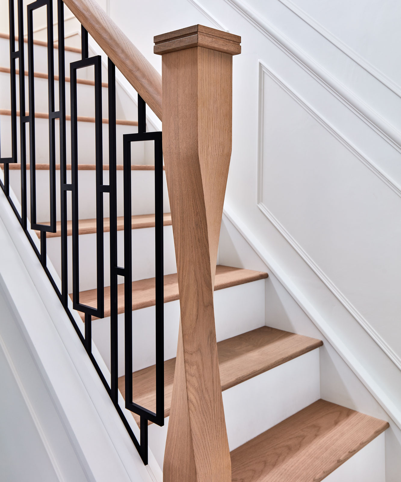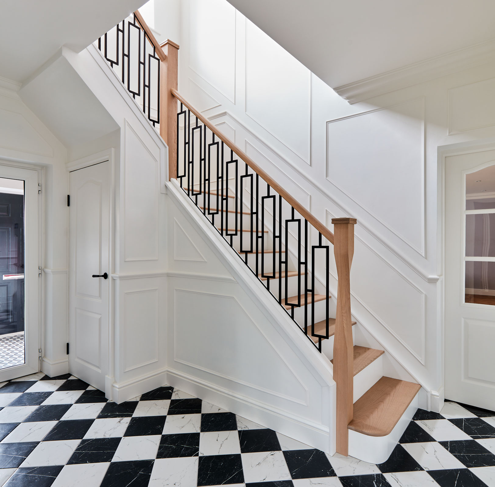 This bespoke metal staircase features our exclusive balustrade design, Basso. The intrinsic and elegant pattern flows up the stairway of the home to create a stunning focal point within the hallway. Our expert designers have paired the matte black steel design with white painted risers and finished with Natural Oak treads, to create a minimalistic aesthetic with a dramatic twist.