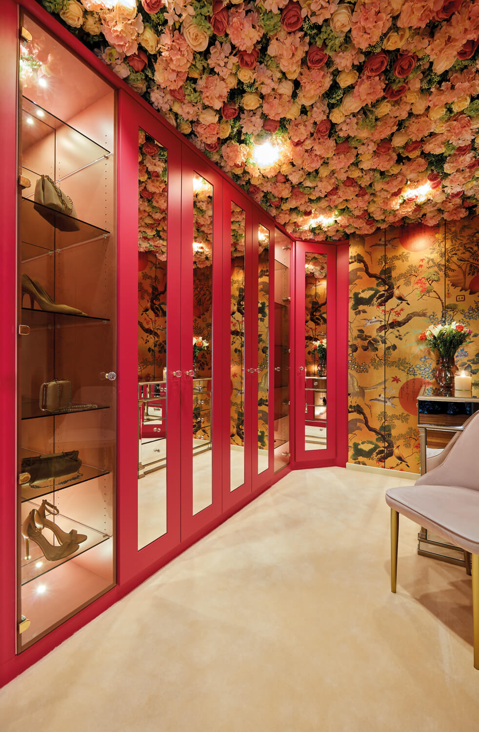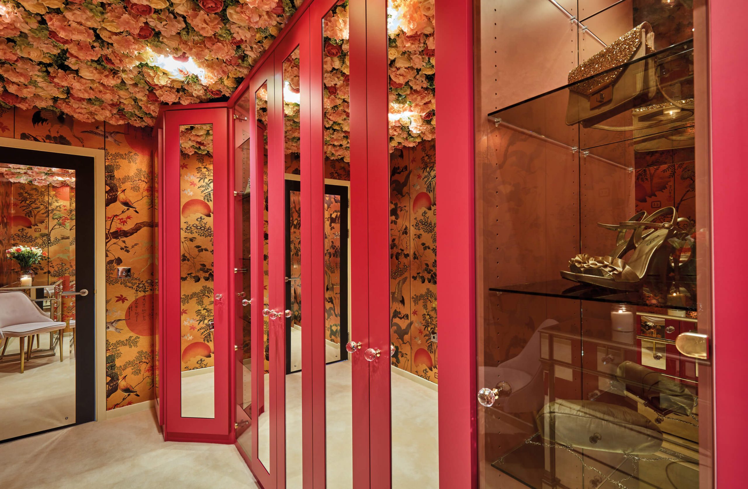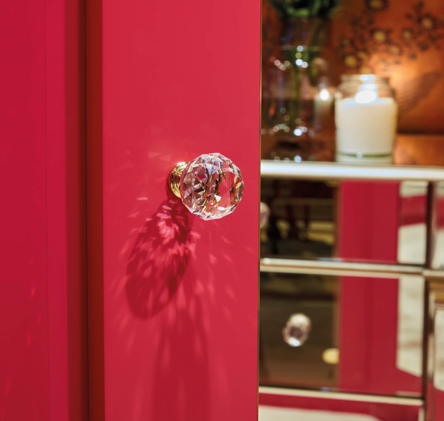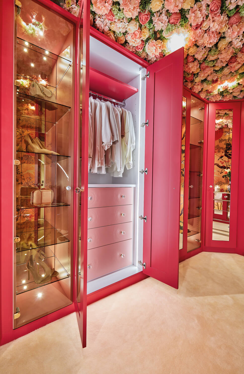 This stunning pink dressing room perfectly exhibits just how bespoke you can go with a Neville Johnson design. Our client wanted a space that was fun and feminine, a place to really enjoy getting ready for any occasion. Painted in Watermelon pink this walk-in wardrobe features custom-built storage plus subtle downlighting and glass shelving to showcase treasured possessions.