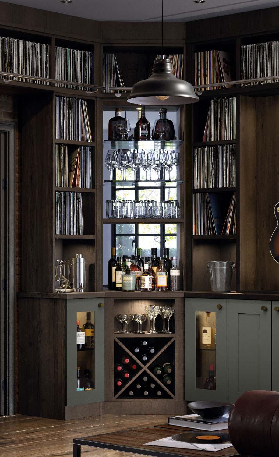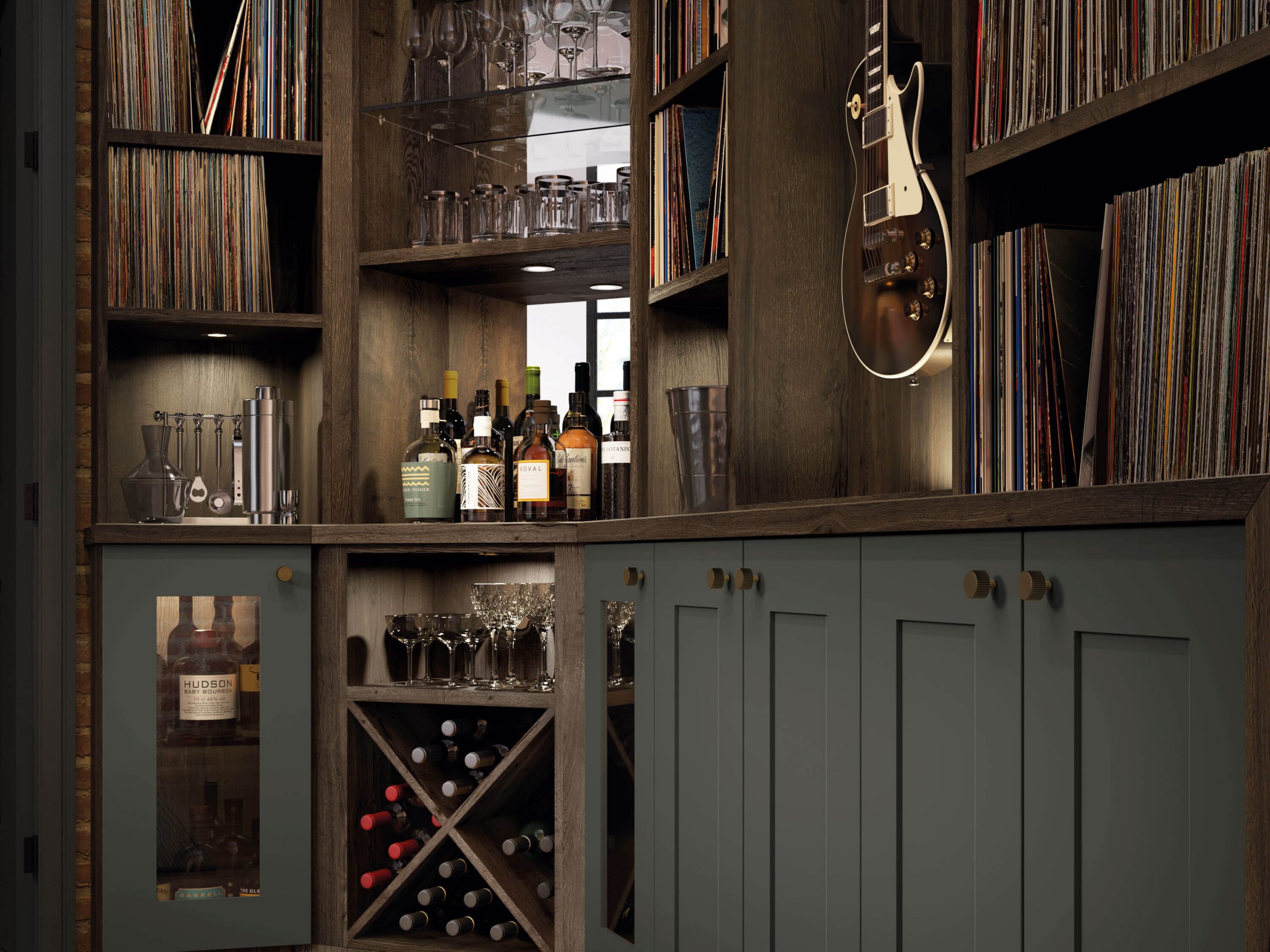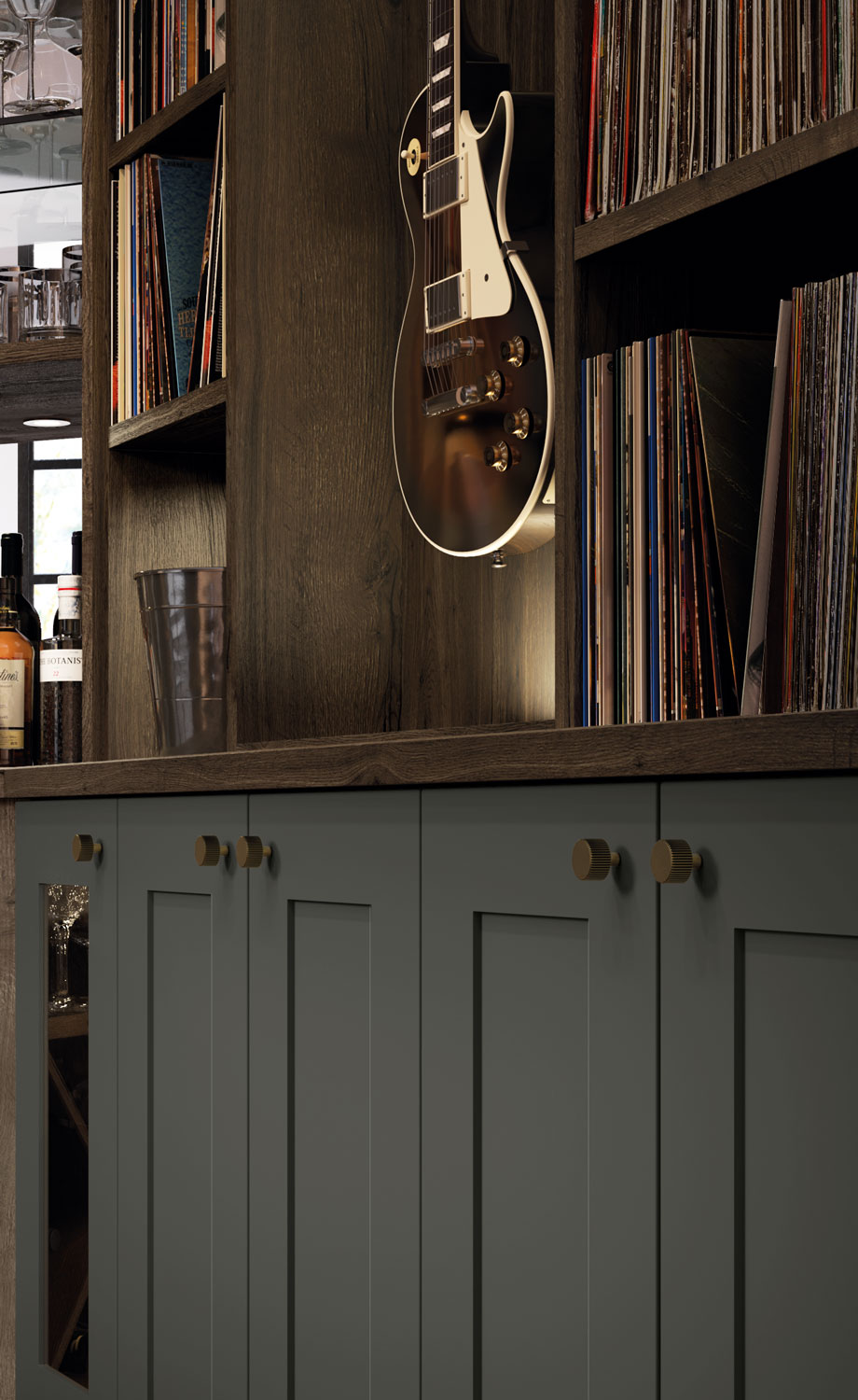 A fine example of bespoke fitted furniture, this music room featuring wall-to-wall vinyl storage creates a space that oozes relaxation and escapism. Our expert designers incorporated open shelving for showcasing a treasured record collection and closed cabinetry to conceal technology. Painted in our exclusive shade Dewberry, a calming grey-blue, the colour perfectly complements the rustic Oxford Oak finish. The fitted home bar and built-in wine storage complete this solution, to create a space that is the epitome of luxury.