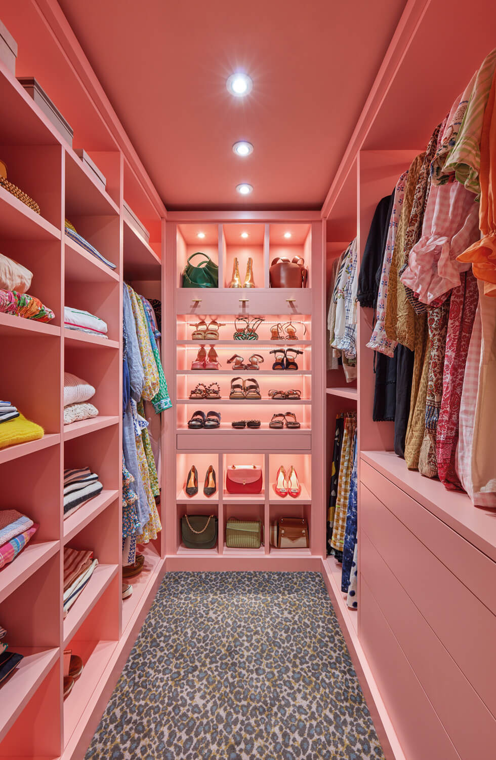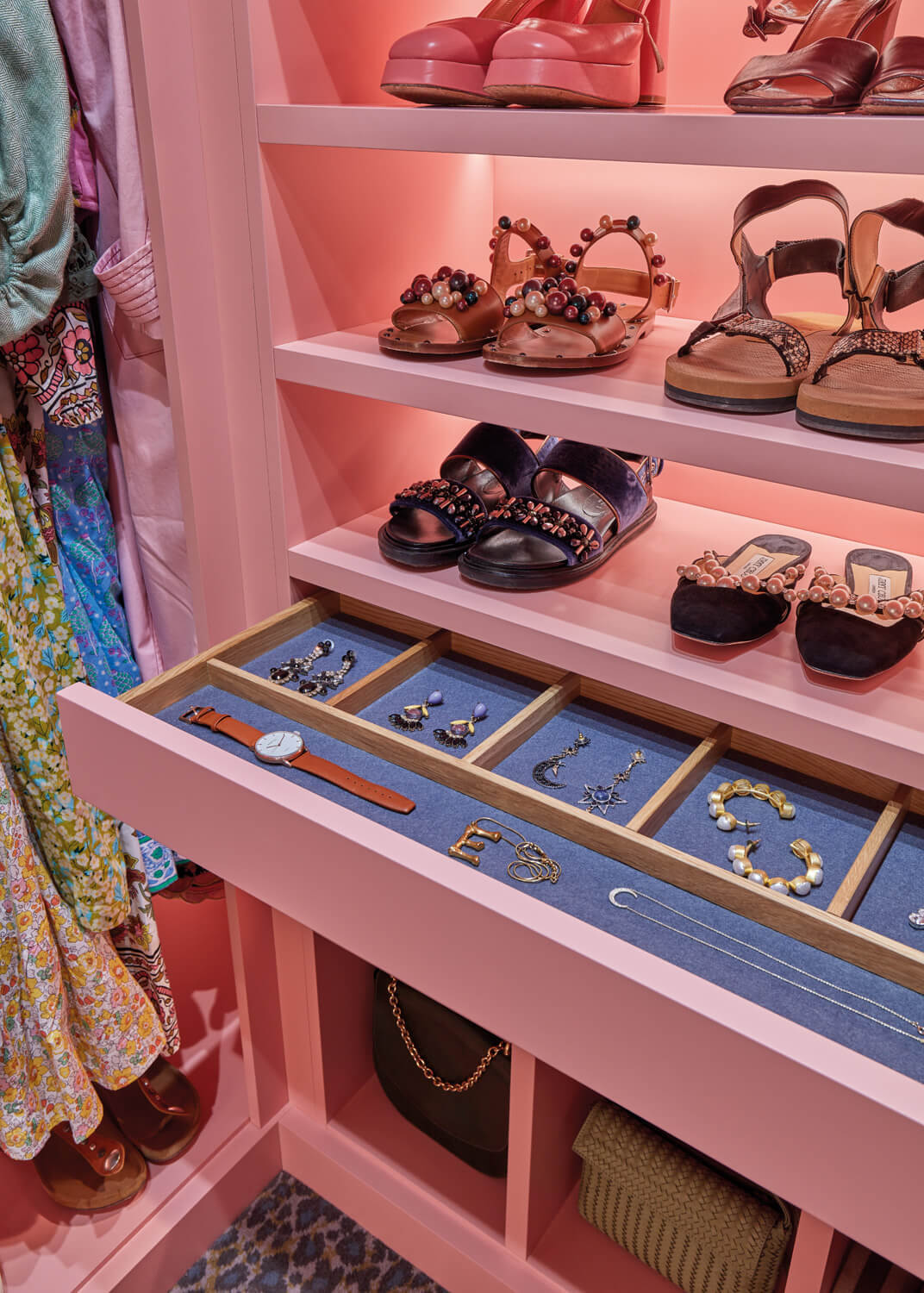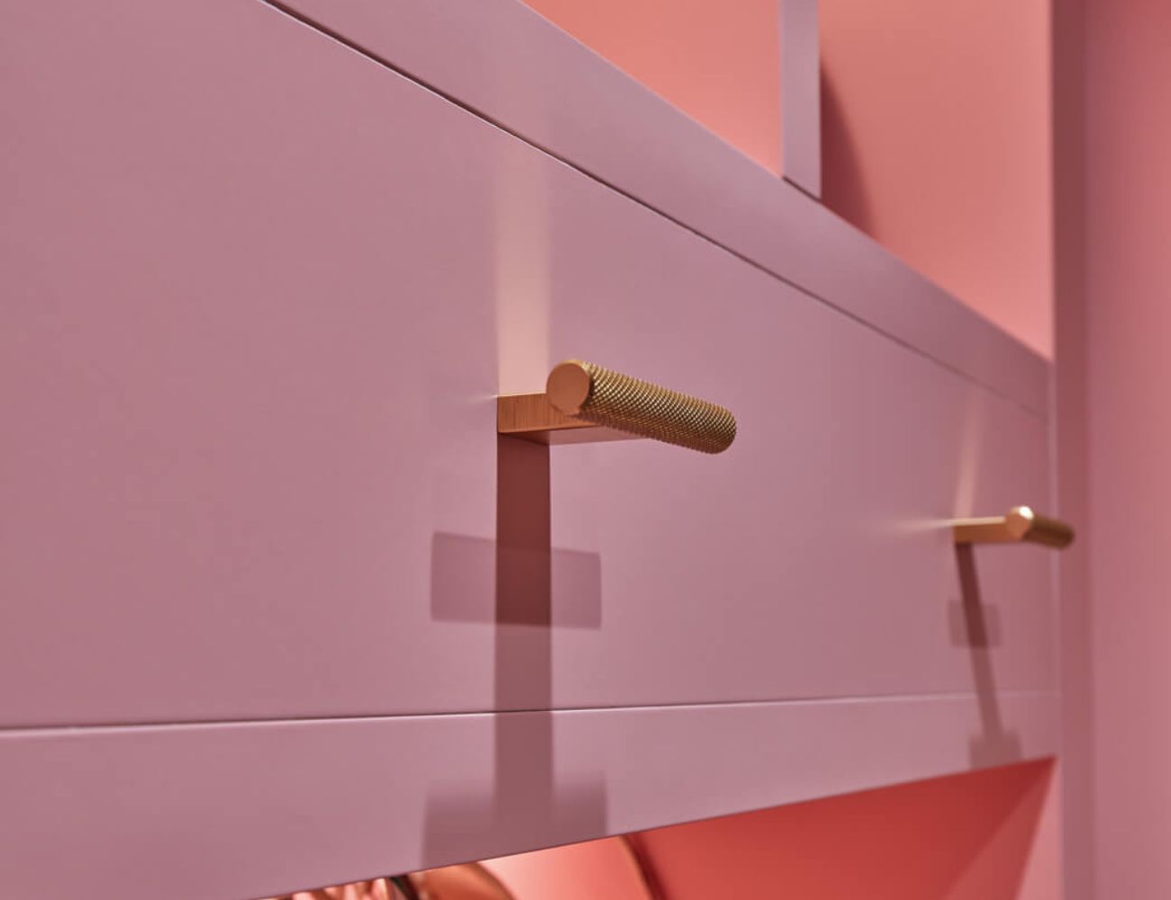 Painted in our exclusive colour Coral Rose, this bespoke walk-in-wardrobe is a fine example of Neville Johnson furniture.