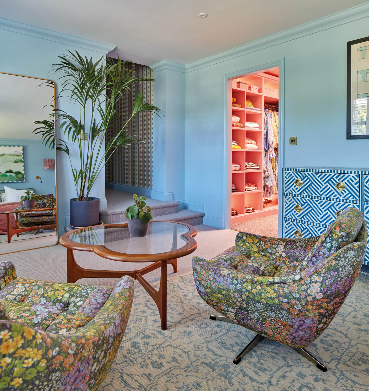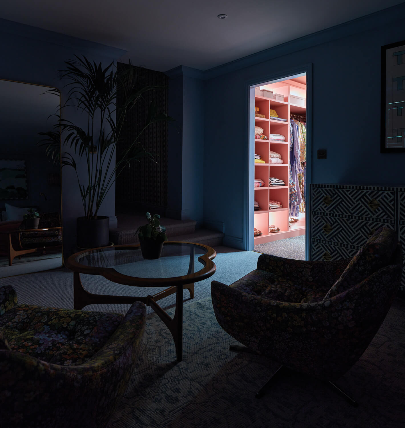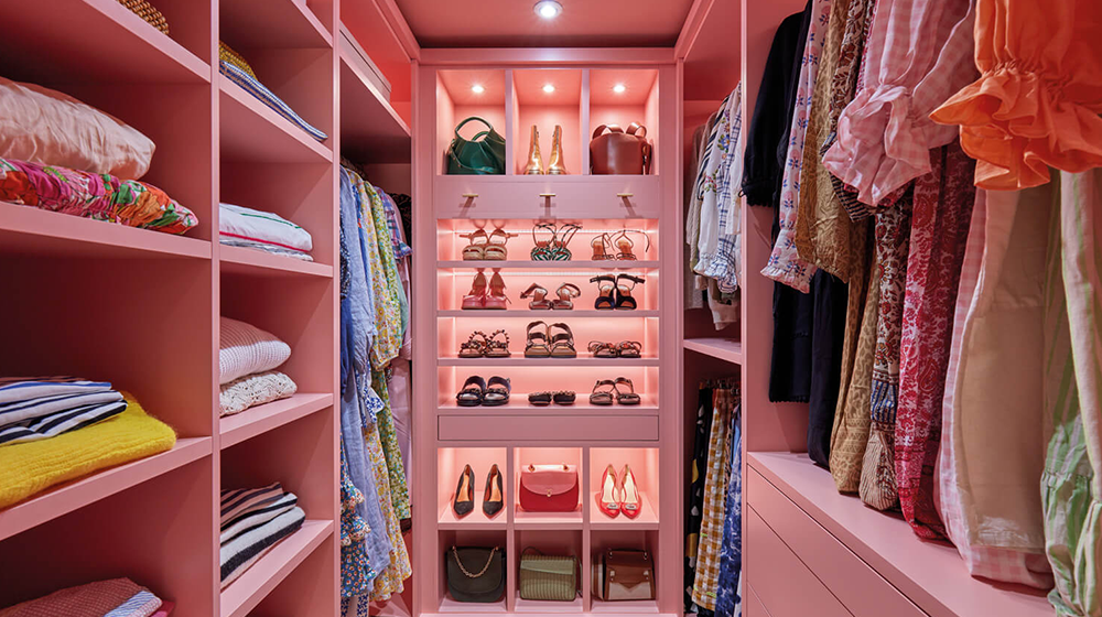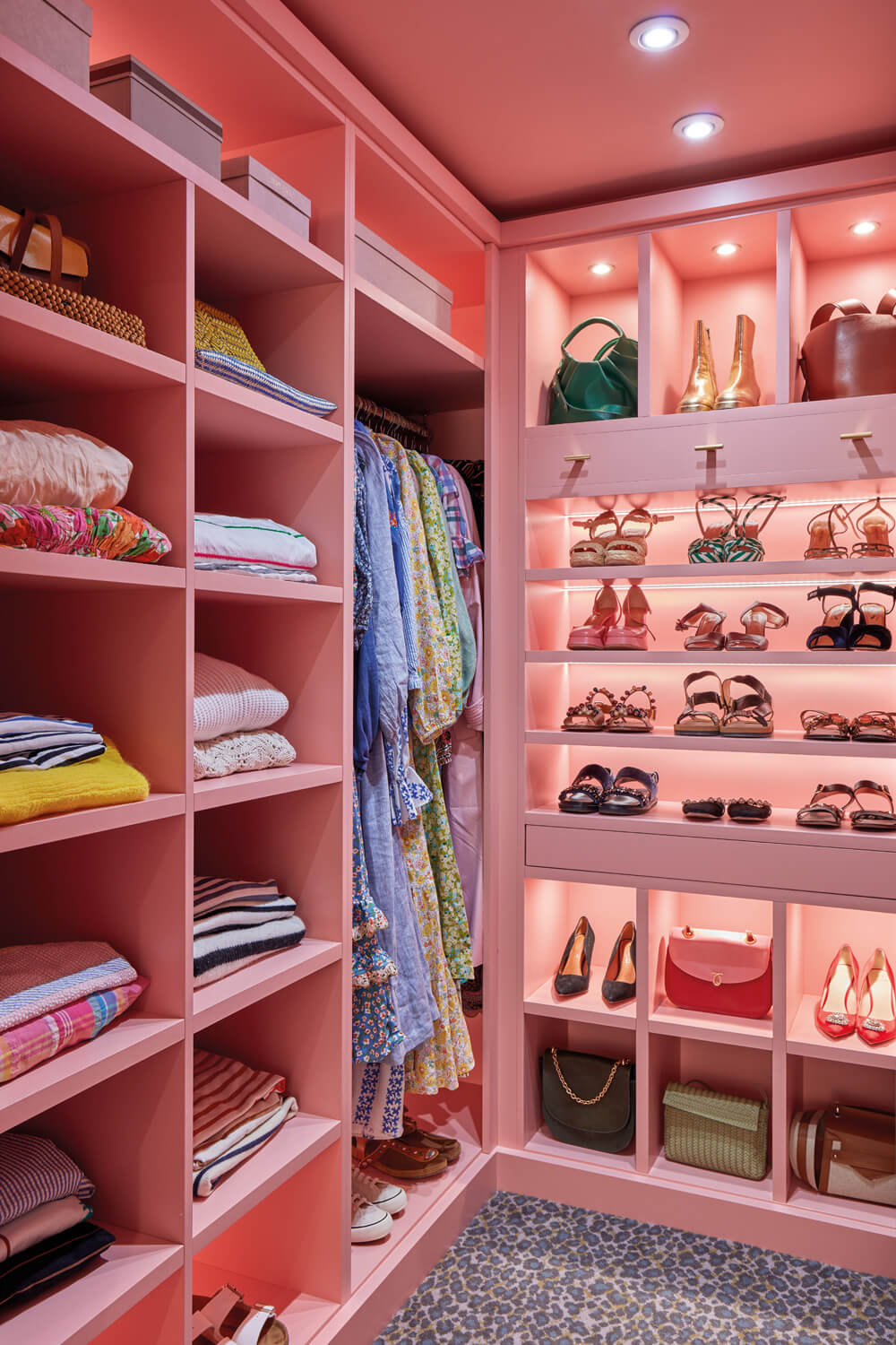 Painted in our exclusive colour Coral Rose, this bespoke walk-in-wardrobe is a fine example of Neville Johnson furniture.