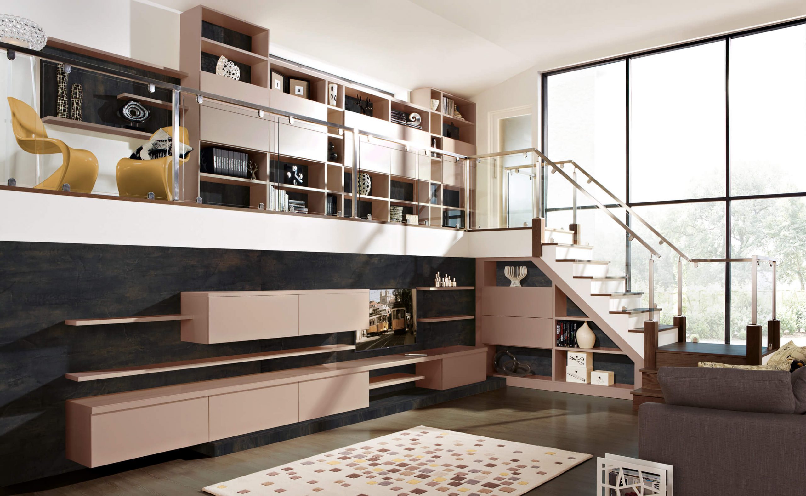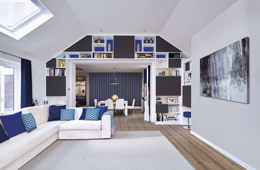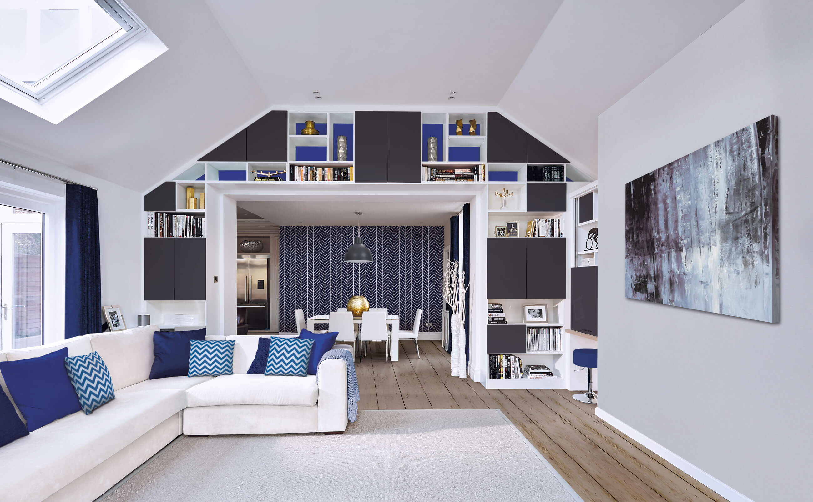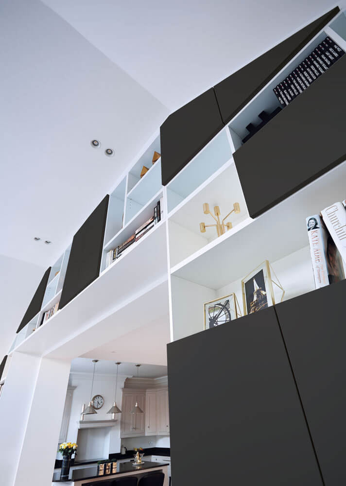 This open plan living room design gives a modern home new life. With fewer walls more light flows through but there’s less room for traditional storage solutions. Our answer was to design made-to-measure shelving, cleverly integrated into sloping ceilings to create an eye-catching display area. Discreet storage keeps the room free from clutter and the overall effect is both practical and aesthetically pleasing. It keeps the room free for relaxing and entertaining in style while enhancing the look and feel of the whole room.