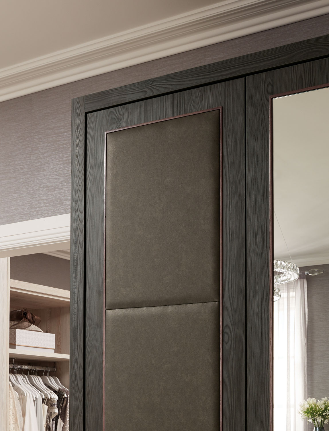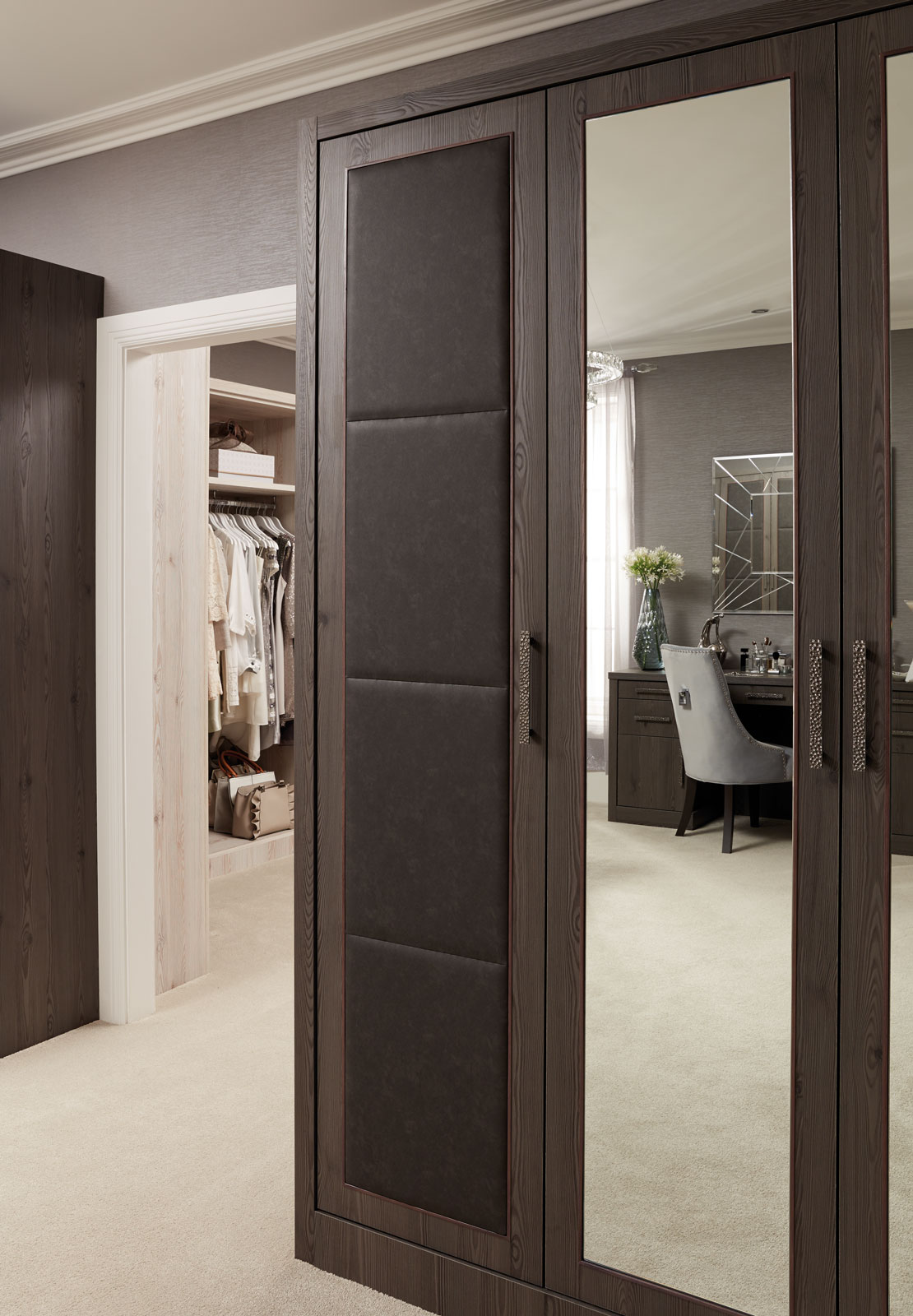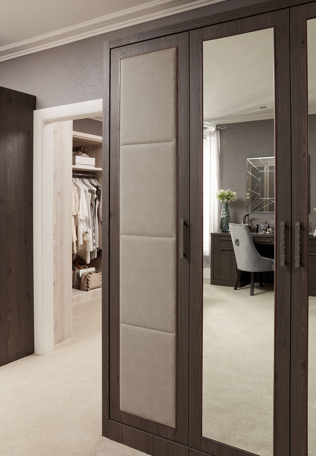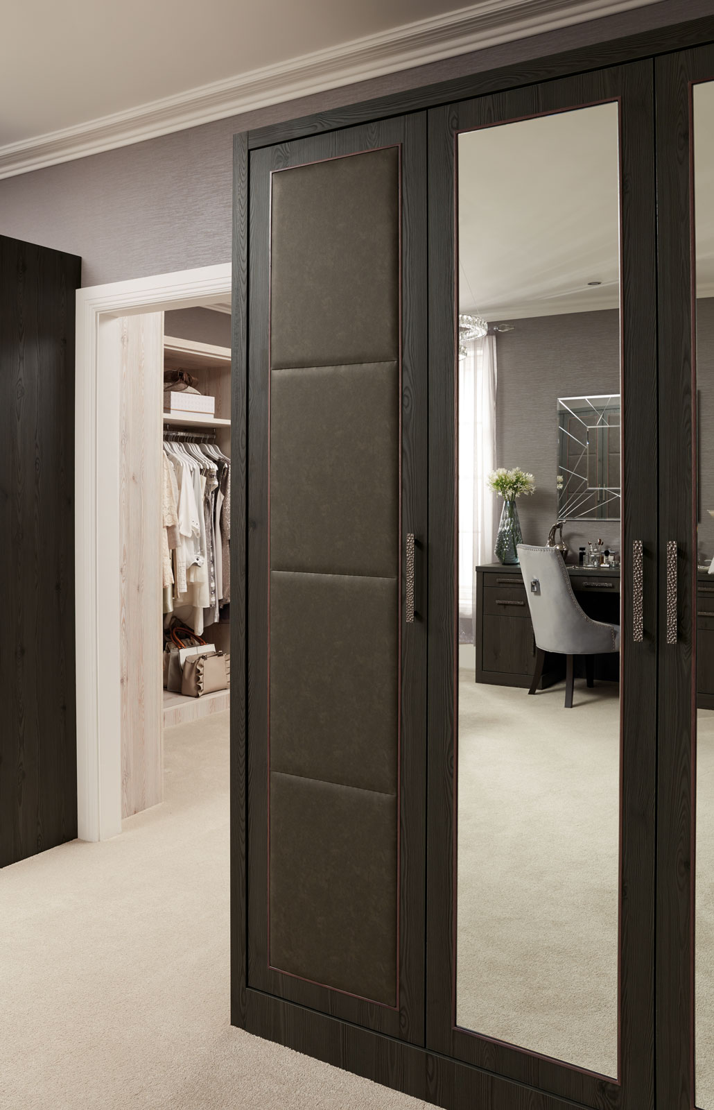 The bespoke fitted wardrobes are finished with sumptuous upholstered fabric panels. Carefully stitched into the doors, these padded panels ooze class and sophistication.