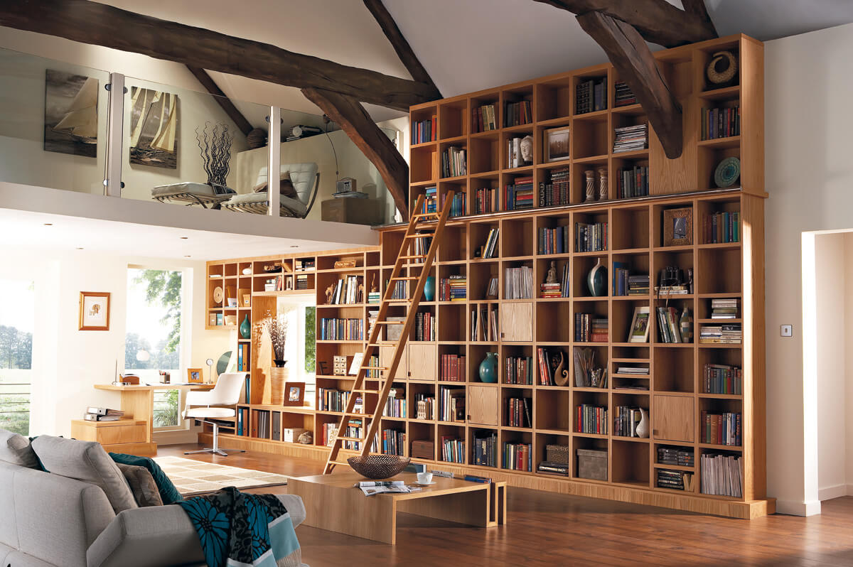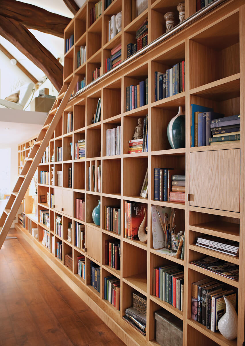 Adapting to the position of the mezzanine floor, we created a bespoke bookcase to fill the space, with a co-ordinating ladder for easy access to higher levels.