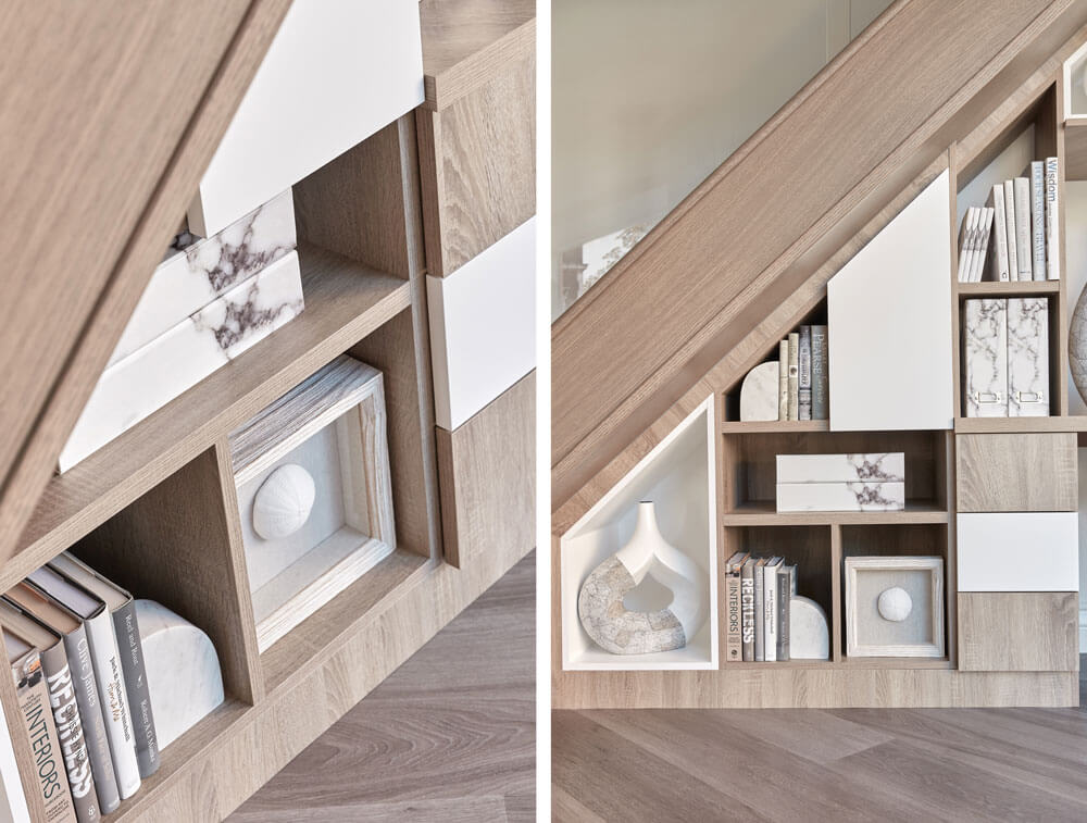 Specialist furniture designers see opportunities where others can’t. ‘Dead’ zones such as quirky alcoves or under-stair spaces can be transformed into useful places, with made-to-measure shelves or cabinets in a style and finish that complements your personal taste. By making the most of the storage opportunities in features like these, you can make your room look and feel more spacious.