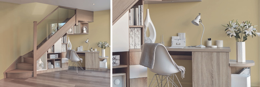 If creativity and productivity is the objective of your space, a pop of sunny yellow can boost your dopamine levels. Alternatively, use a softer shade of honey on walls and more extensive furniture solutions to bring a warm and cheerful ambience to the space.