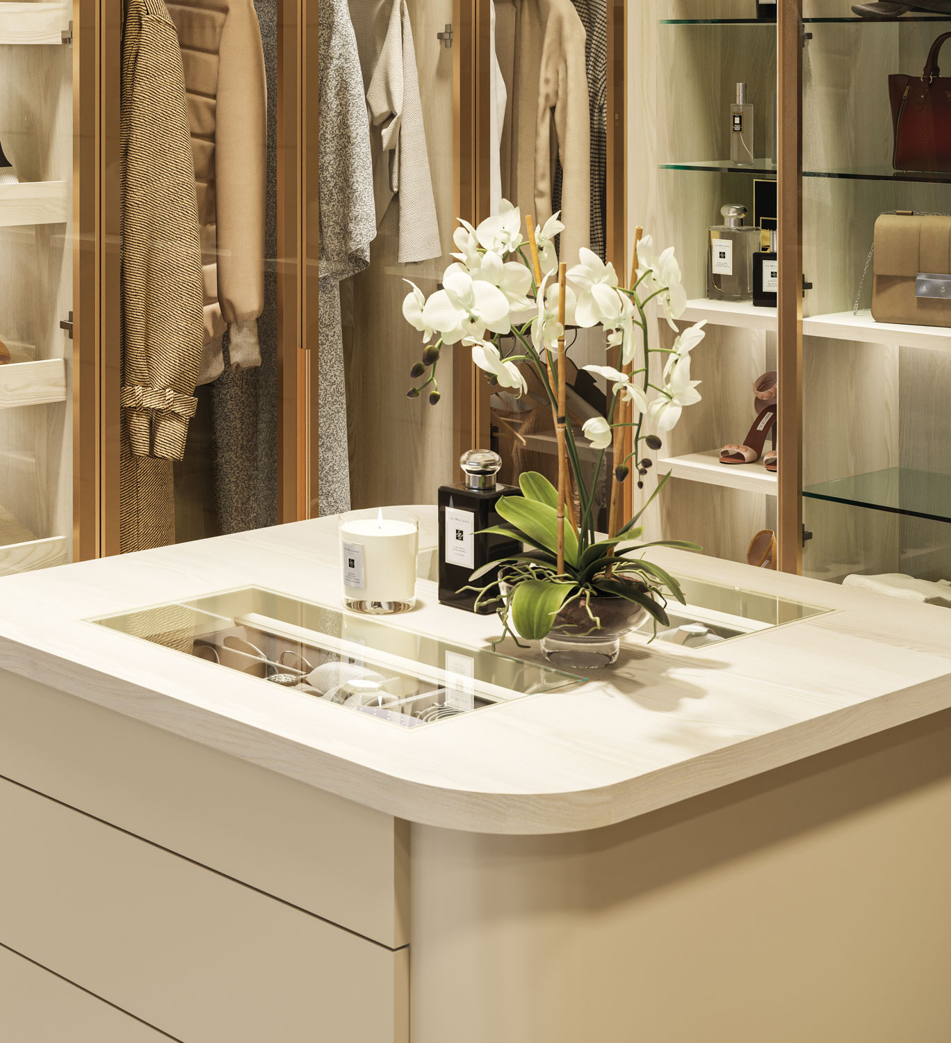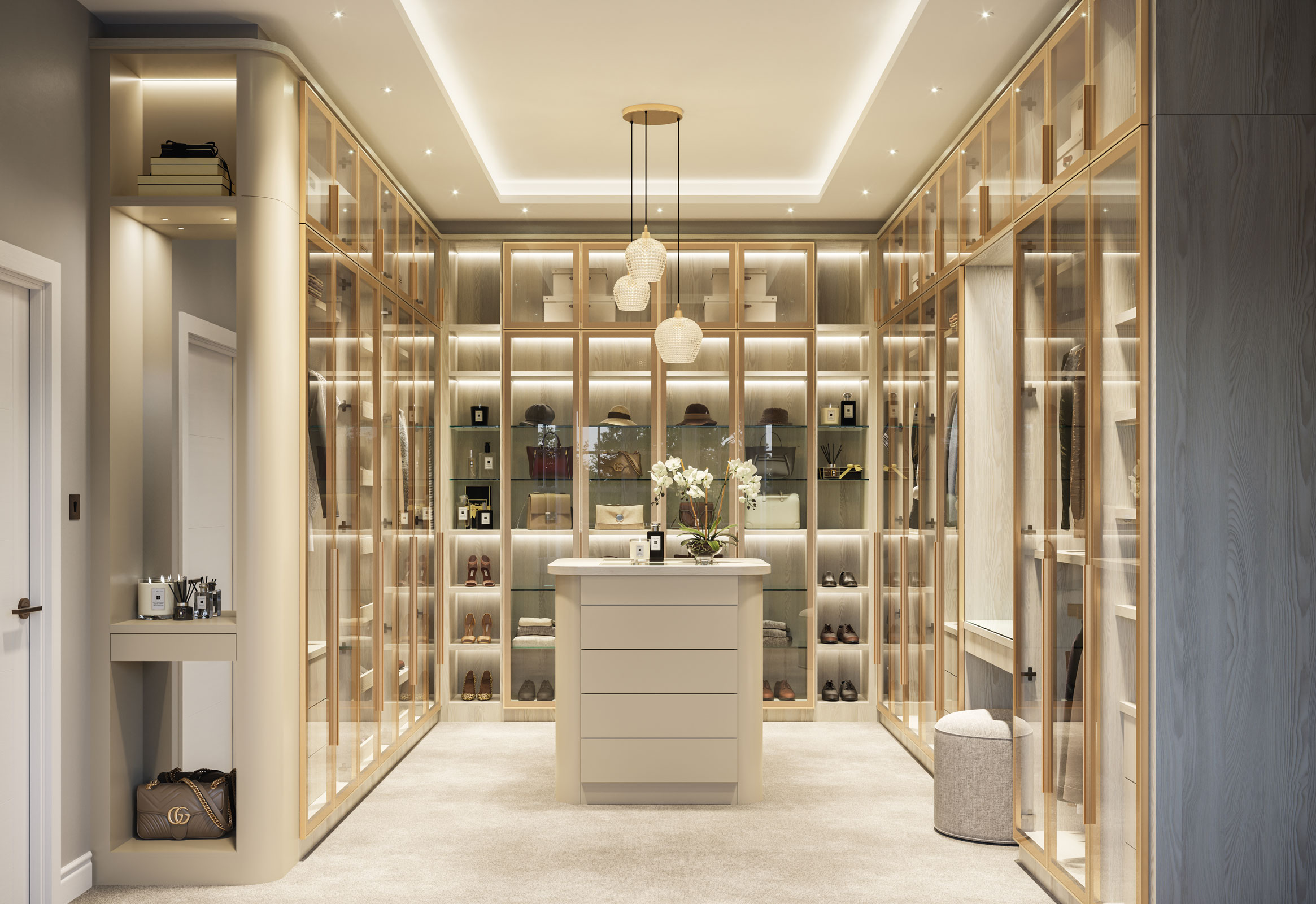 Featuring our exclusive metal frame glass doors in Lux Gold, this spectacular dressing space has been designed to stun and impress. Finished in Cartmel Ash and illuminated with down-lighting, our expert design team have created a space that not only provides maximum storage and organisation, but is a true style statement for any home.