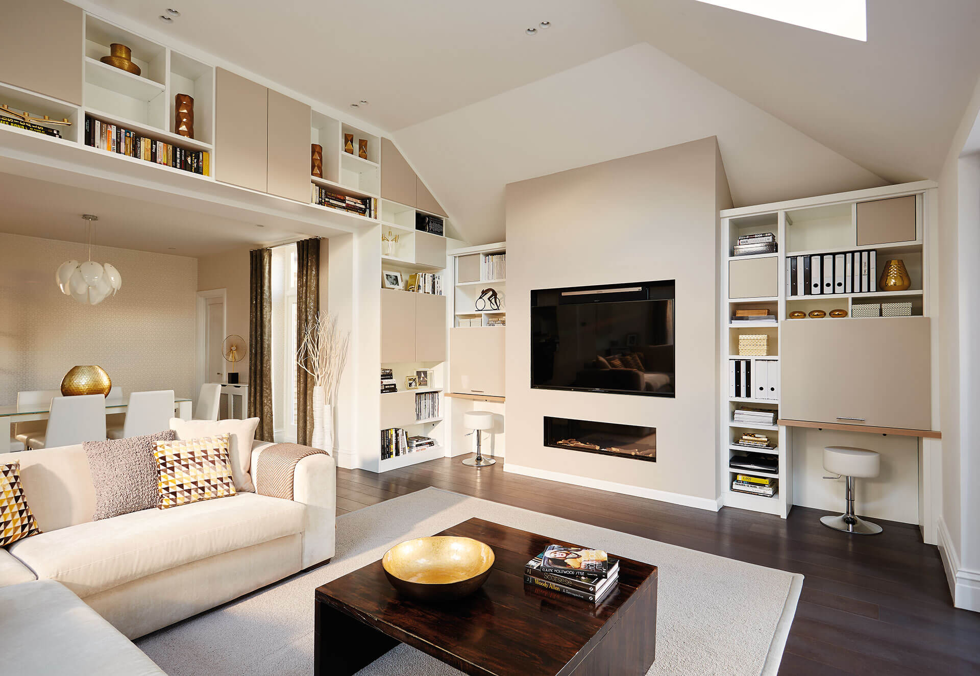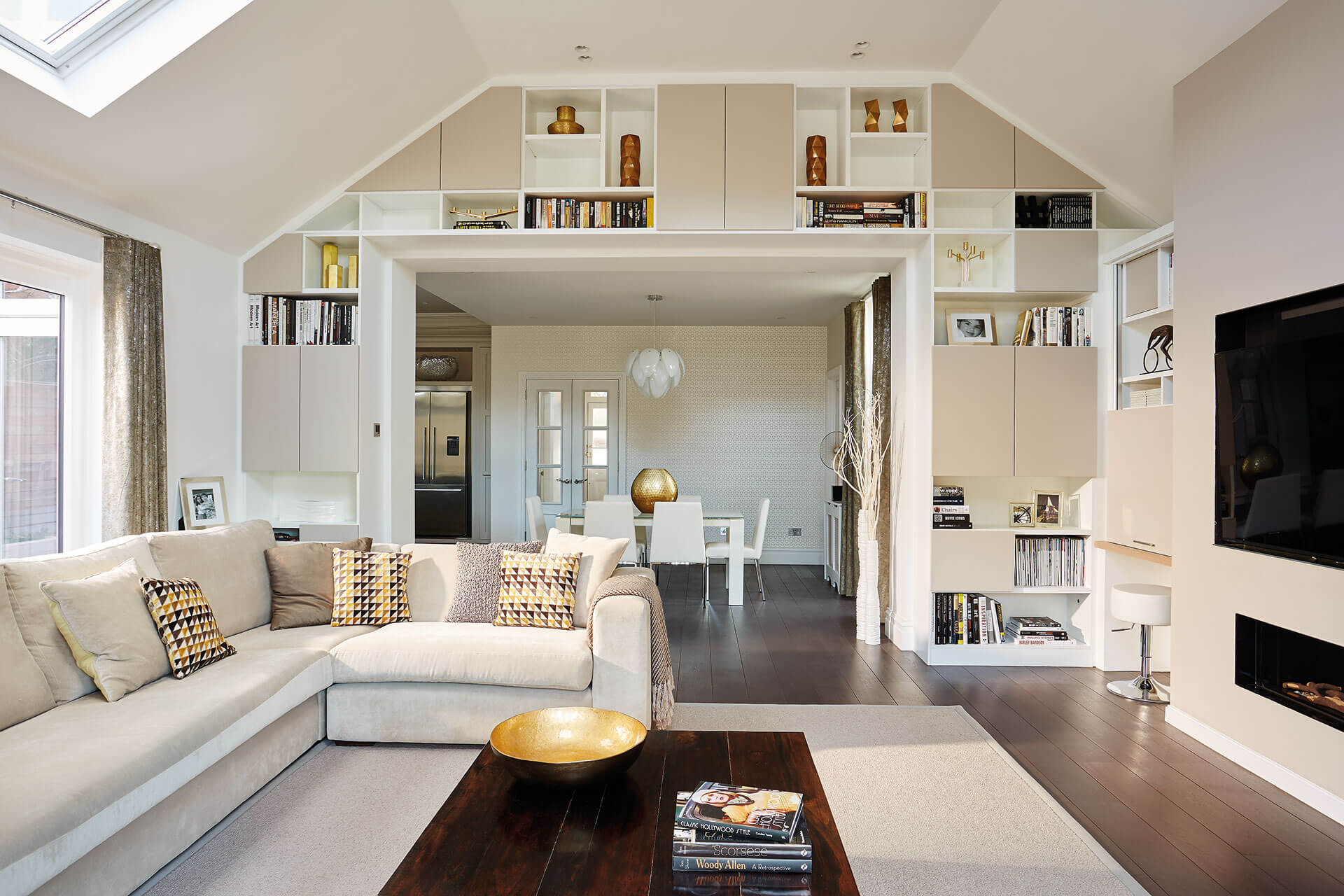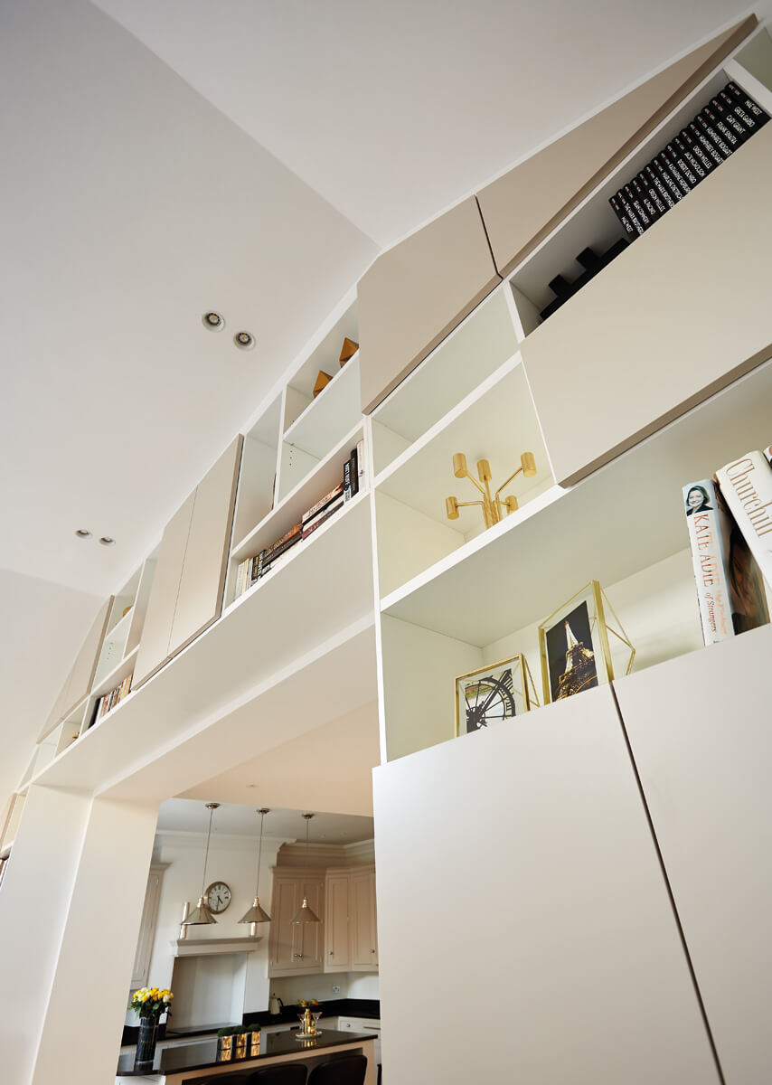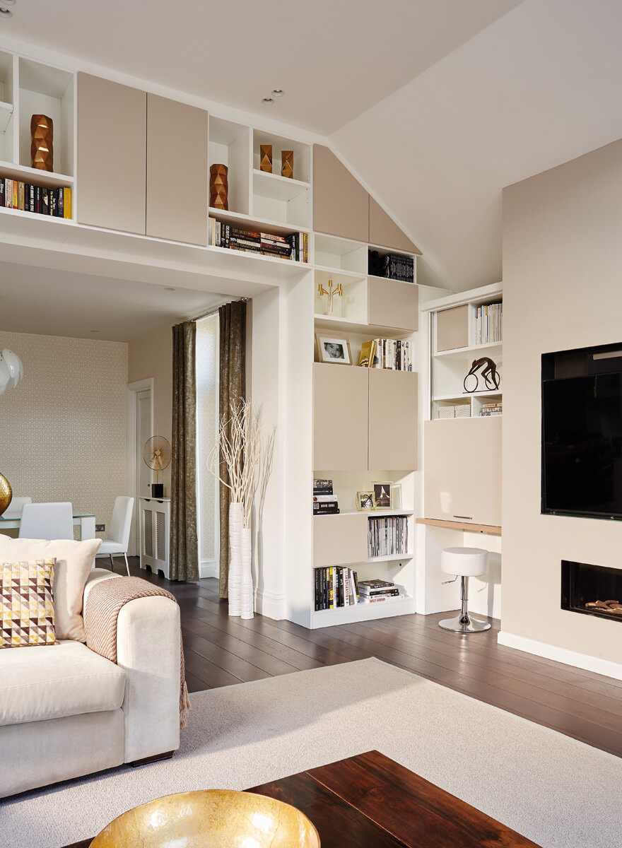 This airy, bespoke furniture design fits perfectly within the open plan living area. Cleverly integrated wall to wall shelving compliments the quirks of the room. Therefore creating a real central feature and opening up additional display space. Whether you’re looking to relax and unwind or entertain guests, this design is the perfect multi functional solution.