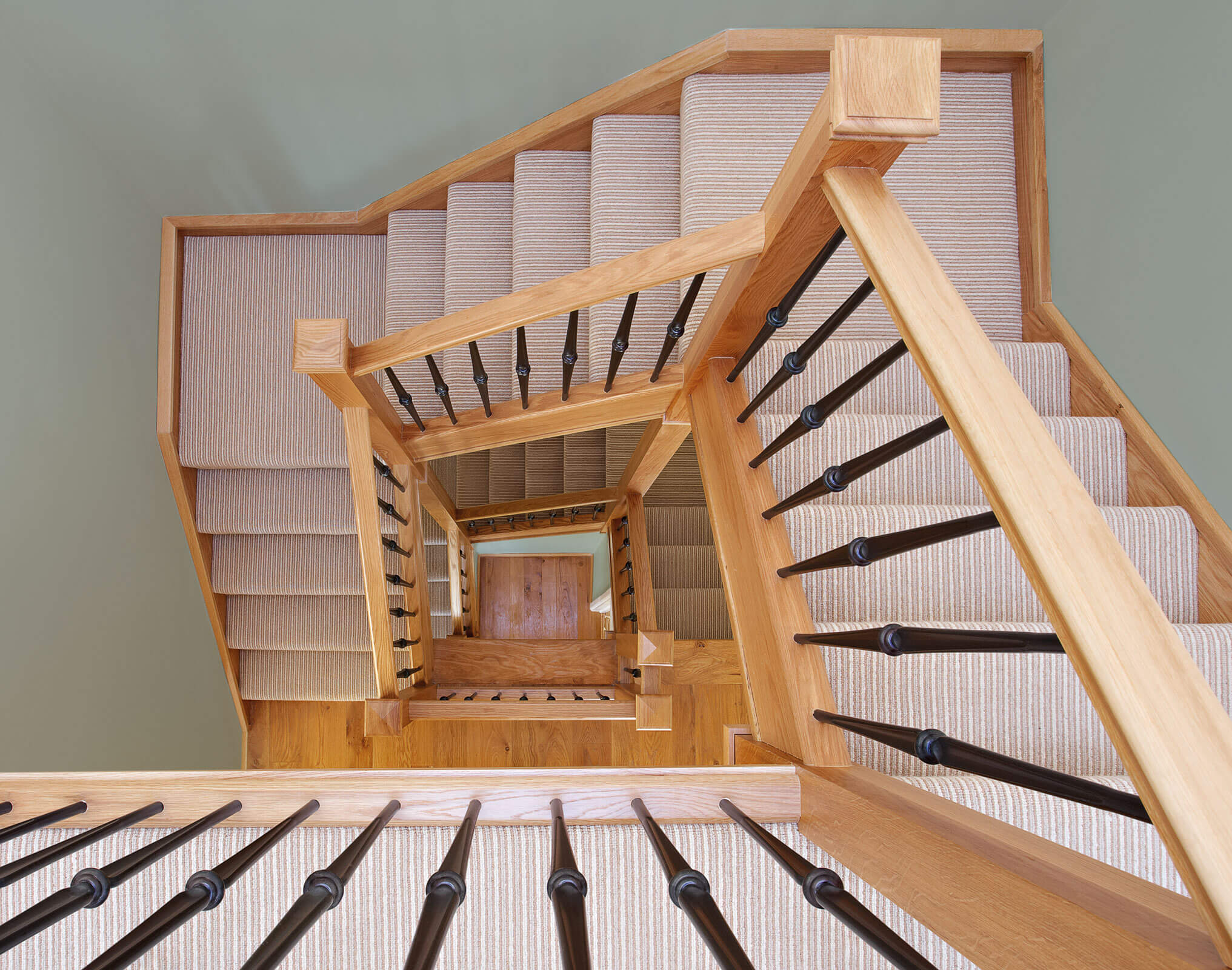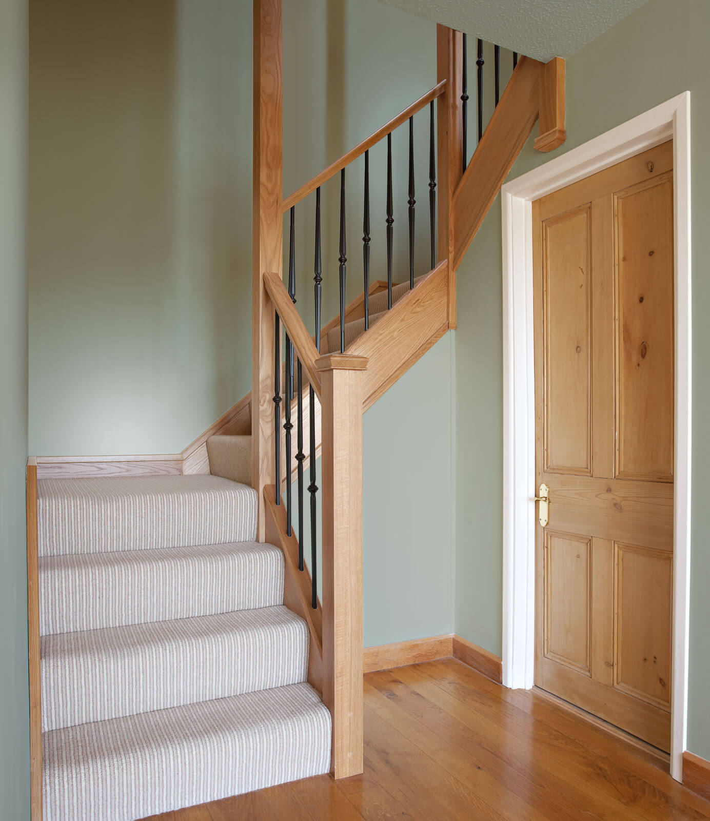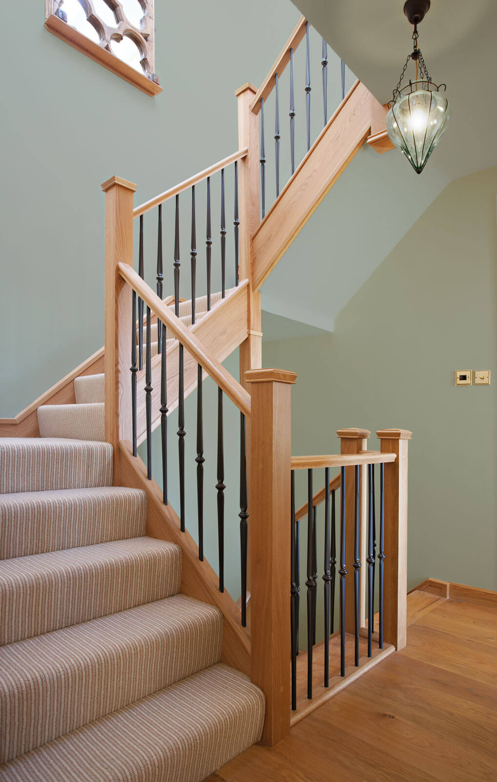This contemporary staircase features a striking oak and steel balustrade that turns the staircase into a stunning focal point. By choosing solid, clean lines for the newels and rails, the decorative steel spindle draws all the attention, creating a design that is eye-catching without being ostentatious. This bespoke design was installed across multiple floors and half-landings, for a consistently impressive finish throughout the entire house.