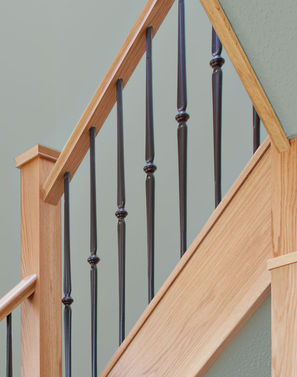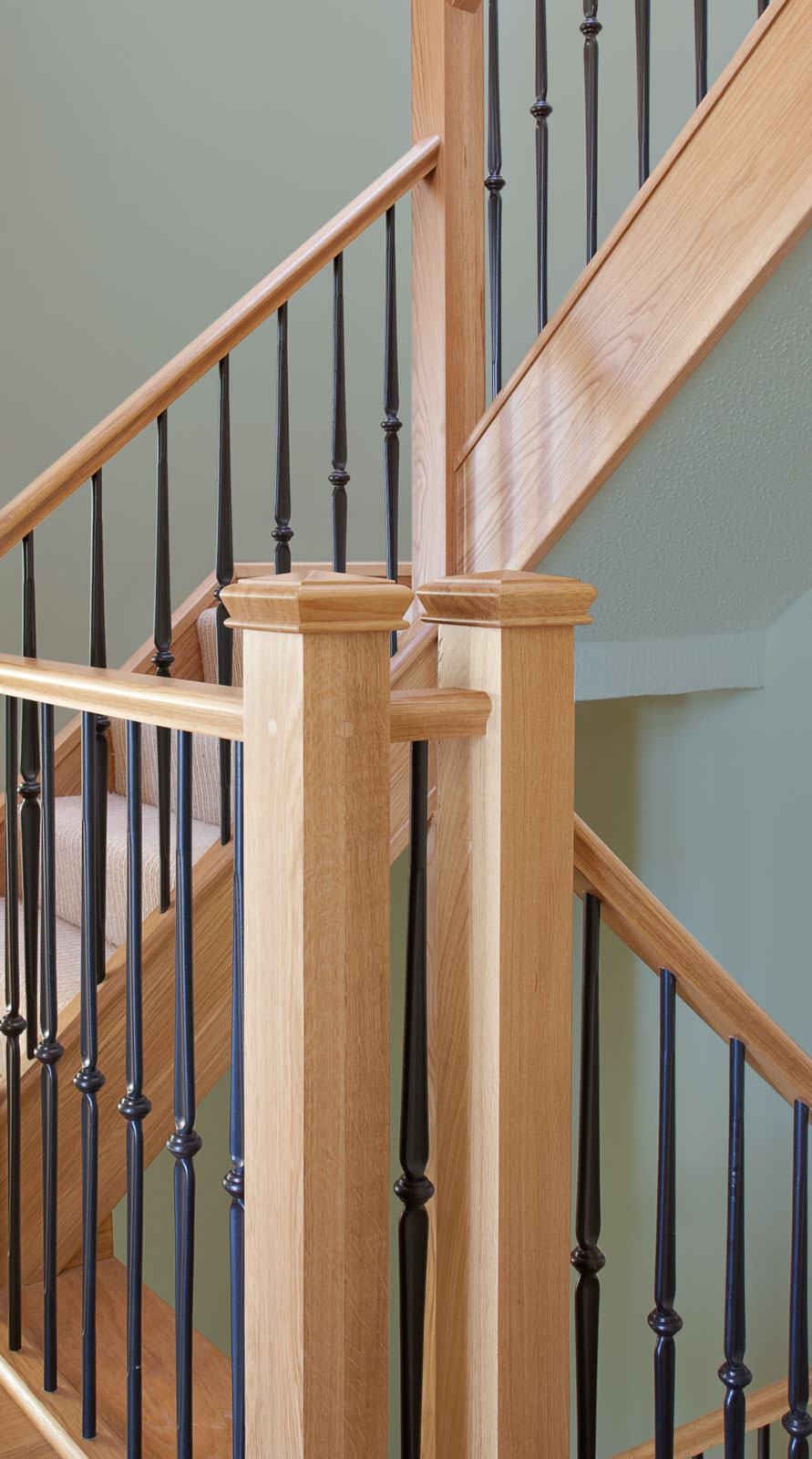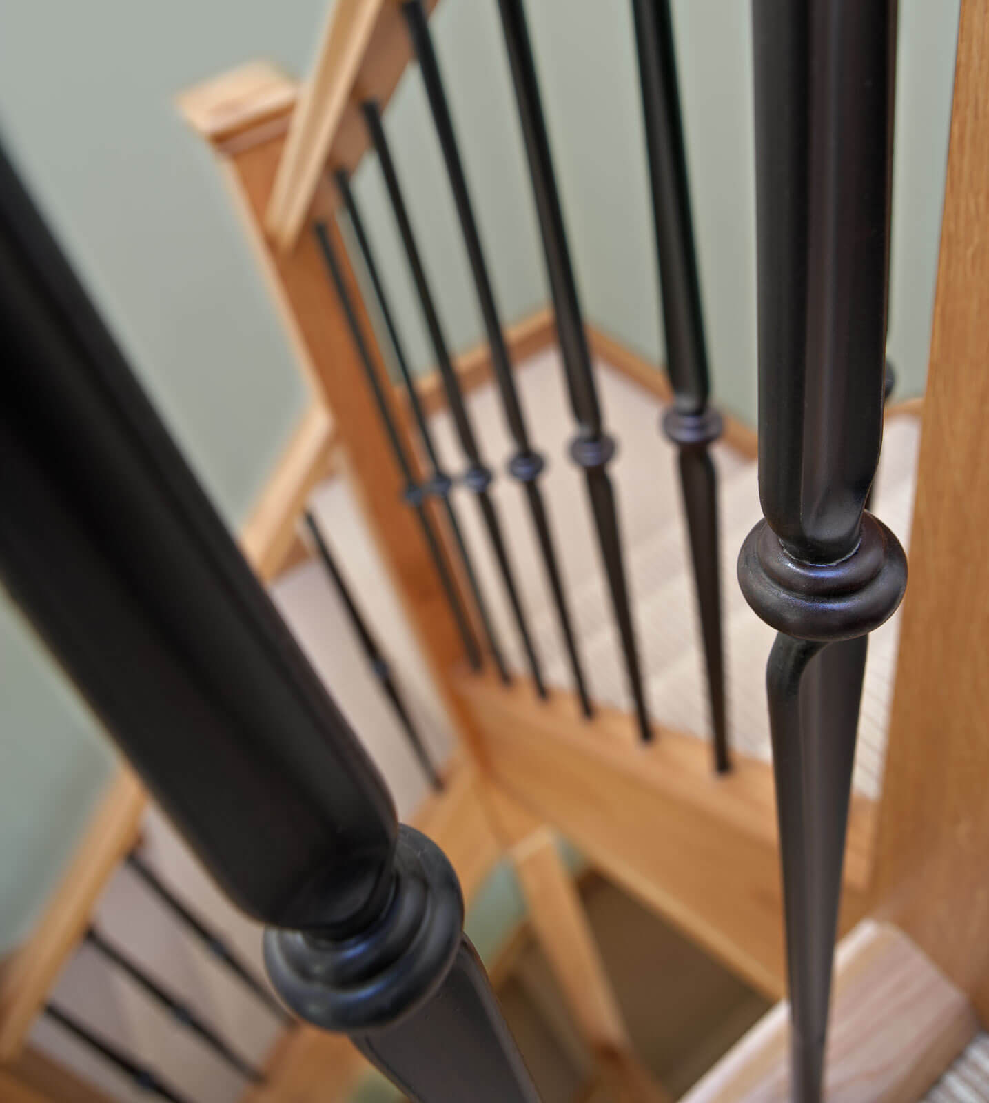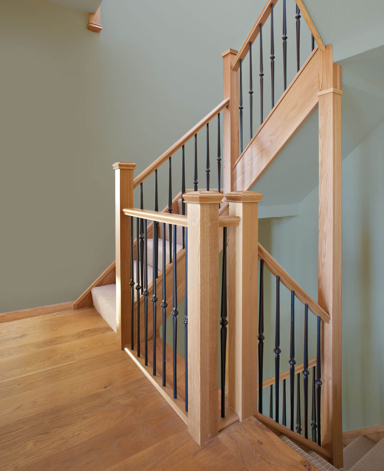 This contemporary staircase features a striking oak and steel balustrade that turns the staircase into a stunning focal point. By choosing solid, clean lines for the newels and rails, the decorative steel spindle draws all the attention, creating a design that is eye-catching without being ostentatious. This bespoke design was installed across multiple floors and half-landings, for a consistently impressive finish throughout the entire house.