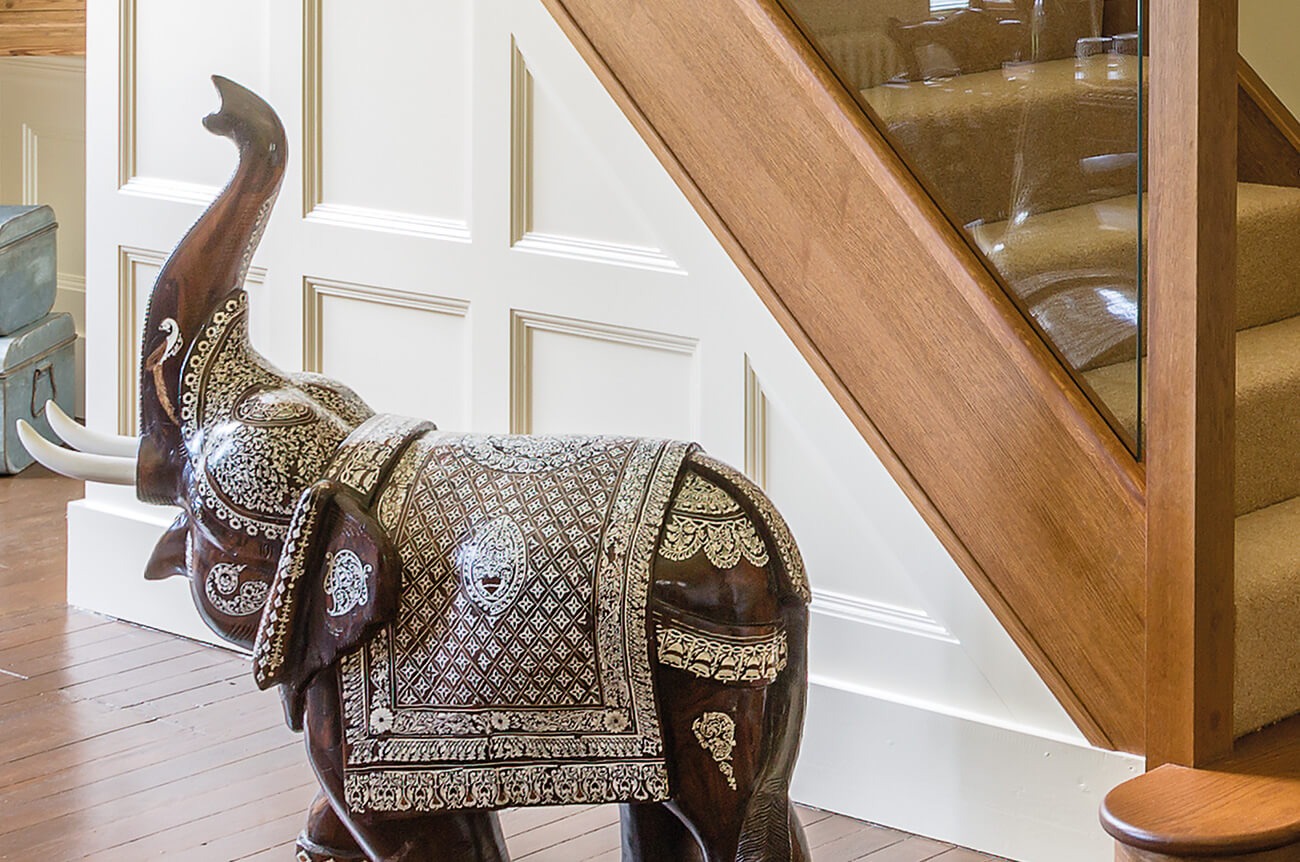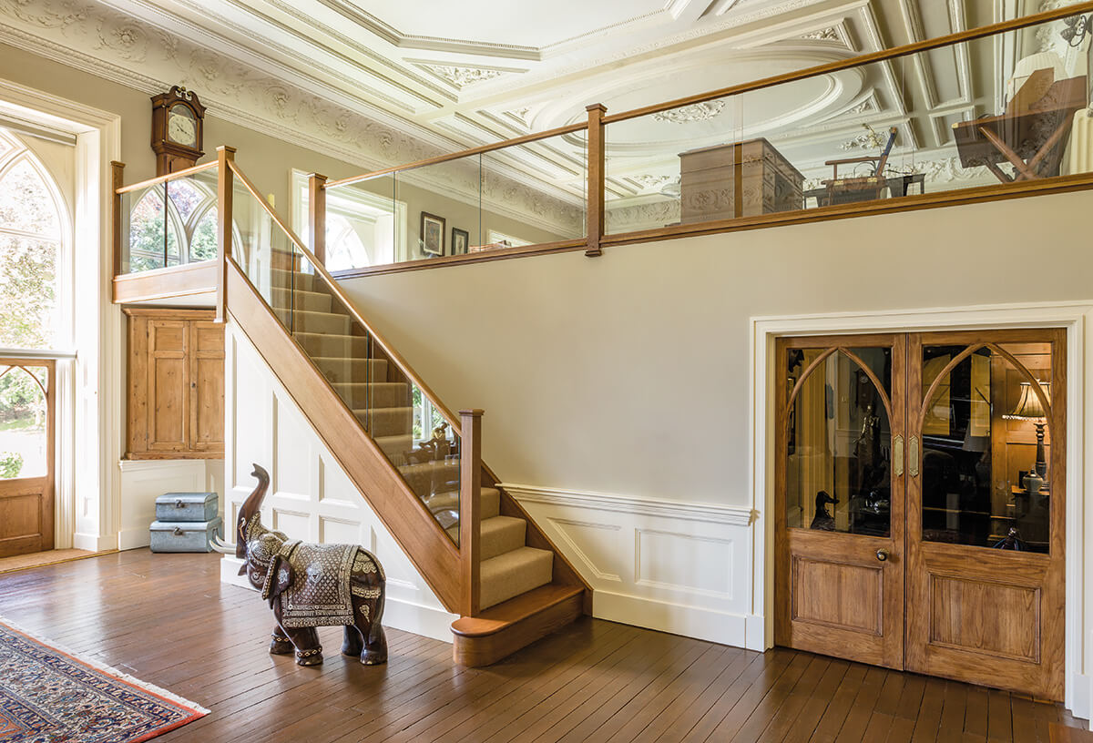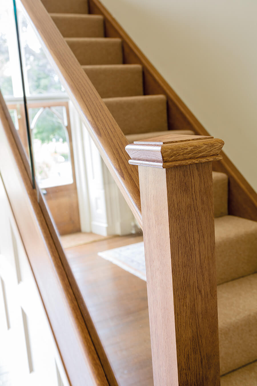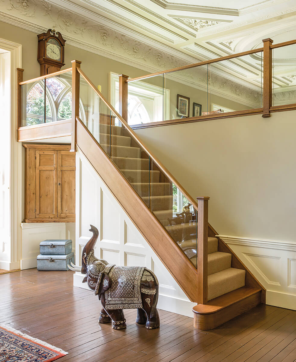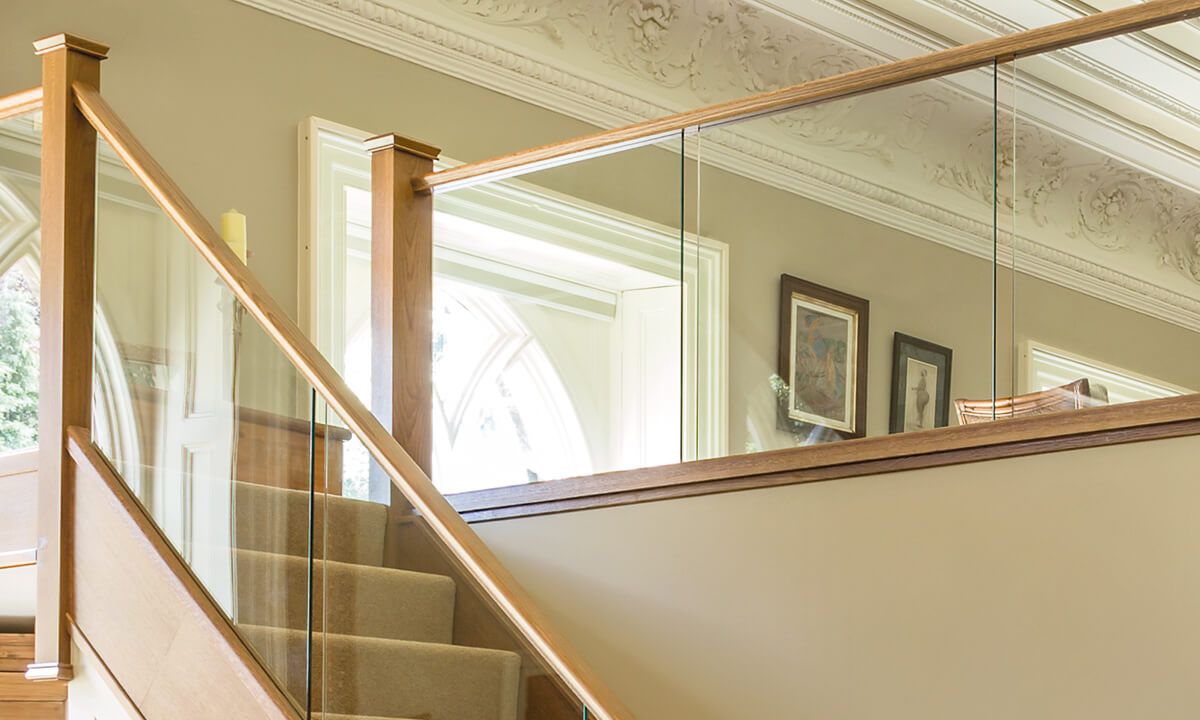 This in-line glass balustrade design, combined with dark oak newel posts perfectly couples a contemporary staircase design with a traditional room. The use of the seamless, sleek glass balustrade helps to increase the amount of light within the hallway, which brings out the fantastic detailing in other aspects of the room décor. The balustrade has been extended to create a galleried landing, offering unobstructed views of the hallway.