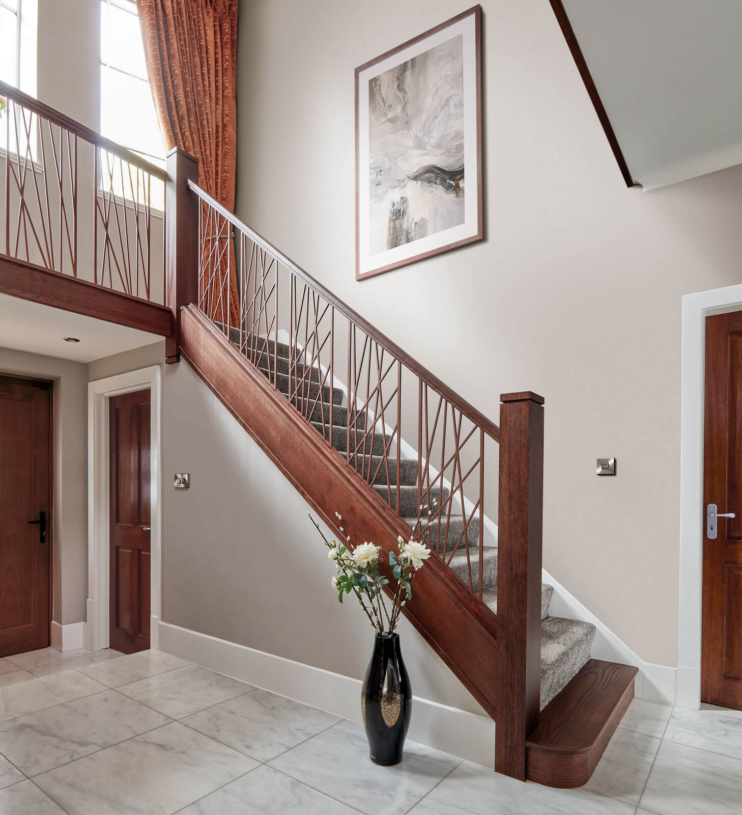 Combining a contemporary copper finish within a traditional oak design, this Opus staircase will make a stunning statement in any home. The coalescence of high-quality laser-cut steel with natural wood not only illustrates the use of the finest materials but results in a timeless classic that will suit a range of hallways and entrances. Create a staircase design especially for you with Neville Johnson and transform your hallway for years to come.