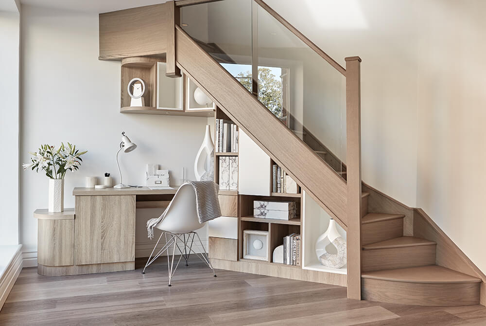 Jamie Godfrey, Senior Designer mentions, usually the toughest and most awkward spaces are those with angles (i.e. under stairs, in the eaves of a loft conversion). We are able to take full advantage of these spaces. Sometimes, a simple piece of furniture such as a bookshelf, or display wall can fit perfectly into these spaces. Alcoves and wide hallways are often a ‘by-product’ of a renovation and should be viewed as storage opportunities, rather than awkward spaces that cannot be used. With fitted storage, a large landing or understairs area can almost always become an extra room or home office with a desk and built-in bookshelves.