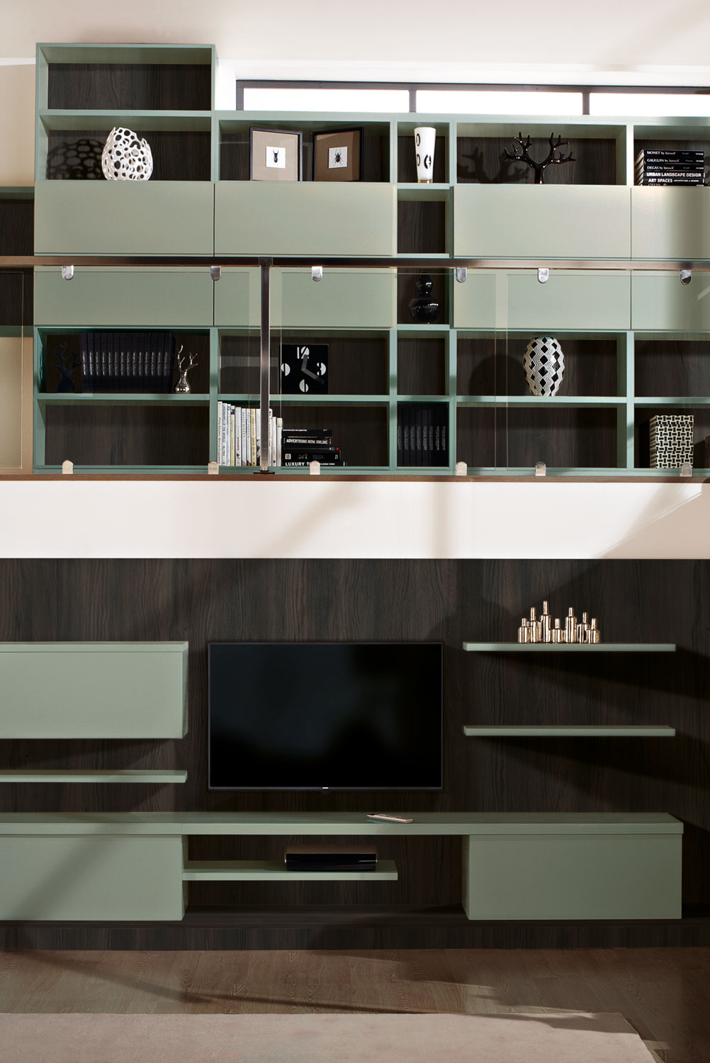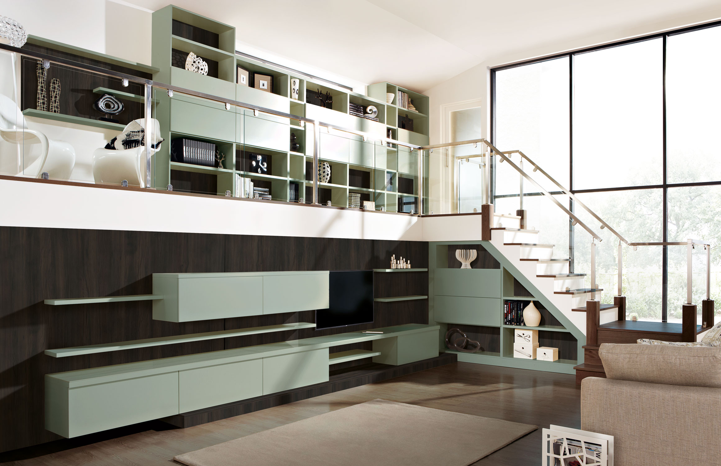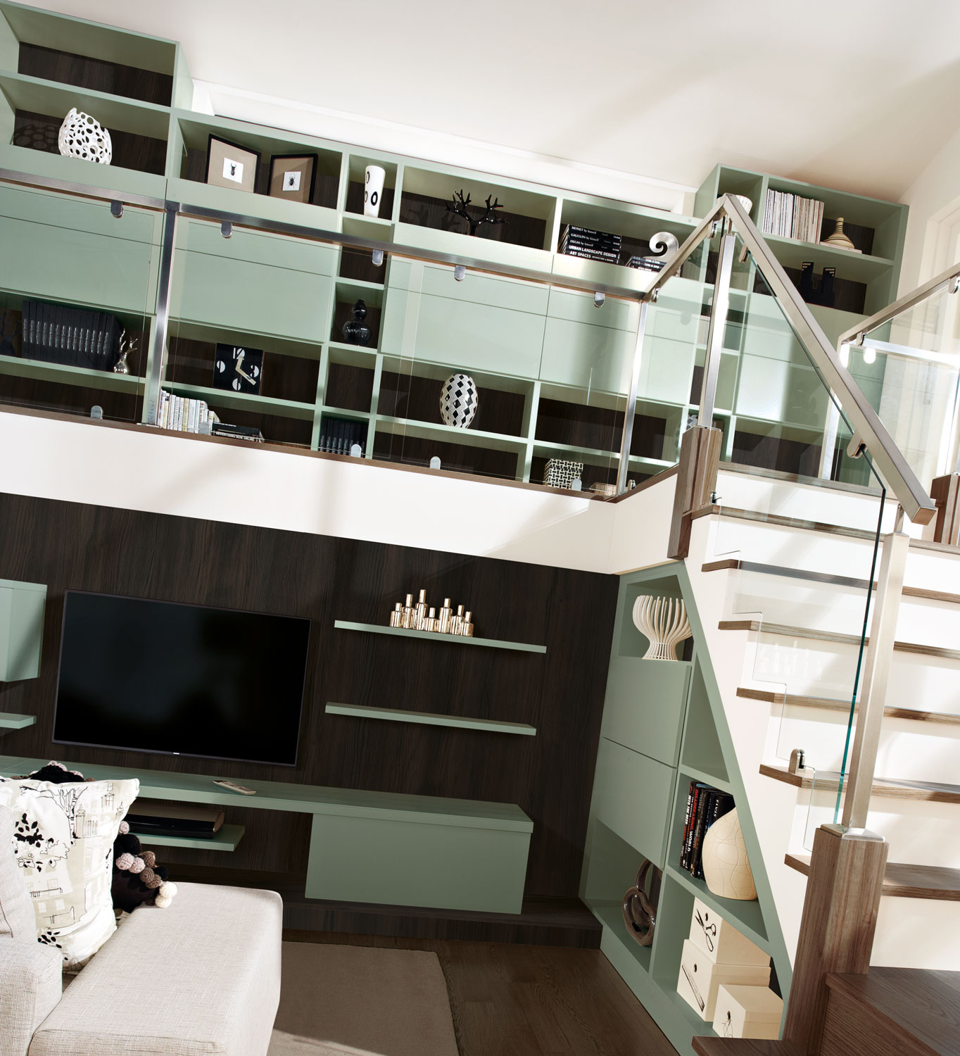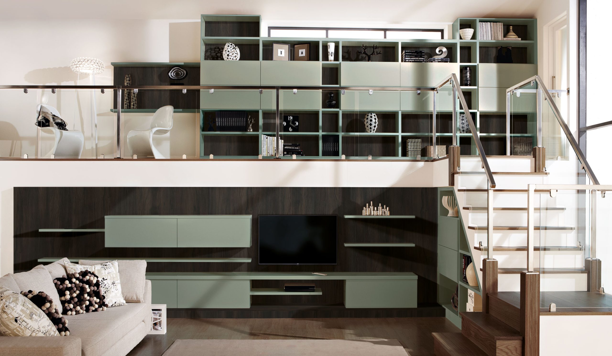 Forming the backdrop for the lower level, bespoke wall panelling unifies the floating shelves and storage with the rest of the furniture for a contemporary finish.