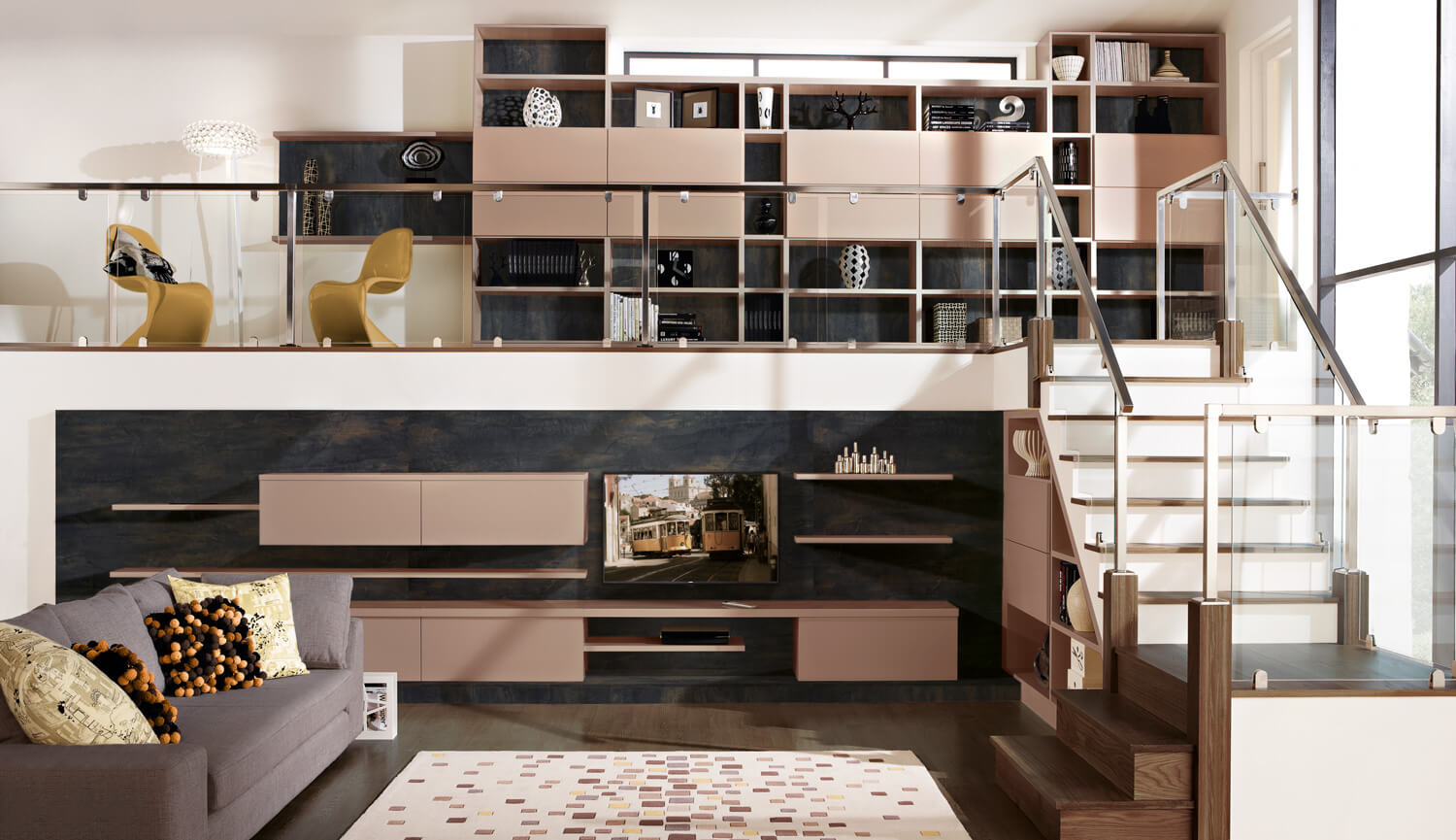 This elegant modern living room taps in to all the latest interior design trends. Simple lines and splashes of colour complement the mix of materials. Meanwhile the mezzanine gallery encompasses both style and functionality. Hide away ample storage space behind contemporary floating units and shelving. Above all, a striking minimalist lounge perfect for any interior design trend setter.