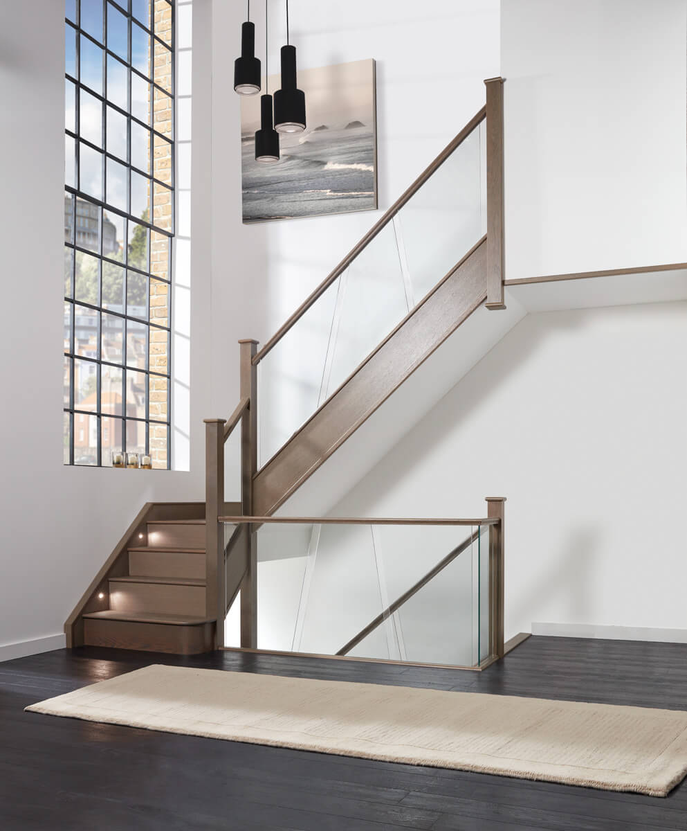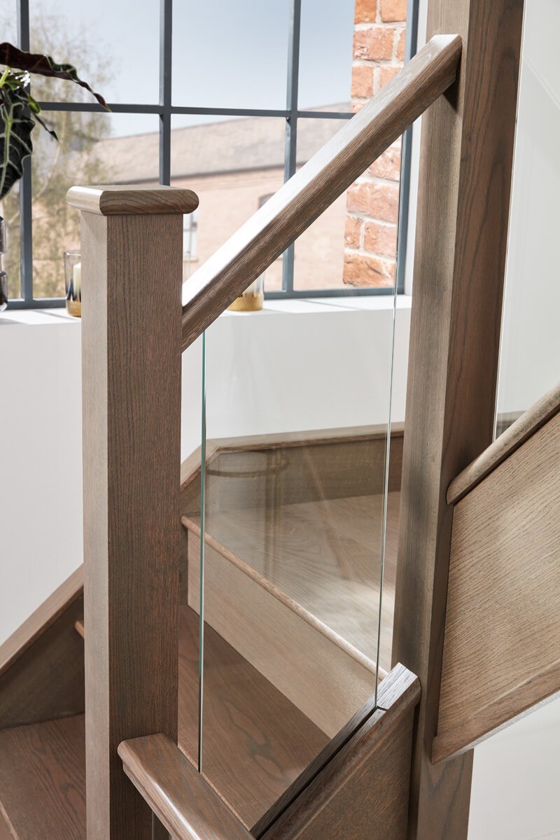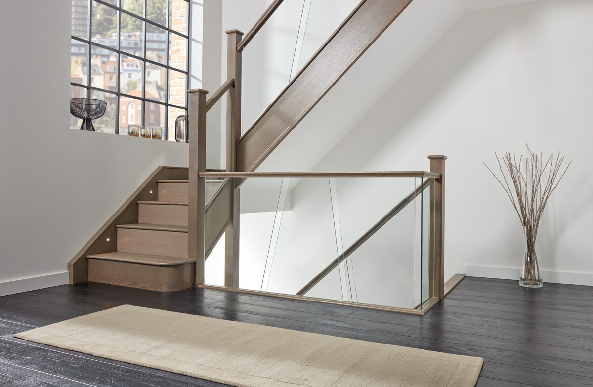 This bespoke staircase incorporating a contemporary glass balustrade design is the perfect finishing touch to any home. Featuring dusted oak treads and risers, LED downlights, and asymmetrical glass panels. A stunning design that perfectly showcases the unique specification and technical precision that goes into each staircase design.