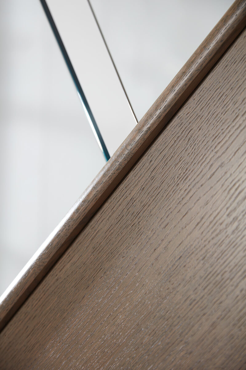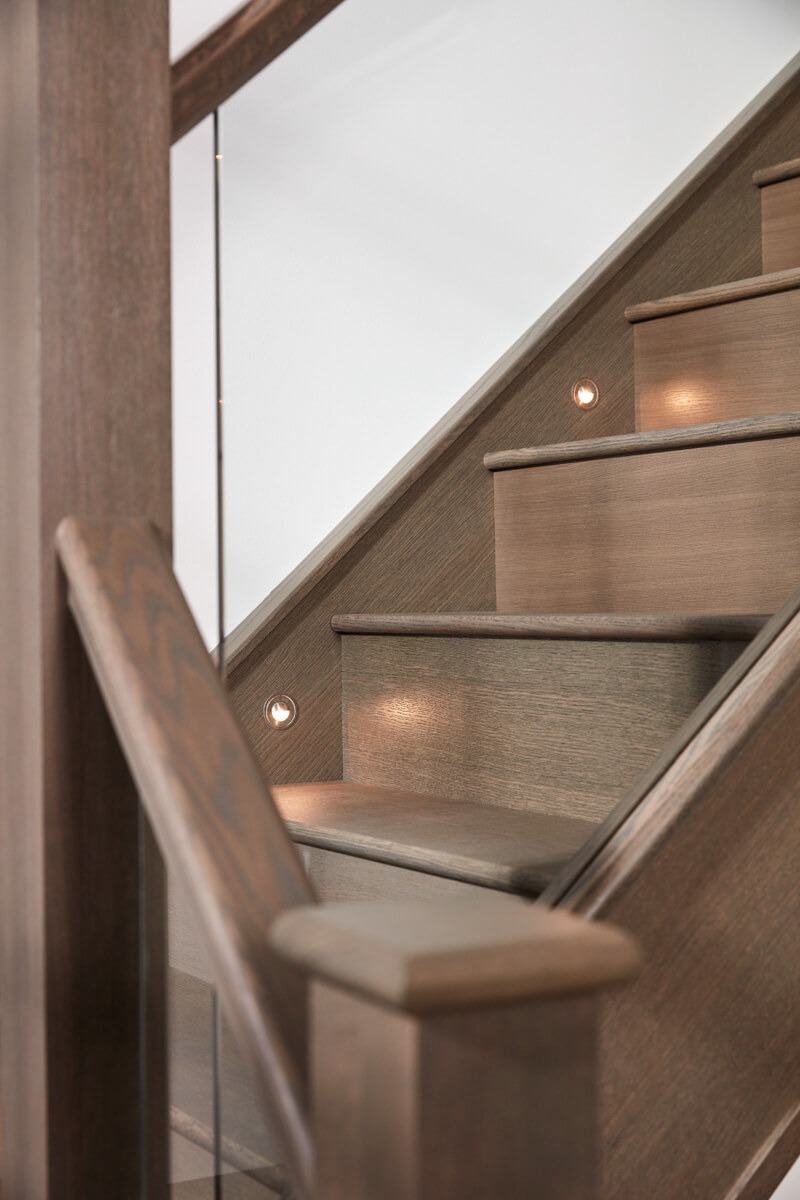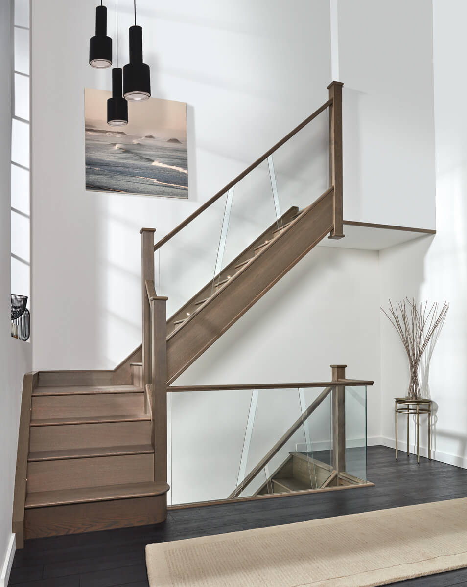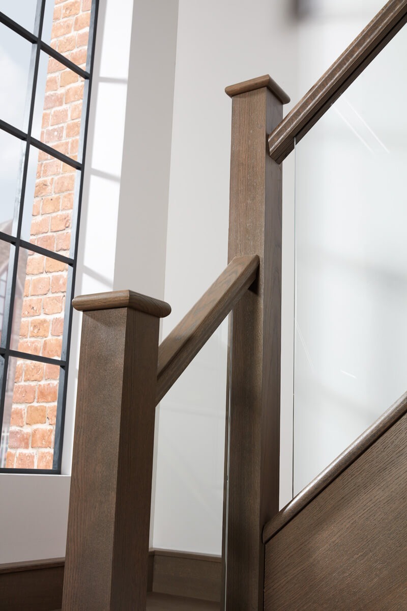 This bespoke staircase incorporating a contemporary glass balustrade design is the perfect finishing touch to any home. Featuring dusted oak treads and risers, LED downlights, and asymmetrical glass panels. A stunning design that perfectly showcases the unique specification and technical precision that goes into each staircase design.