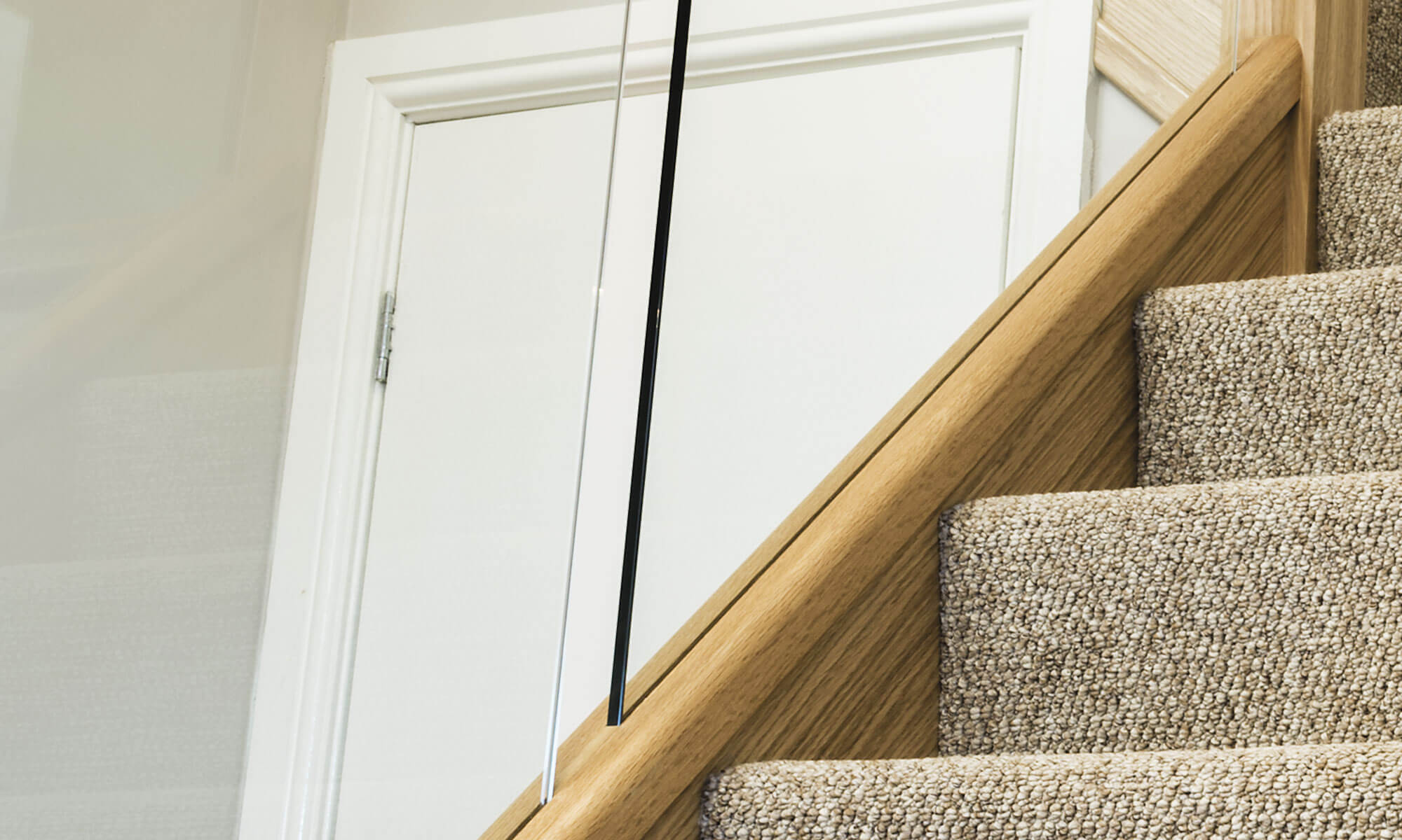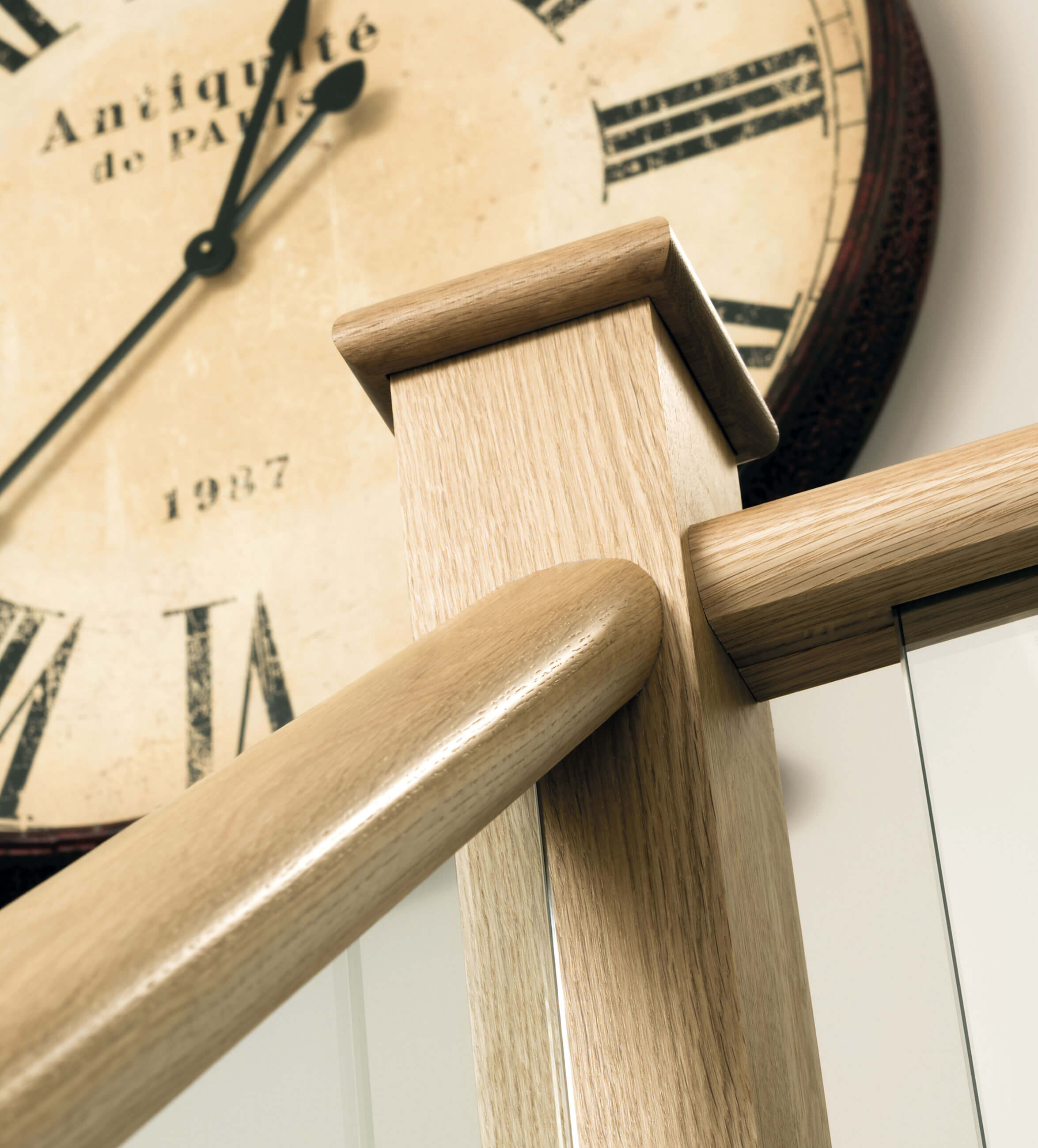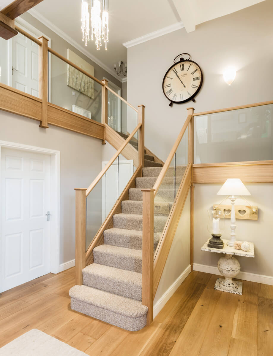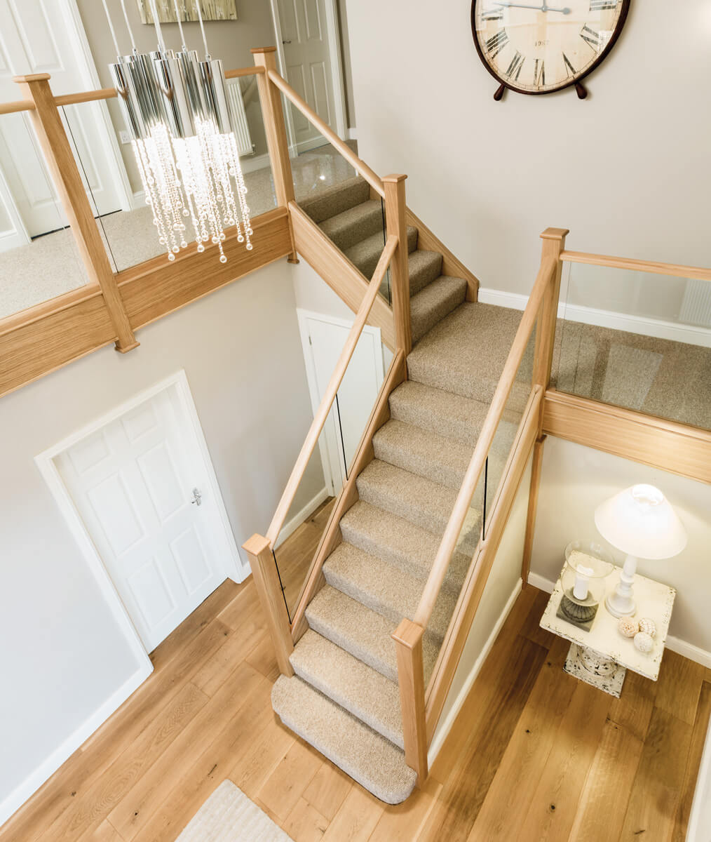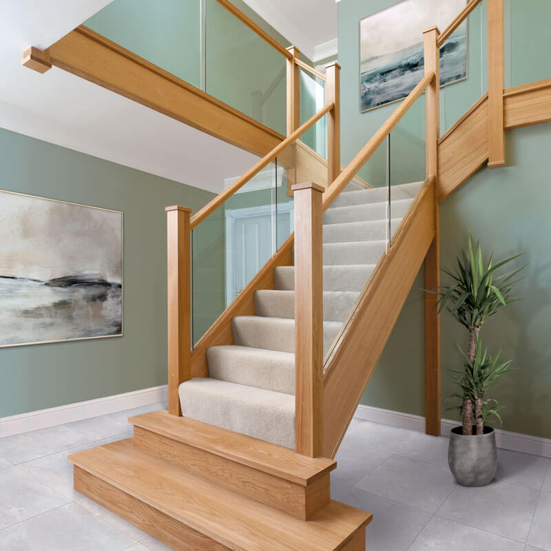 Combining natural oak newels and handrails with panels of glass, the balustrade of this staircase lifts the whole room for a bright, breezy, modern feel. Light can flow freely across all three floors, with no spindles to obstruct the view. This contemporary design has smooth, clean lines that will translate well to any home, regardless of decor scheme. The newels on the upper levels are extended below the base panelling for a subtle twist that draws the eye.