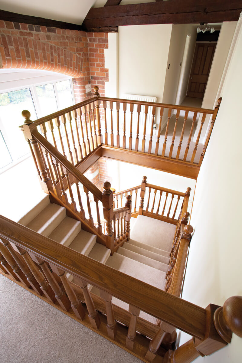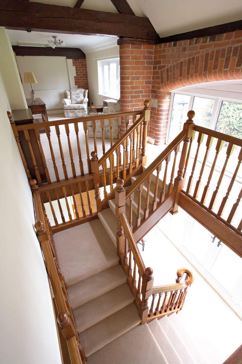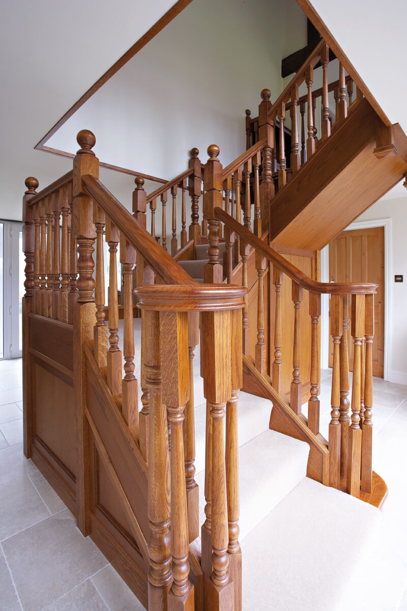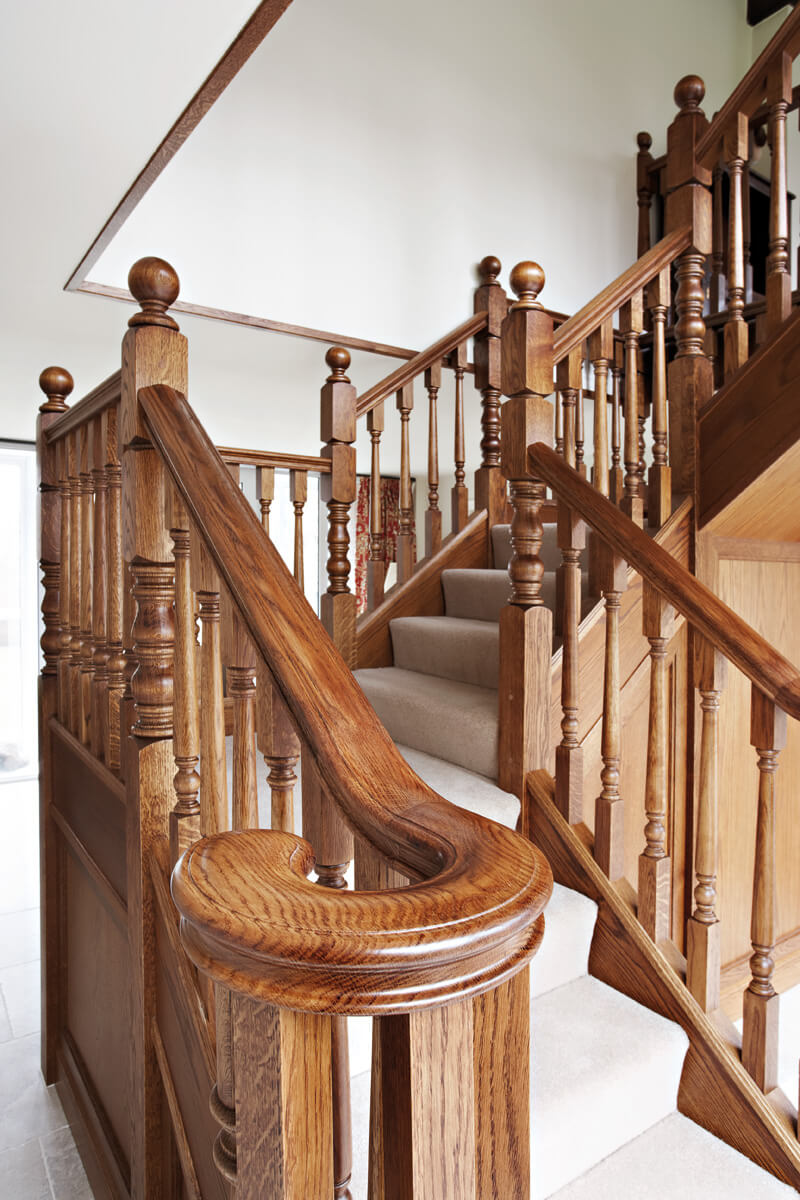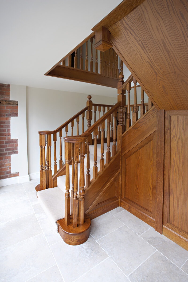 This imposing Tudor Oak staircase makes a dramatic statement in the entryway of the home. The traditional balustrade has been constructed to cover two quarter turns and a balcony, made-to-measure by our talented craftsmen and installed with precision by our skilled installation team. Adding in oak panelling and decorative spindles, the finished result is a grand Tudor-style staircase that looks beautiful in the home.