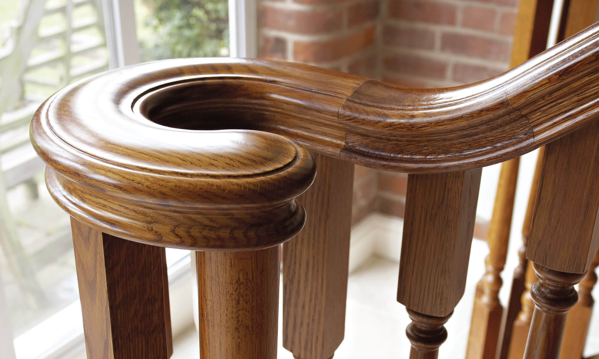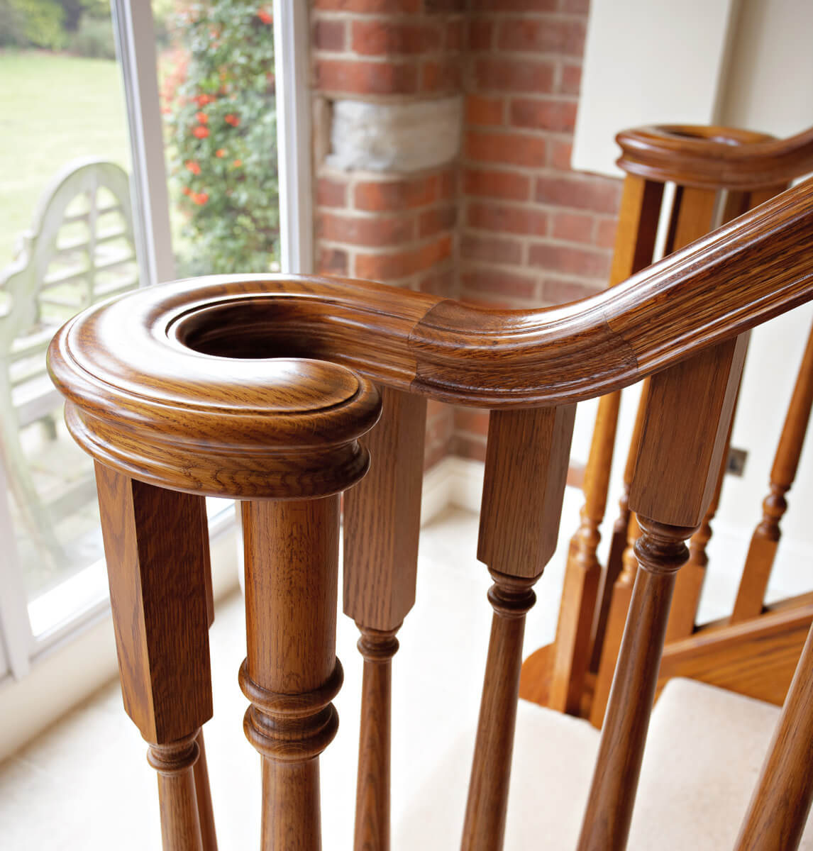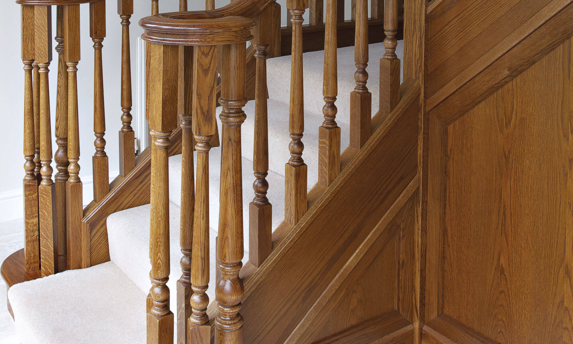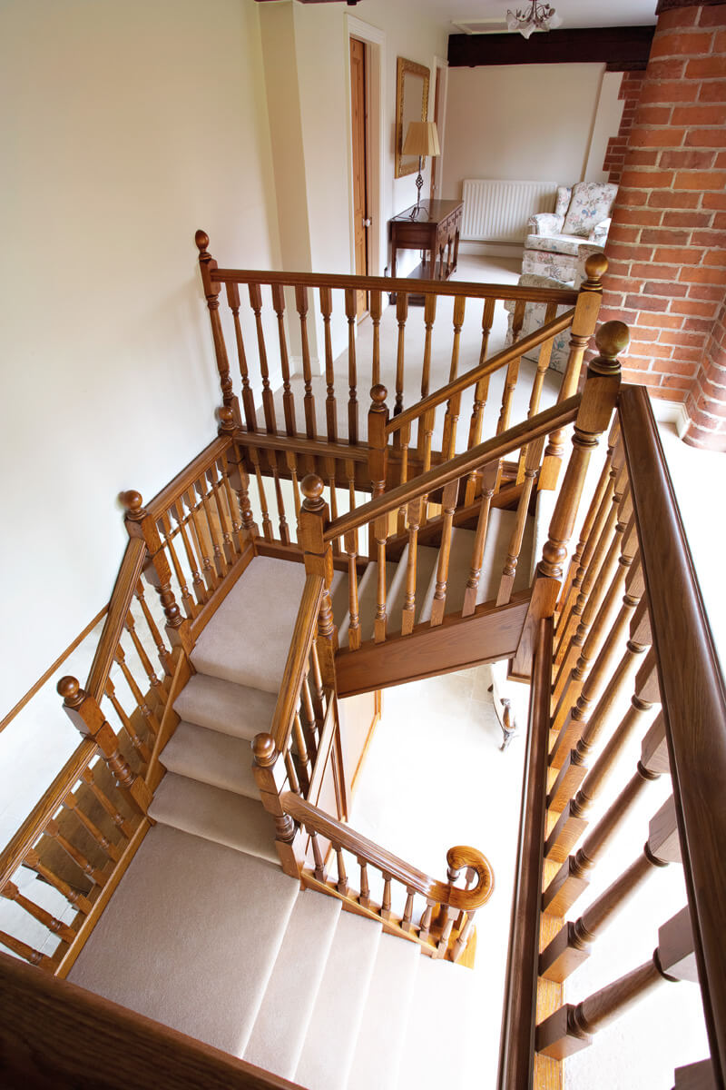 This imposing Tudor Oak staircase makes a dramatic statement in the entryway of the home. The traditional balustrade has been constructed to cover two quarter turns and a balcony, made-to-measure by our talented craftsmen and installed with precision by our skilled installation team. Adding in oak panelling and decorative spindles, the finished result is a grand Tudor-style staircase that looks beautiful in the home.
