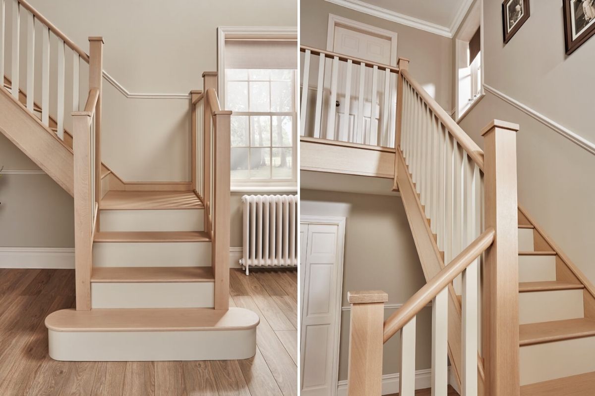 Light grey staircases are perfect for narrow hallways with less natural light, keeping your space bright and airy. Glass panels or steel balustrades can add a modern touch and let more light into your home. This painted staircase features a very light neutral grey to complement the use of natural oak on the base rail, hand rail and newel post.