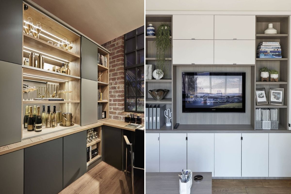 Why not build a hidden bar into your cabinets for a fun, contemporary feature in dual-purpose spaces? Sliding doors conceal the area during the day, letting you switch between business and pleasure in seconds.