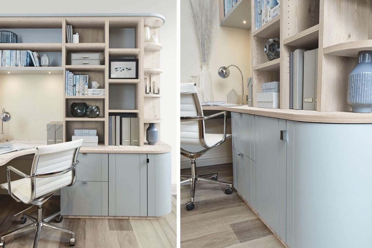 There are many ways to improve the functionality and appearance of your home office. Curved cabinets add a softer finish, ideal for corner desks. Angled shelving and bespoke built-in cupboards can be added above the desk to maximise storage whilst adding a unique design feature to the space. This works particularly well for an under-stairs study or modern loft home office.