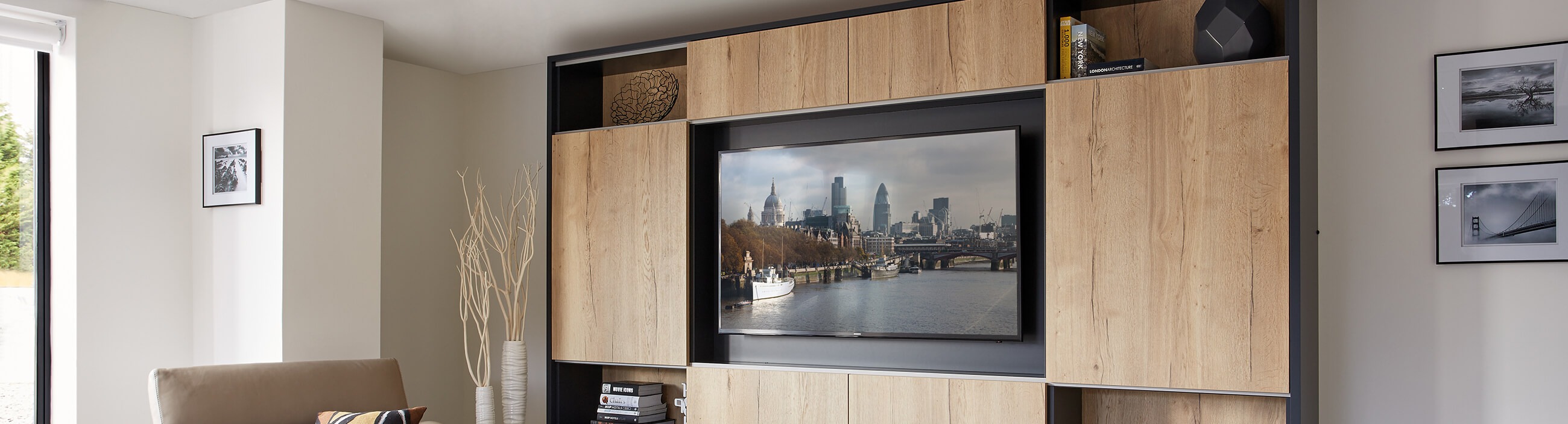 A well-considered design makes efficient use of unused nooks and quirky corners, turning family rooms into places that aren’t just comfortable but stylishly practical and well-loved. We all hate organising media in our lounges, for when you have guests around for a relaxing night in, hide away unsightly technology and wiring behind cupboard doors to keep a sleek, seamless space.
