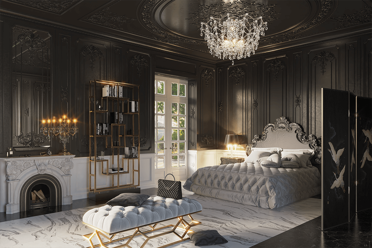 Known to rarely be seen wearing anything other than black and white, to this day, Coco Chanel is known for her luxurious style and this bedroom, with its black surfaces, clean lines and plush textures, certainly mirrors that style.