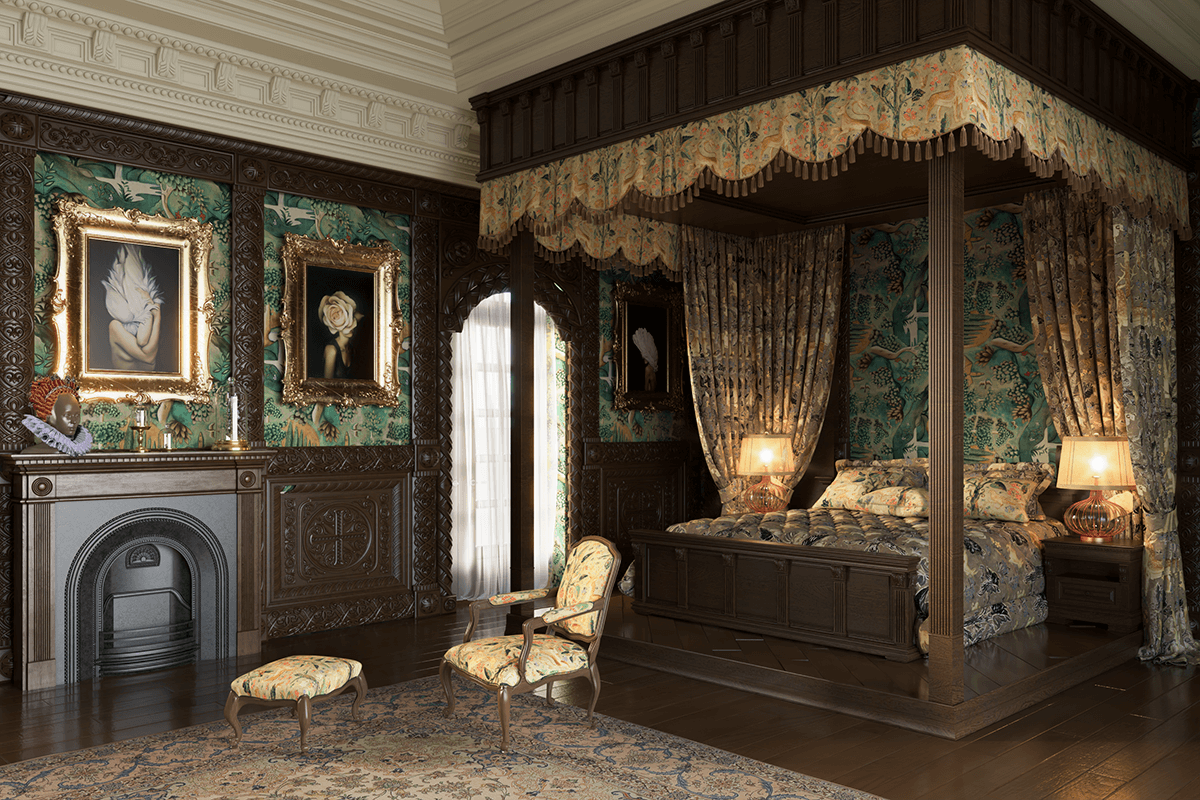 To add our modern take on this Elizabethan bedroom we have included bold colours and patterns in our wallpaper as well as beautifully intricate coving across the ceiling and walls which would be the envy of any interior design guru today.