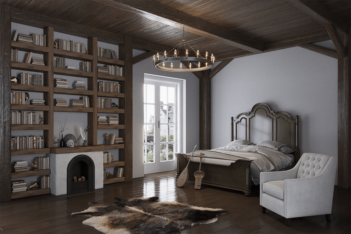 Taking inspiration from wooden materials and the home in Stratford Upon Avon, which is believed to be Shakespeare’s birthplace, we have designed a contemporary bedroom using plush wooden flooring, wooden beams and ceiling, as well as an opulent wooden bed frame and chandelier.