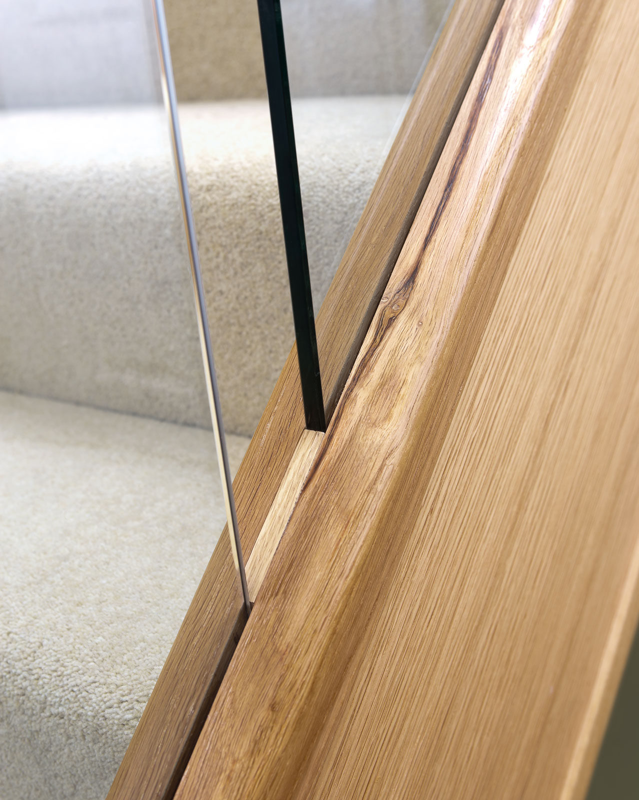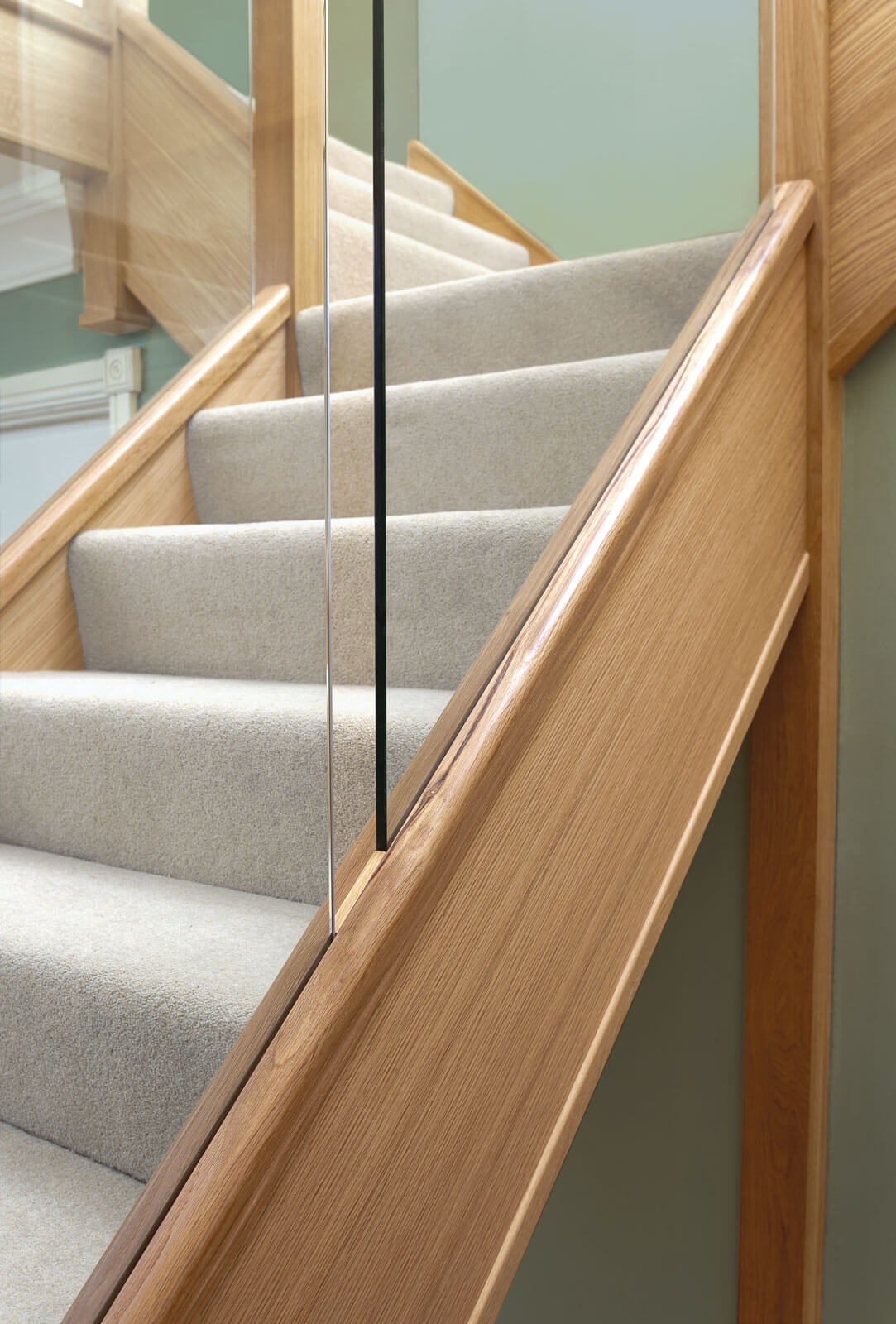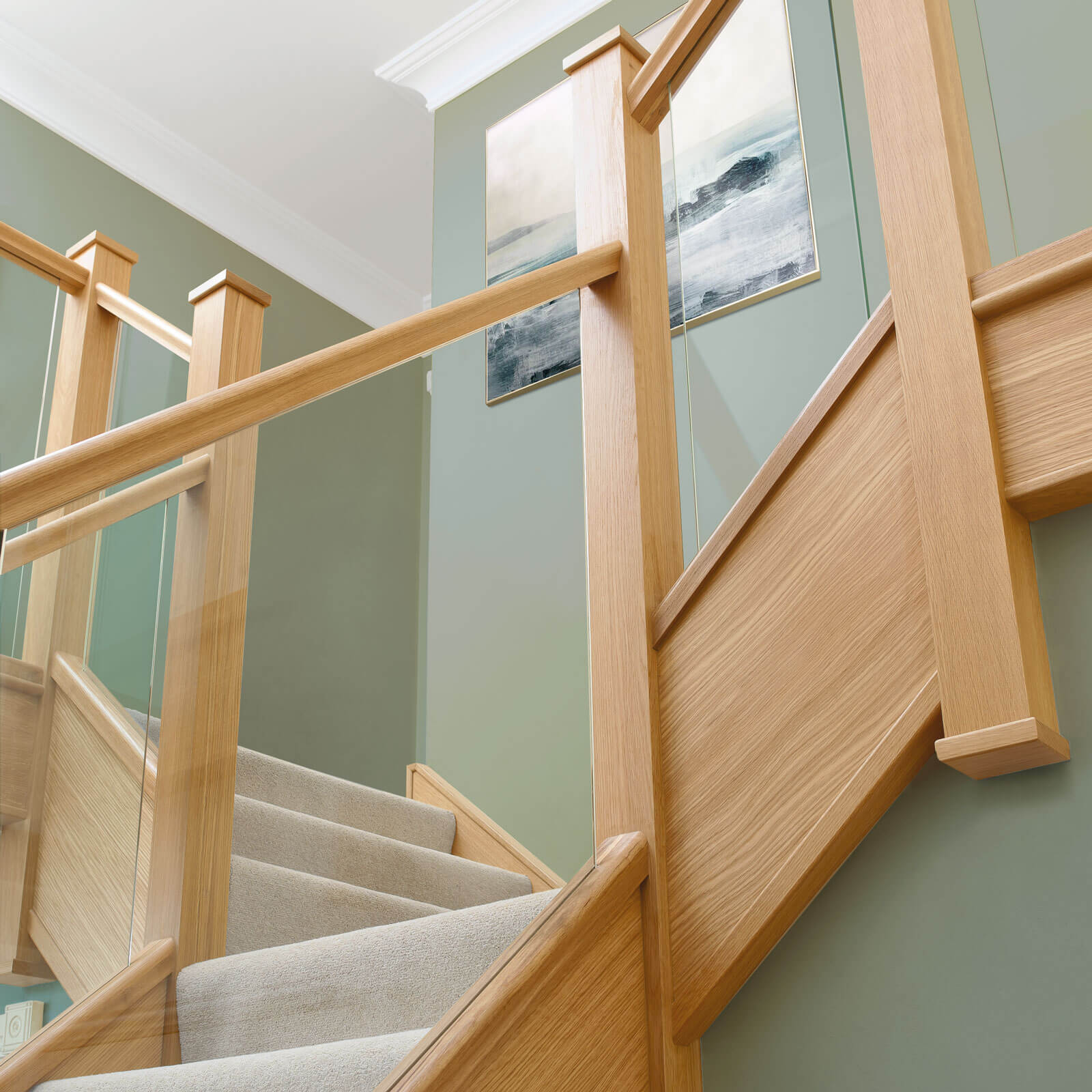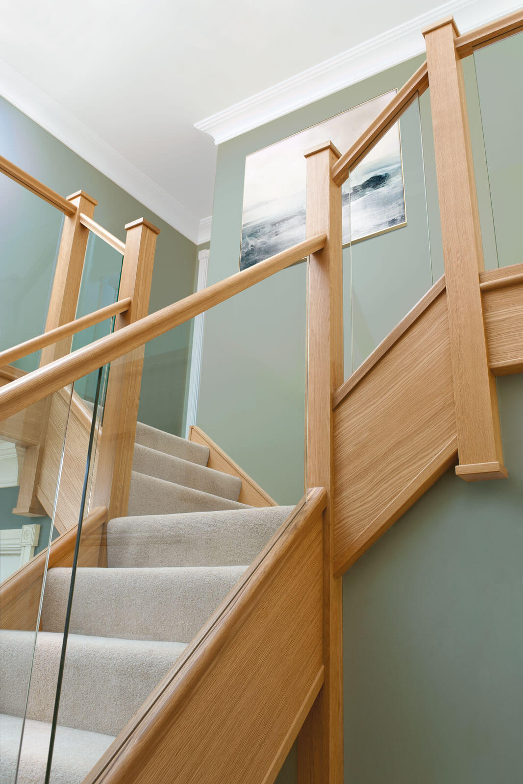 This natural oak staircase renovation has integrated glass panels instead of traditional spindles. These strong panes of glass are secured to the handrail and base without the need for brackets, ensuring a safe and sturdy construction with a streamlined appearance. The simplistic, classic design in this example is complemented by square newel caps and minimal detailing for a modern, clean finish.
