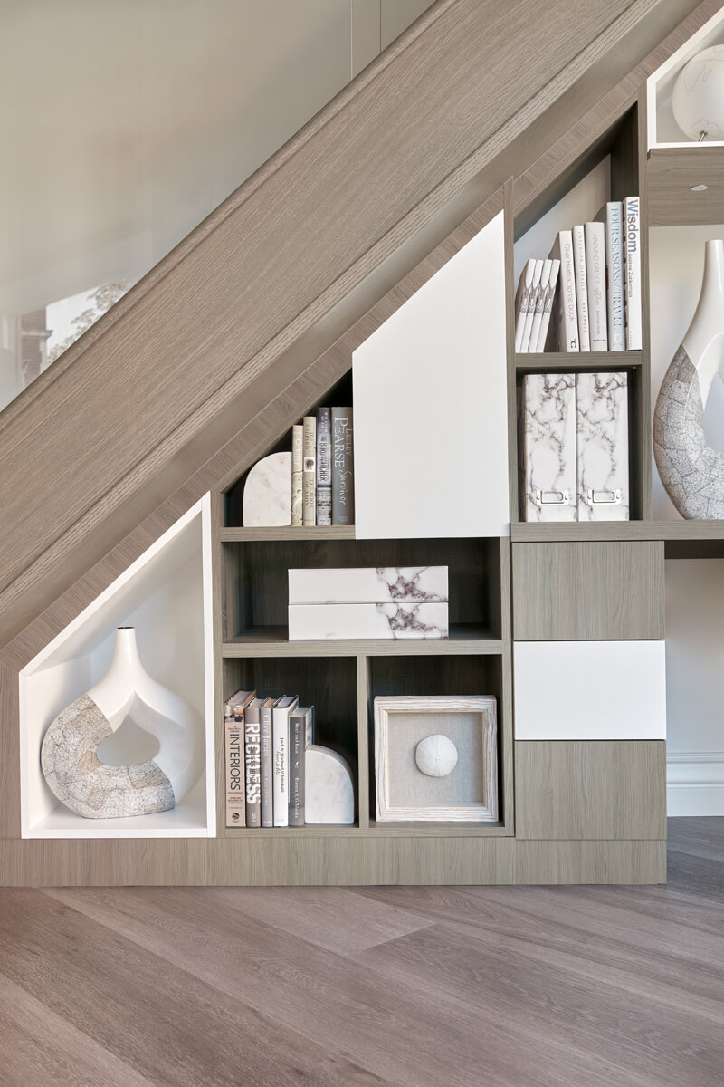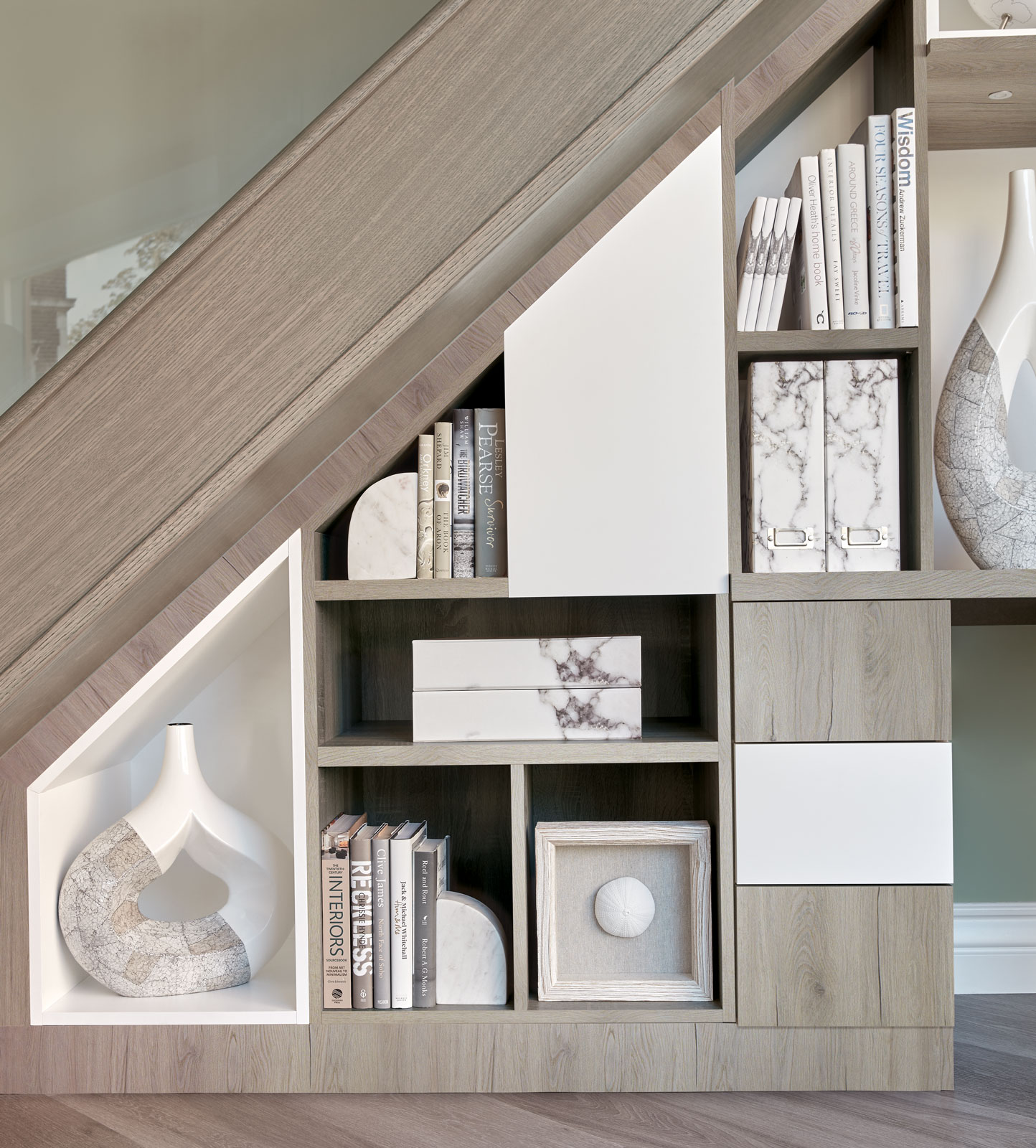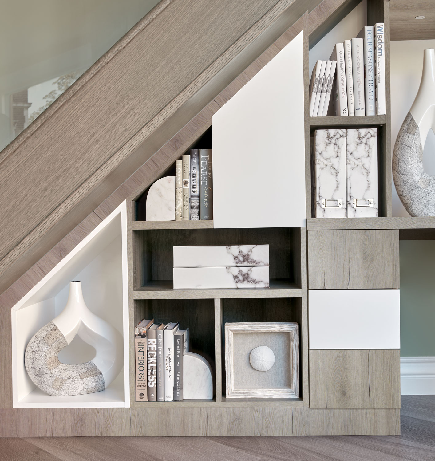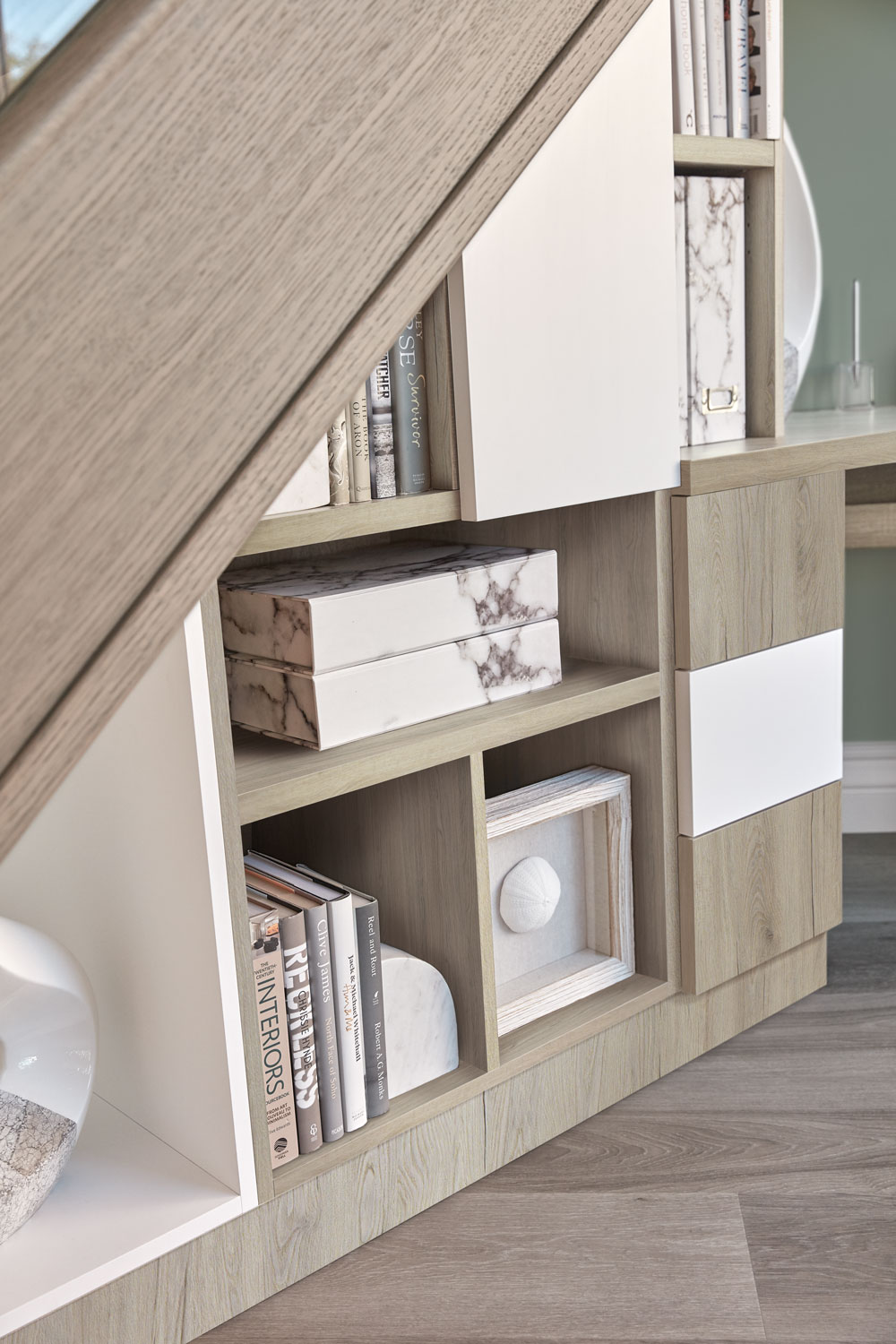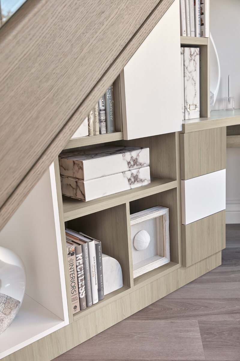 This under stairs flows seamlessly with the staircase, using the same materials. Designers have maximised space in the alcove of the under stairs with a made-to-measure precision. For example, storage cupboards and desk with curved details create an elegant look. This under stairs office includes beautiful bespoke cabinetry with display shelving. Thus, creating not only a beautiful office, but a sophisticated talking point. Our under stairs study comes in a range of colours and finishes.