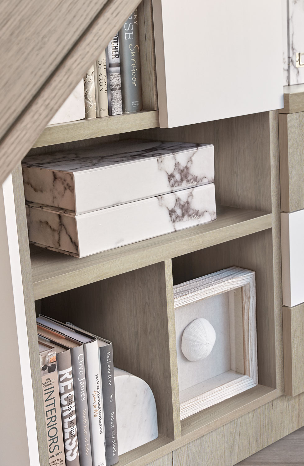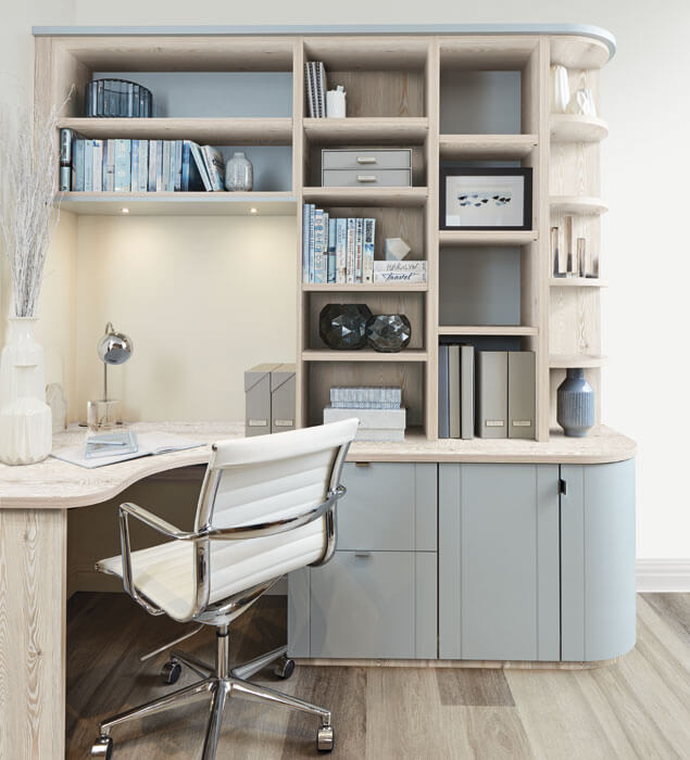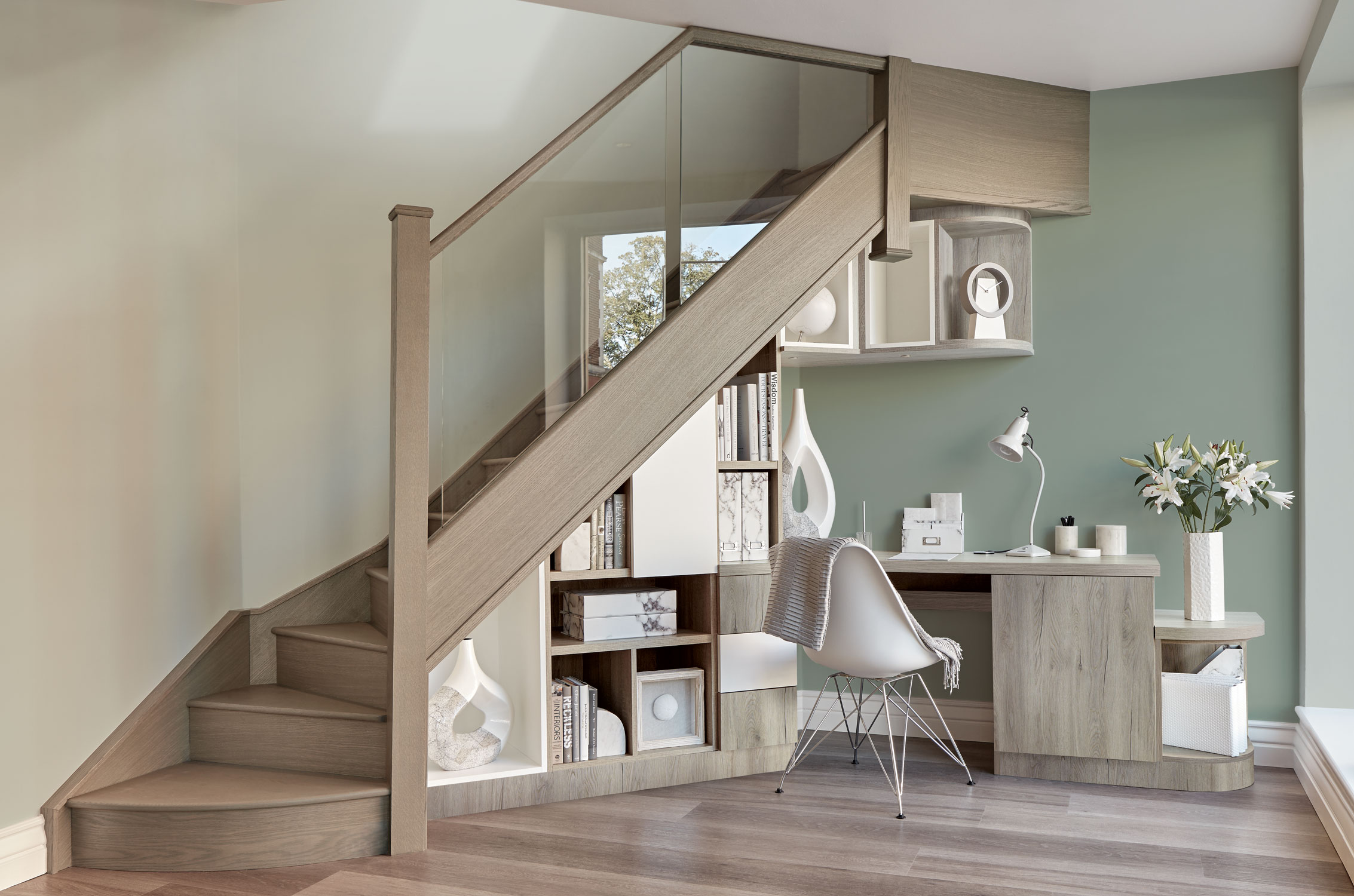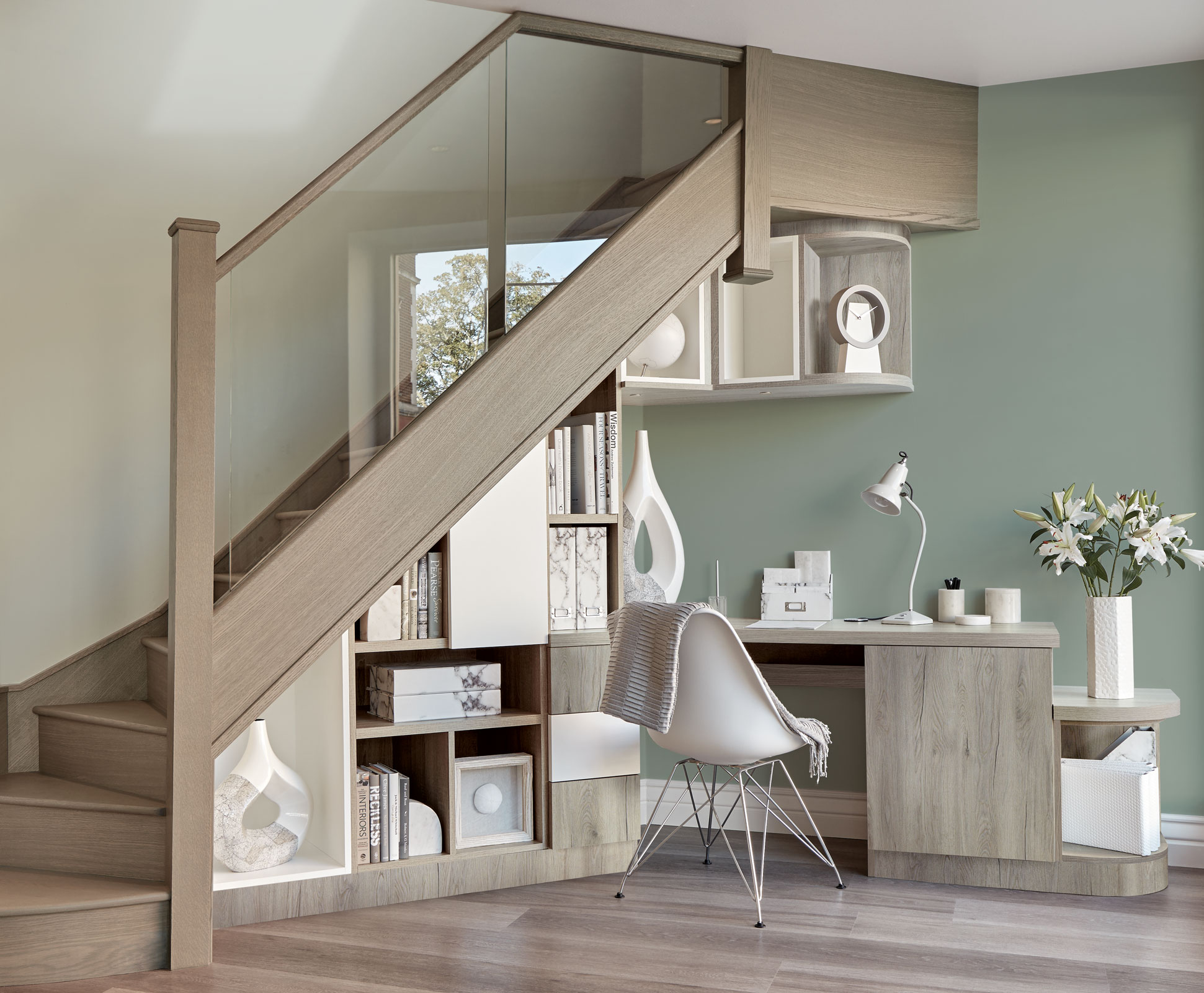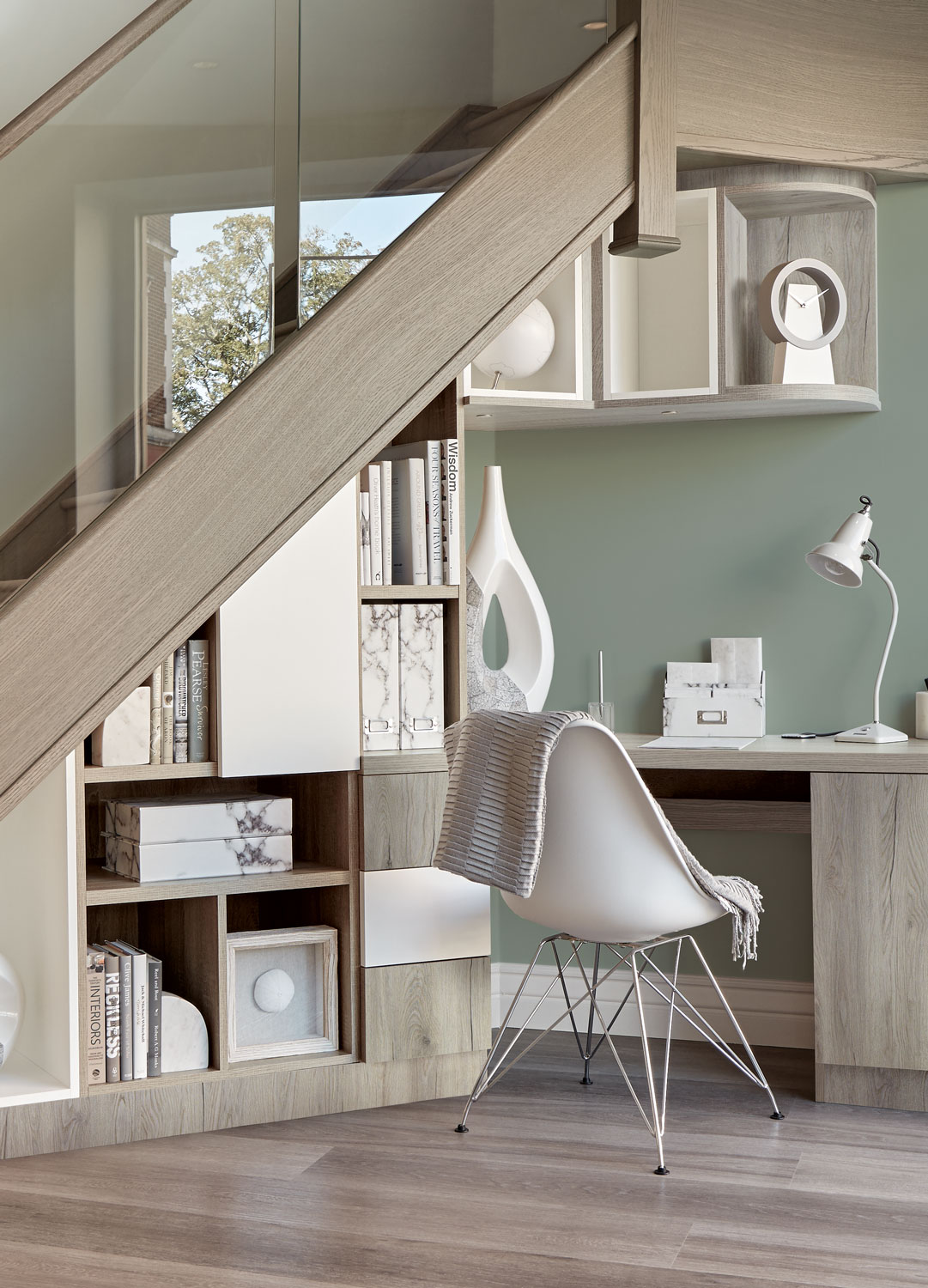 This under stairs flows seamlessly with the staircase, using the same materials. Designers have maximised space in the alcove of the under stairs with a made-to-measure precision. For example, storage cupboards and desk with curved details create an elegant look. This under stairs office includes beautiful bespoke cabinetry with display shelving. Thus, creating not only a beautiful office, but a sophisticated talking point. Our under stairs study comes in a range of colours and finishes.