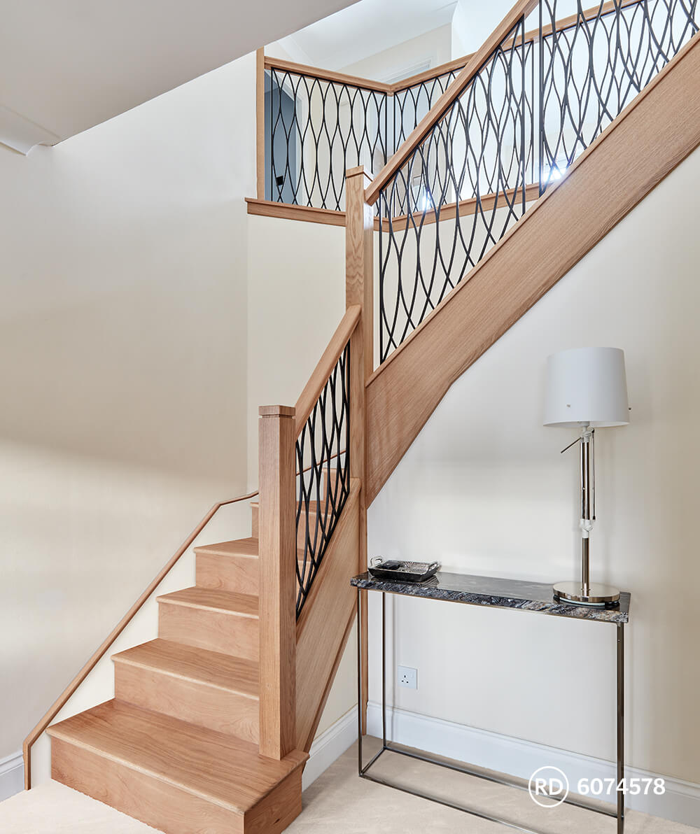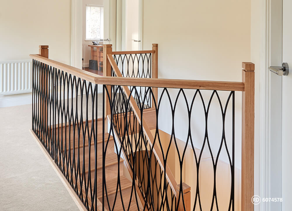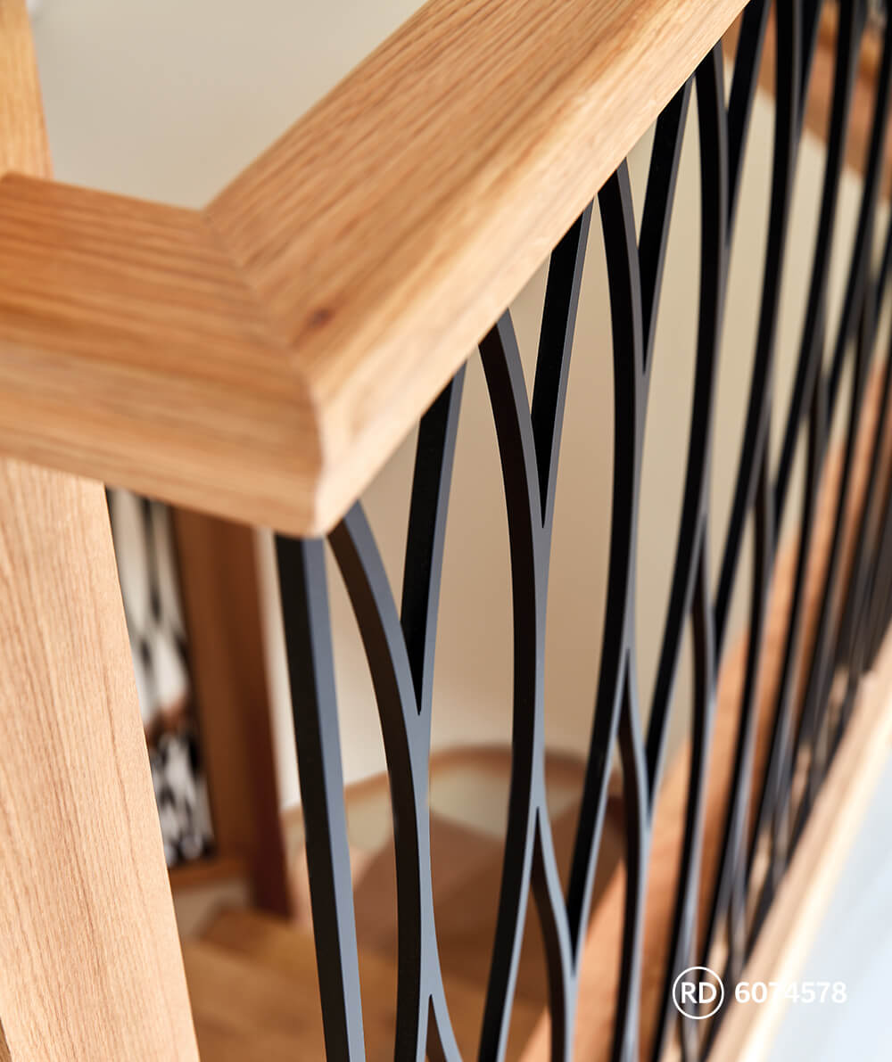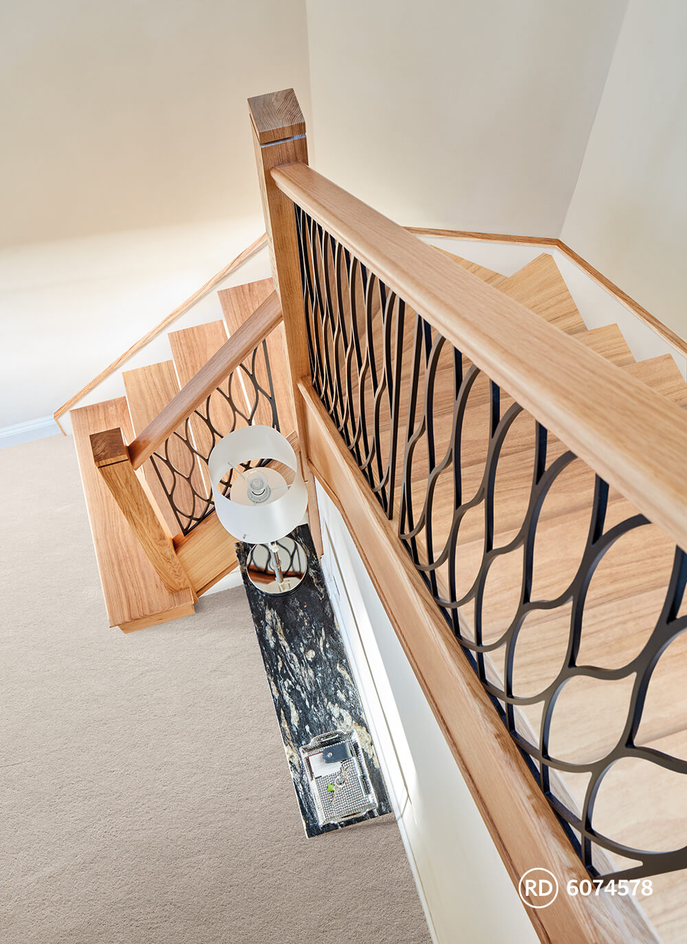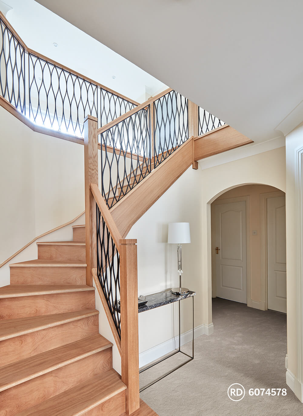 The staircase is at the heart of the house, so it’s important it still feels welcoming and works well with the rest of the property. As a contrast to the dark laser-cut spindles, a light oak finish was used for the handrails, risers, newel posts and threads giving the space a contemporary yet warm feel.