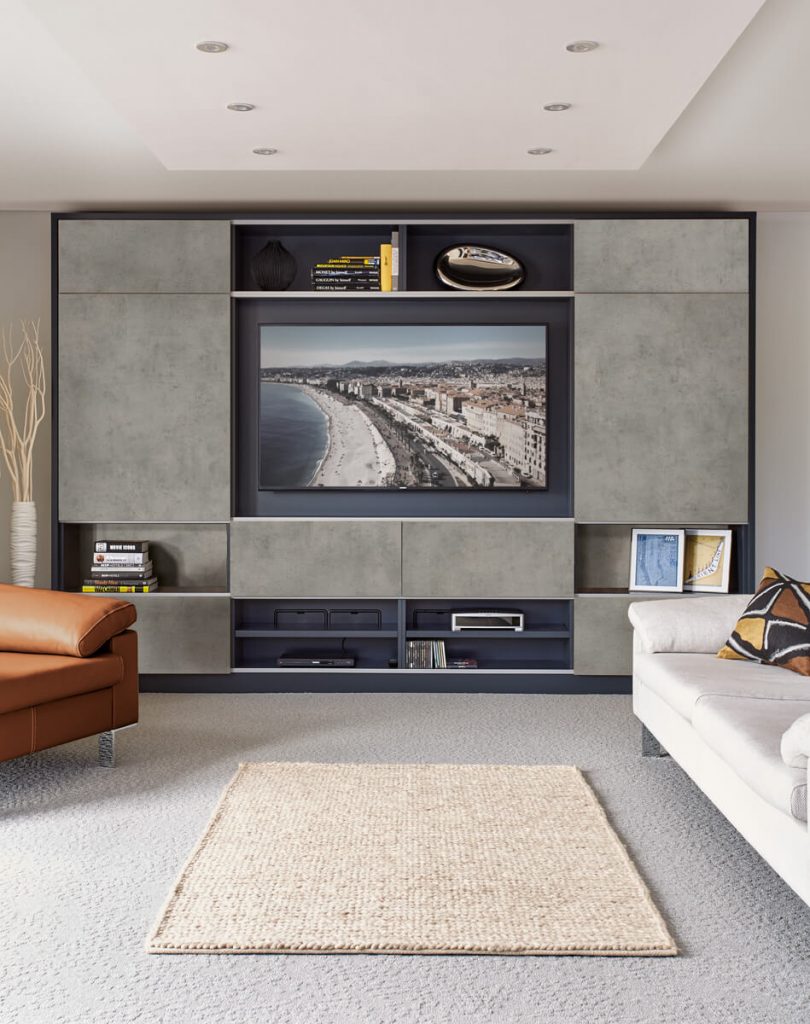 Fitted with our exclusive Levigo sliding doors, this versatile storage combination can be configured at a touch, smoothly transforming the function of this space from home cinema to games room; home library to showcase.