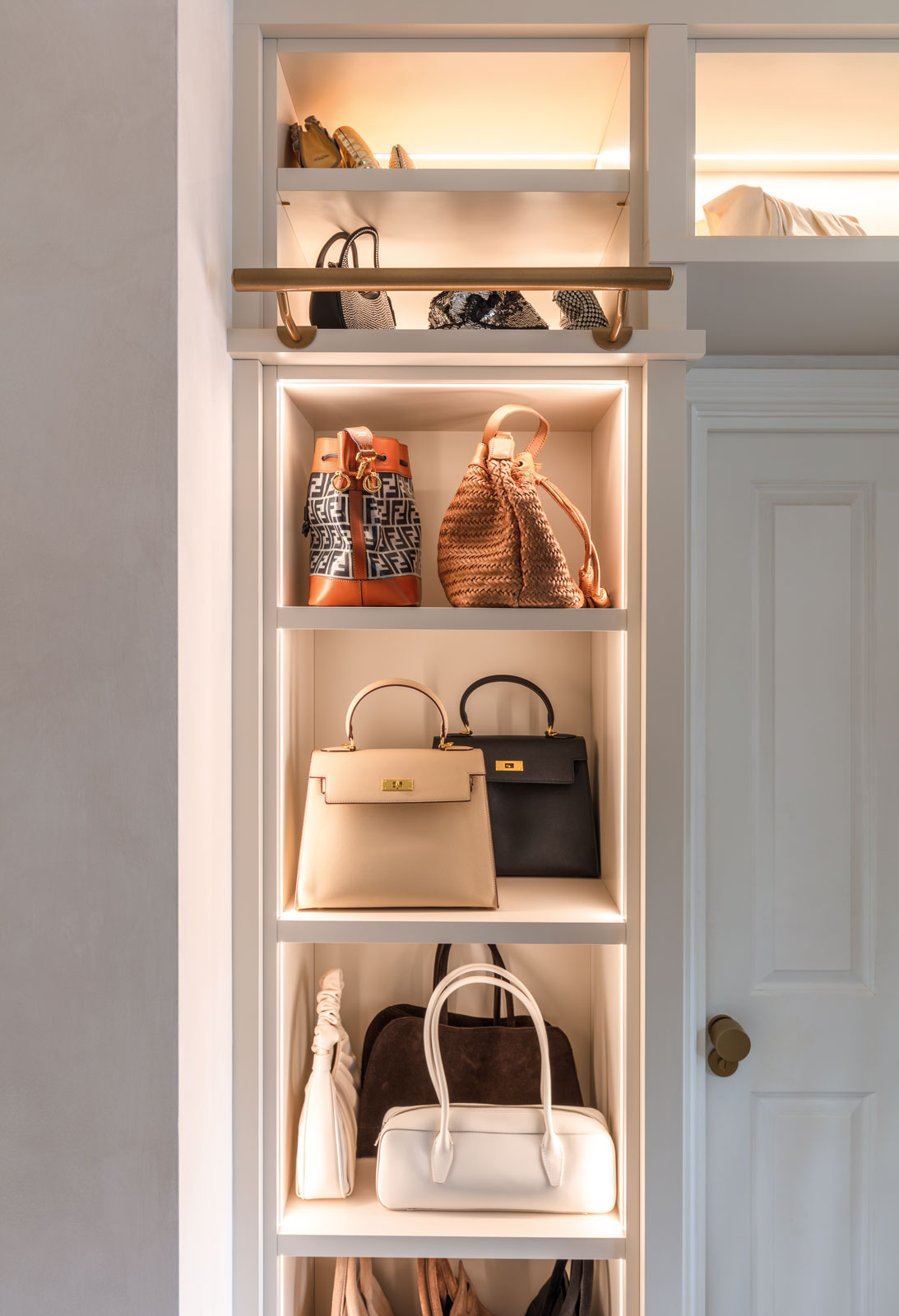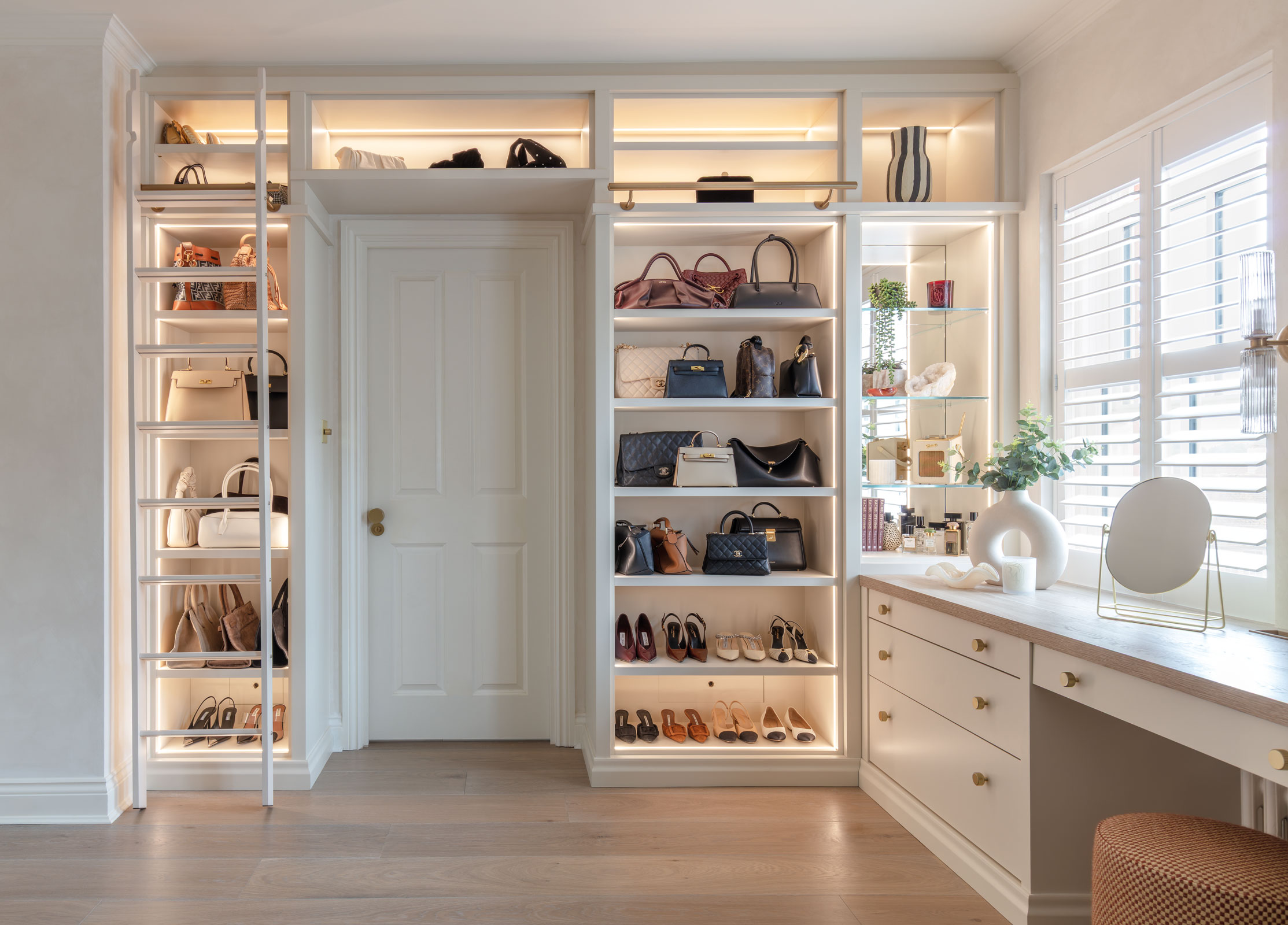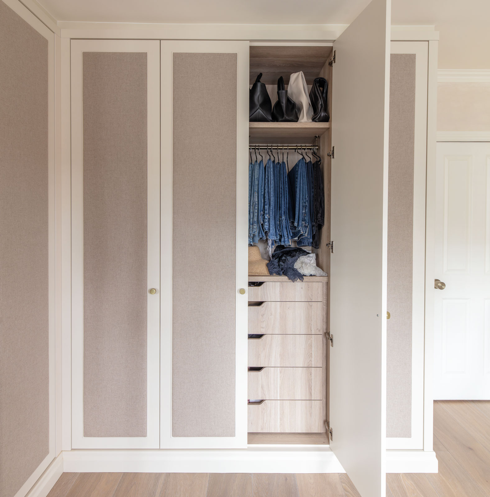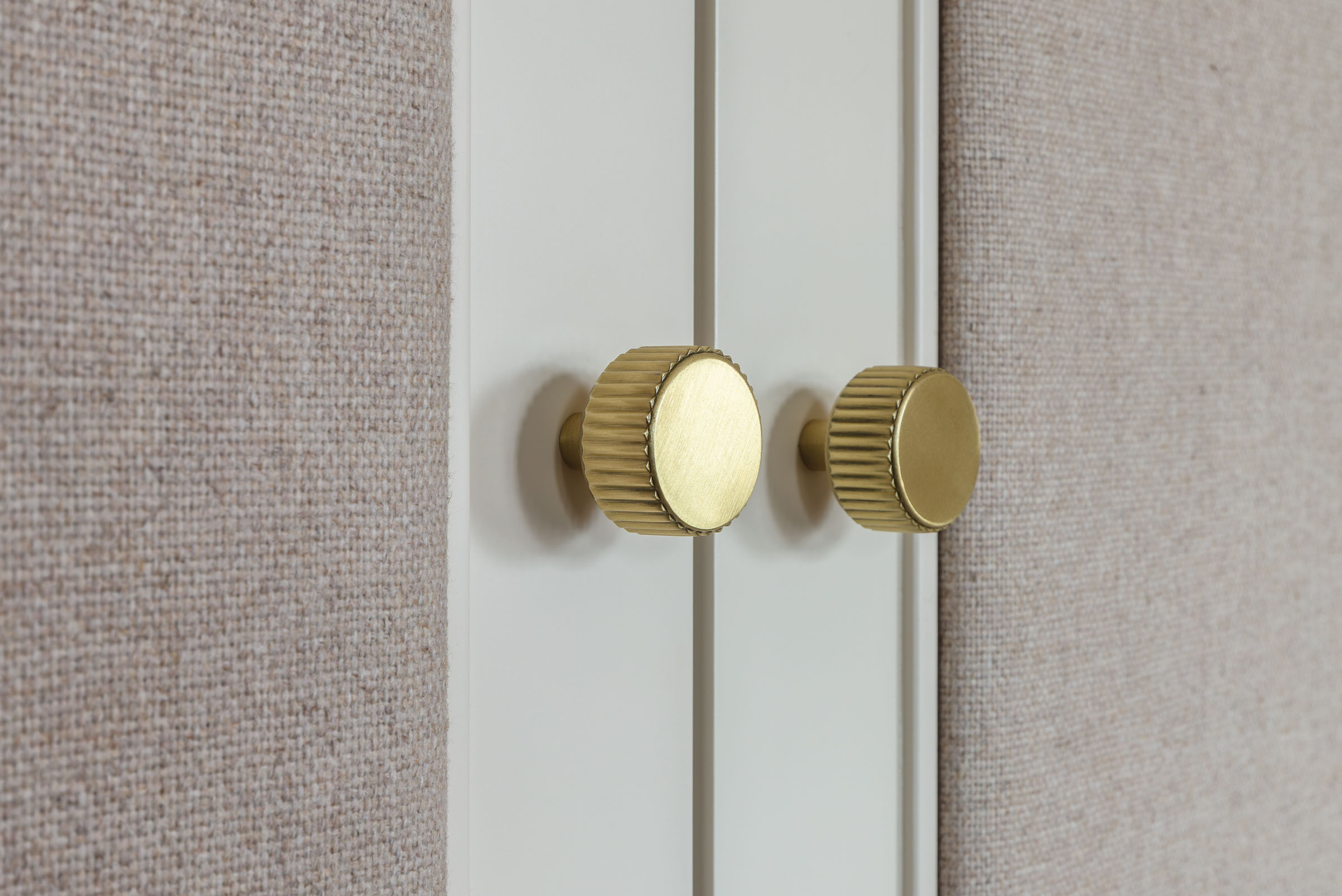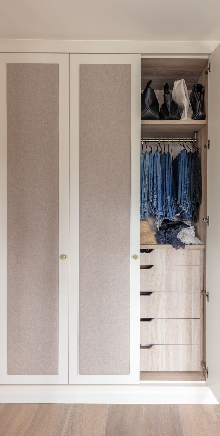 This luxury dressing room is defined by its considered and thoughtful design features, including over-door storage and integrated lighting to highlight a treasured collection of bags and shoes. Painted in our soft Mayflower, the neutral colour palette brings a sense of calm and understated luxury to the space. The design also features our padded Henley doors, a textured door fitted from floor to ceiling to maximise space and enhance the room’s depth.
