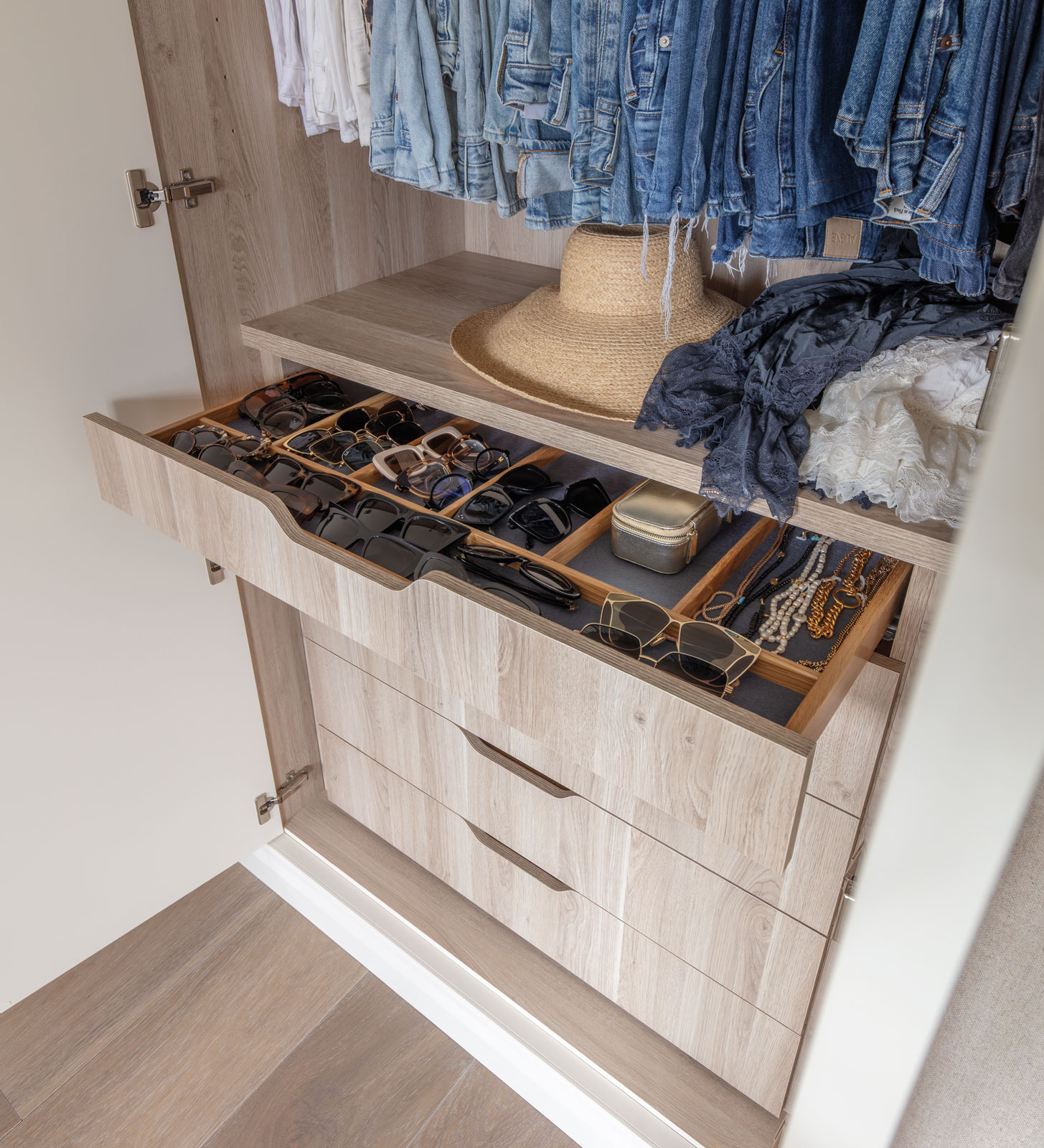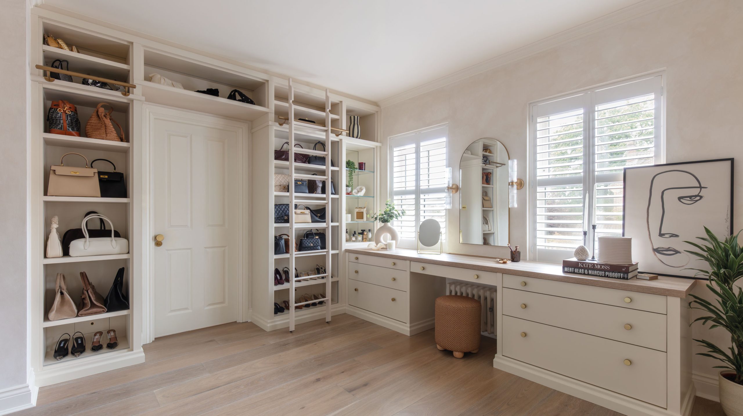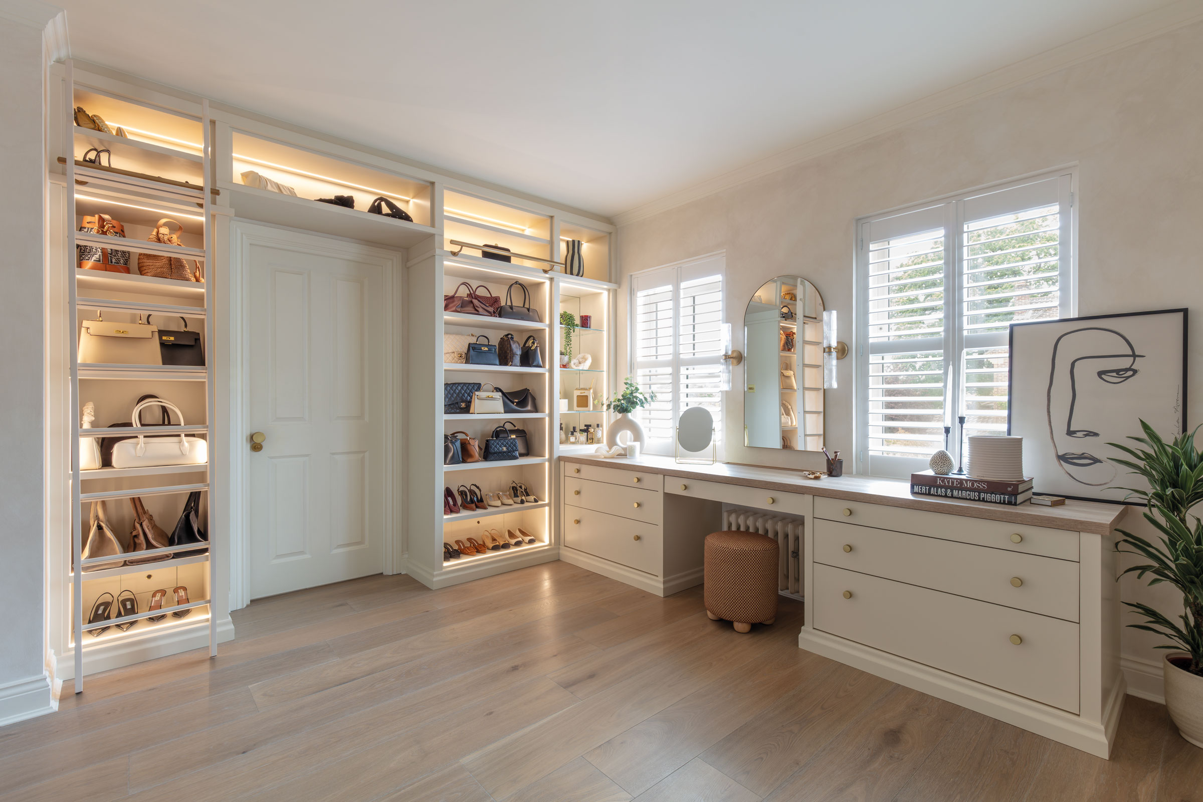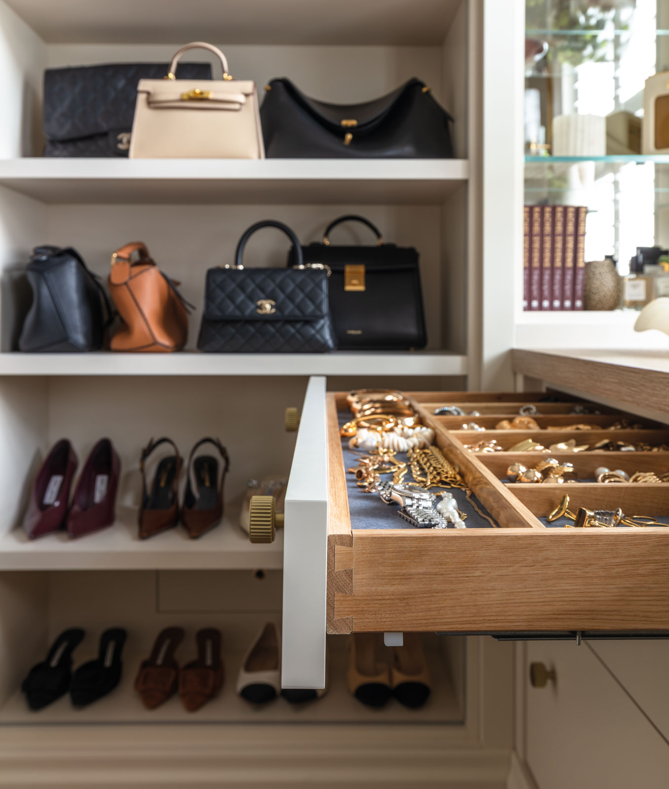 This luxury dressing room is defined by its considered and thoughtful design features, including over-door storage and integrated lighting to highlight a treasured collection of bags and shoes. Painted in our soft Mayflower, the neutral colour palette brings a sense of calm and understated luxury to the space. The design also features our padded Henley doors, a textured door fitted from floor to ceiling to maximise space and enhance the room’s depth.