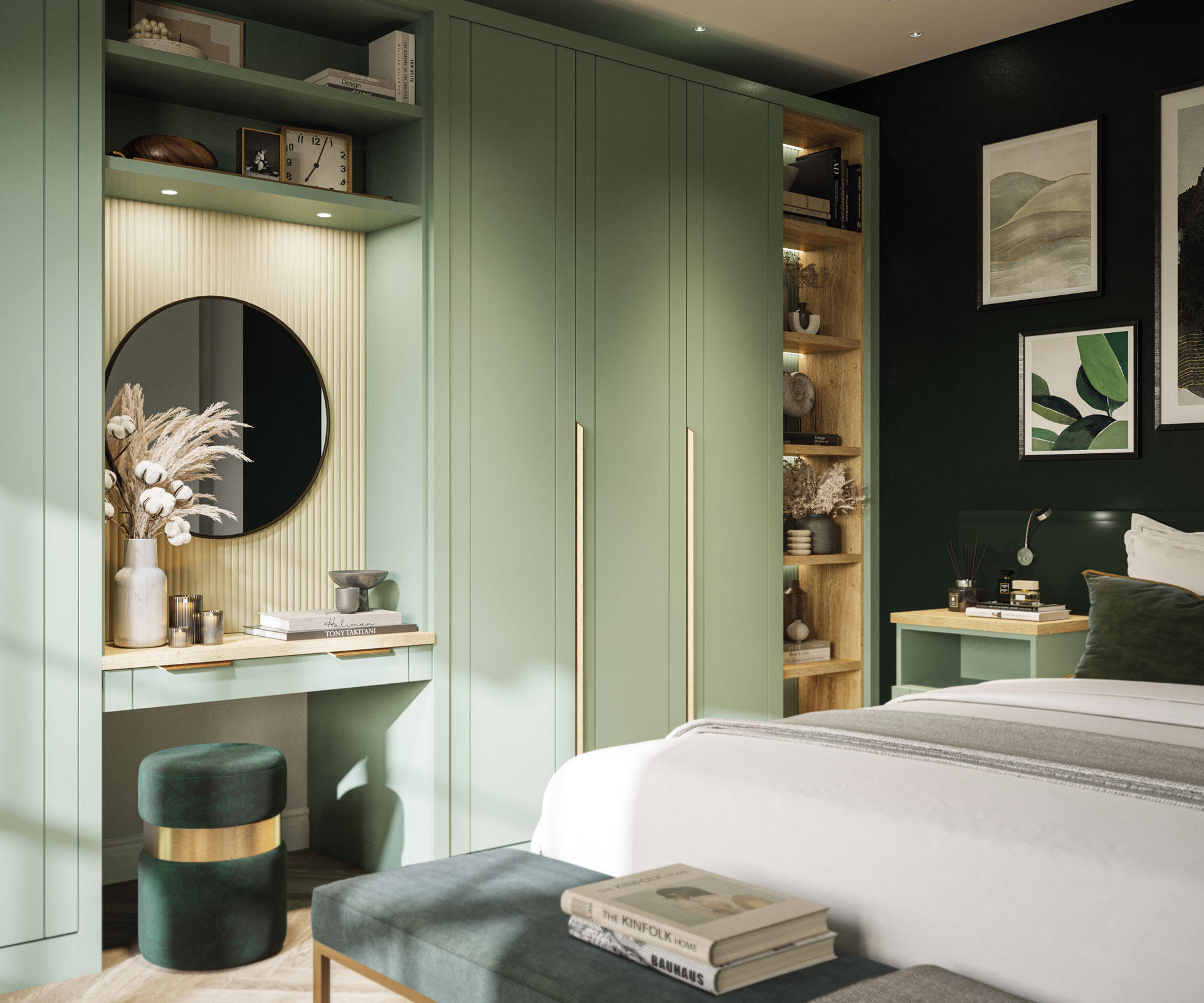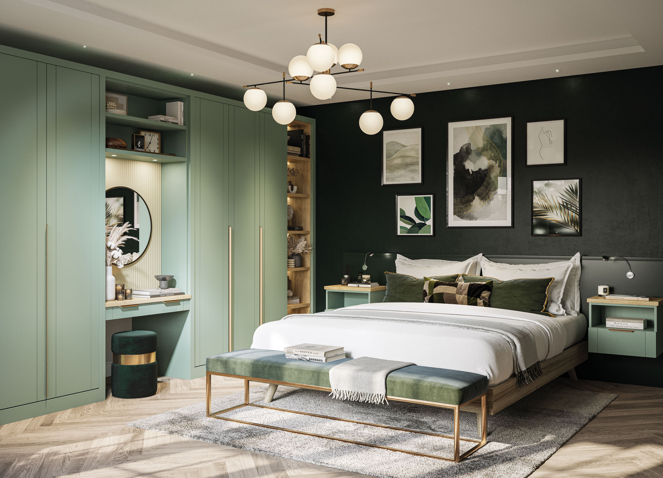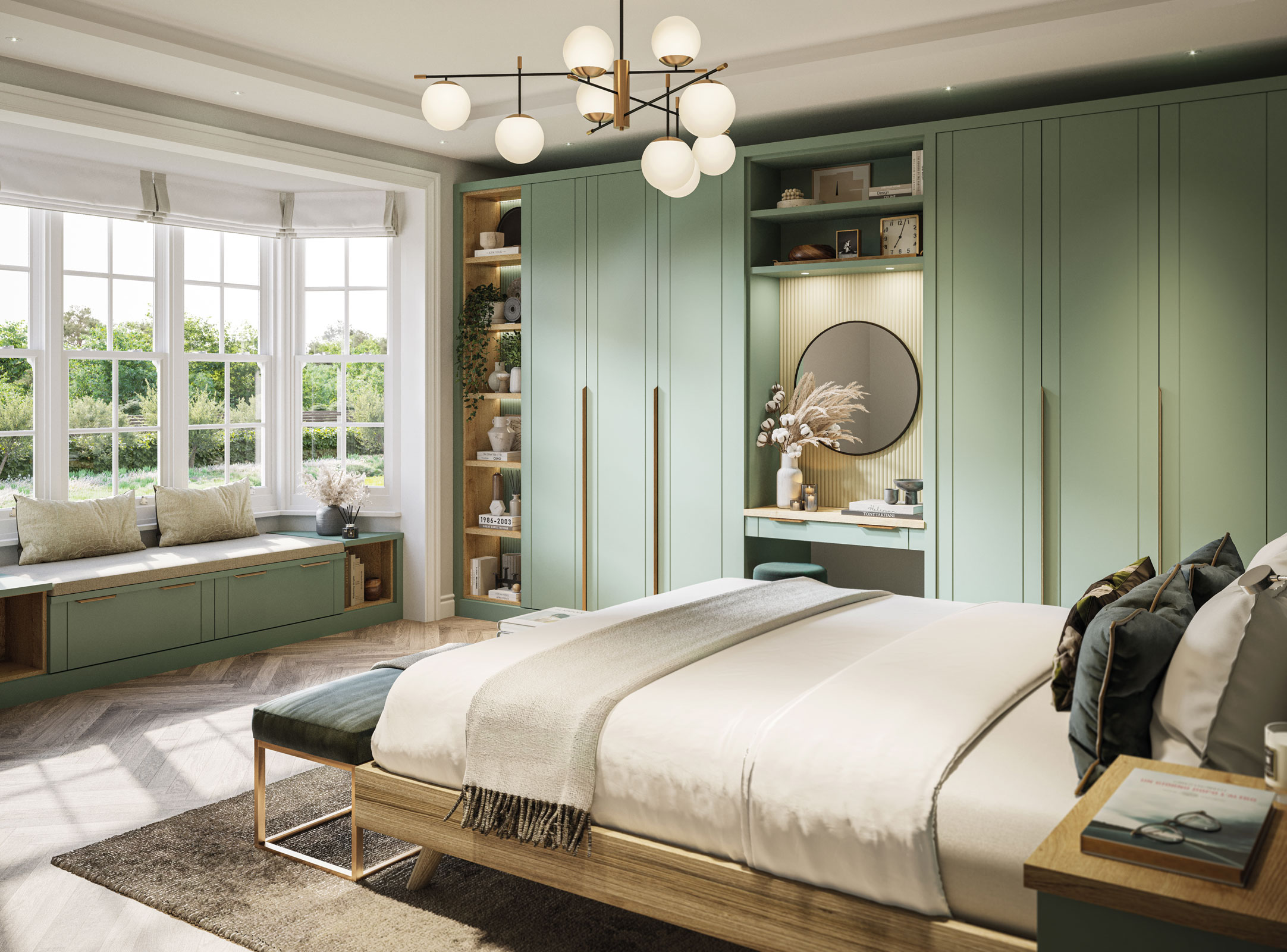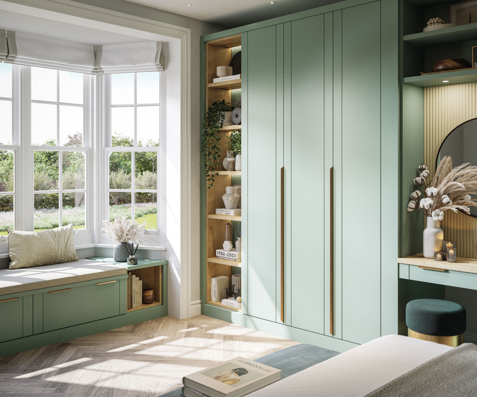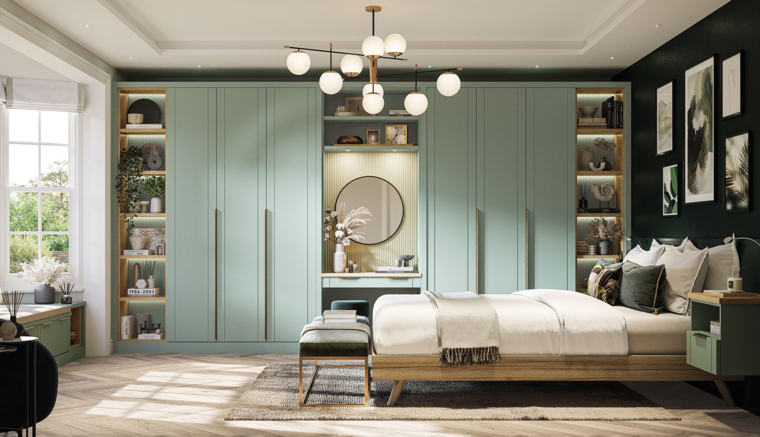 Indulge in the comfort of a bespoke bedroom, handcrafted exactly for your space. This extra tall wardrobe solution sets the tone for an organised space, eliminating any hint of clutter. Our exclusive Romero door creates a modern and sleek design, and painted in the calming shade of Celadon. A perfect example of how functional bedroom storage can exude luxury and sophistication for a truly restful space.