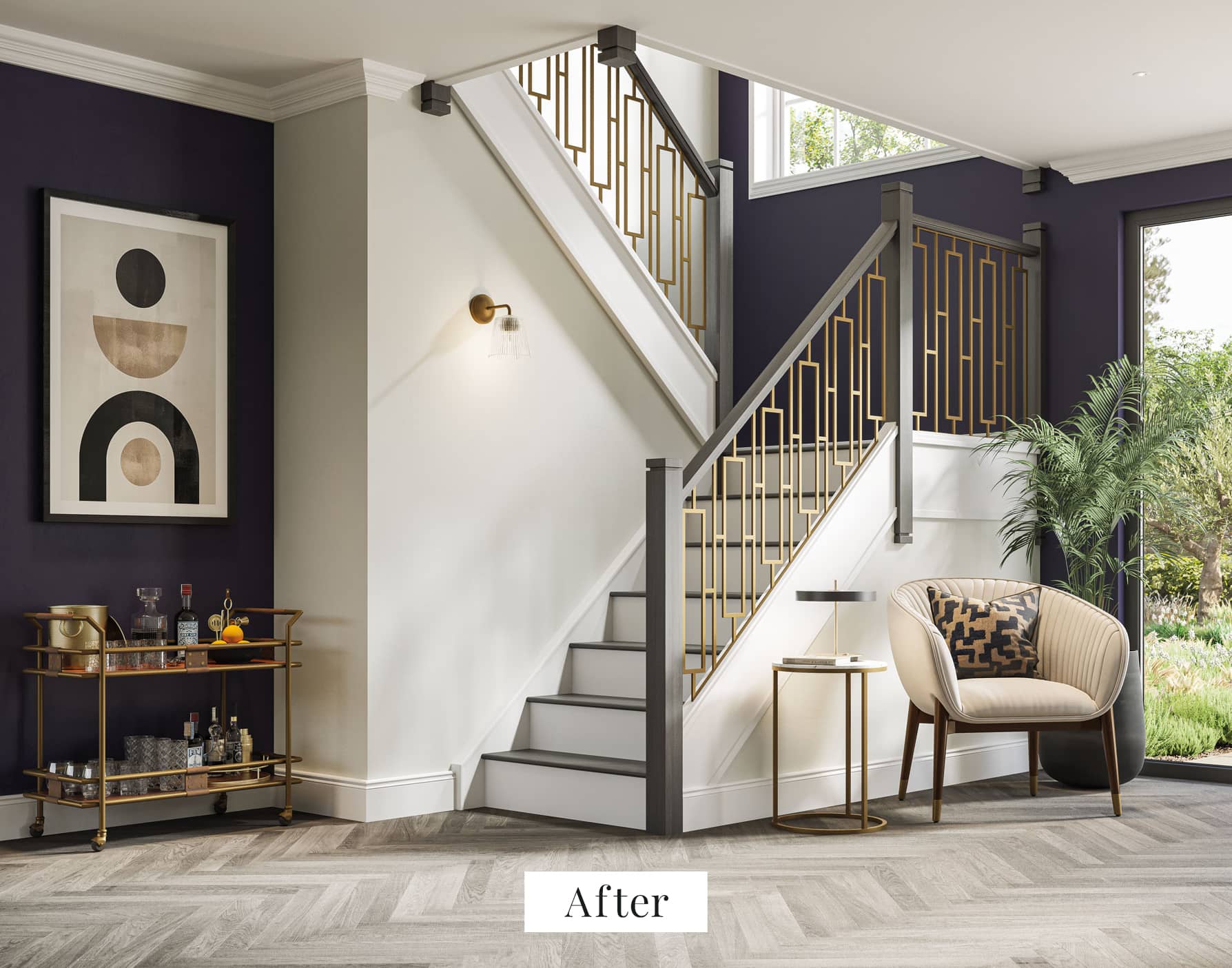 Influenced by Art Deco opulence, this stunning staircase features our exclusive steel design, Basso. Finished in brushed gold and paired against Smoked Oak newel posts, handrail and treads, our expert designer has created a staircase with fabulous contrasting components. With risers painted in our crisp white colour ‘Sorrel’, the final renovation has completely transformed this hallway into the statement piece of the property.